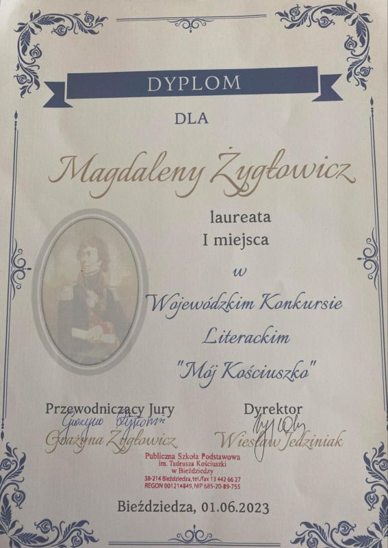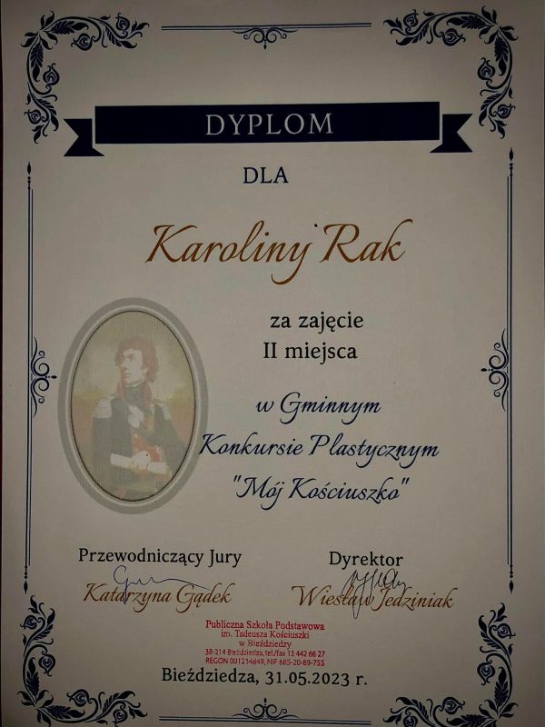 31 maja w Publicznej Szkole Podstawowej w Bieździedzy został rozstrzygnięty II Gminny Konkurs Plastyczny „Mój Kościuszko” odbywający się pod honorowym patronatem Burmistrza Kołaczyc. Jury konkursu podkreśliło wysoki poziom nadesłanych prac. Wśród nagrodzonych są uczniowie naszej szkoły. I miejsce w kategorii klas IV-VI zdobył Oskar Nocek.