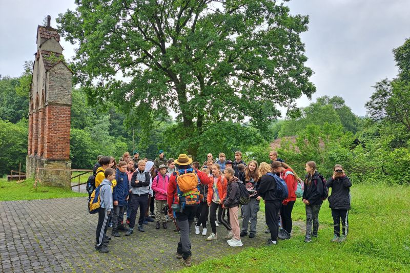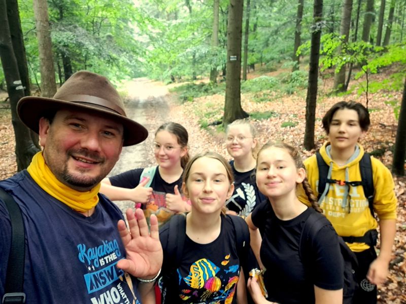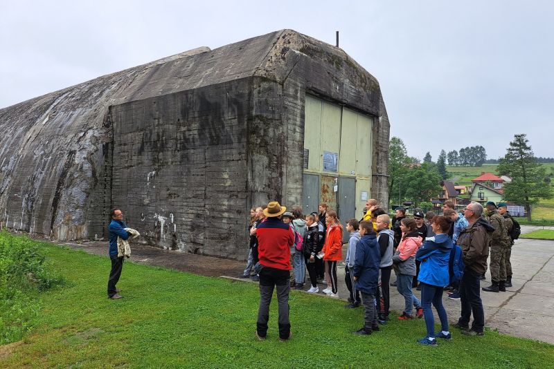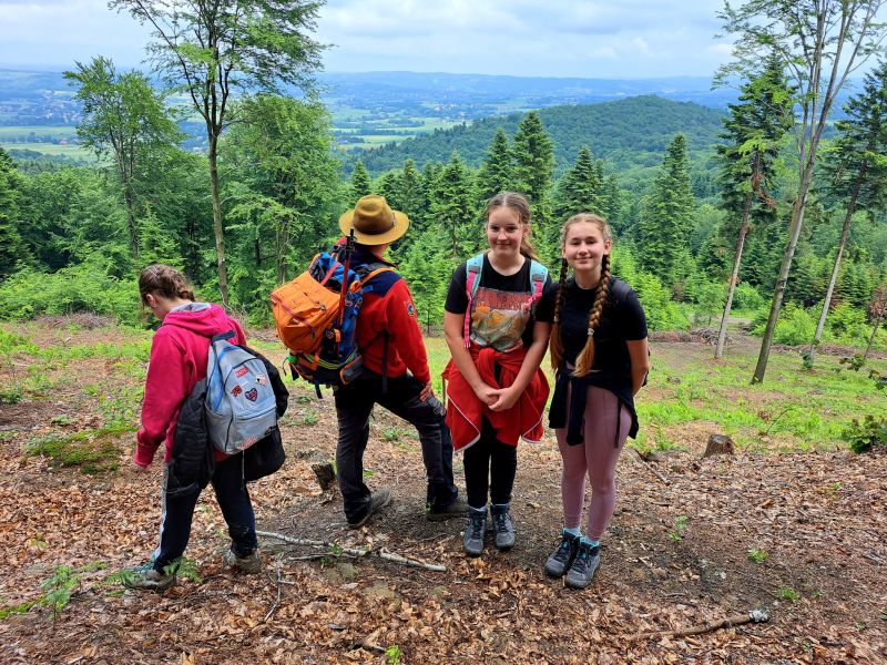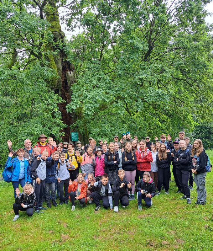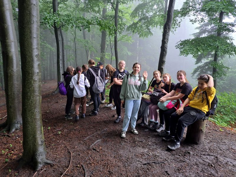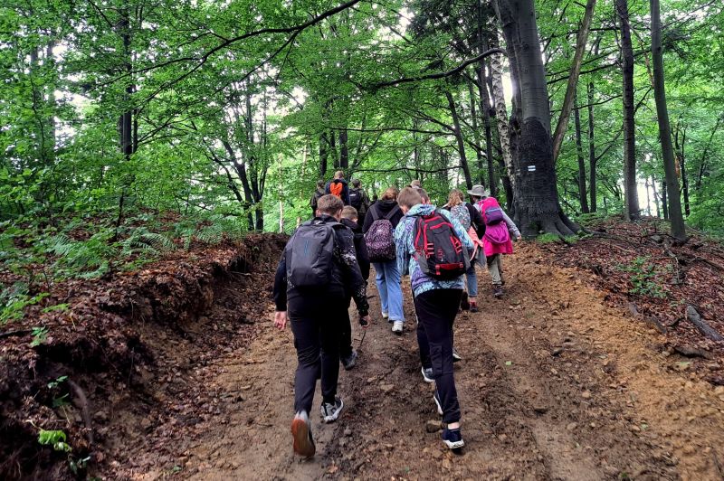 W środę 14 czerwca członkowie Szkolnego Koła Turystycznego PTTK "Liwocz" działającego przy PSP w Kołaczycach wraz z opiekunami wyruszyło autokarem na kolejną wycieczkę turystyczno-krajoznawczą. Tegoroczny Wiosenny Rajd SKT PTTK wiódł z Rzepnika przez rezerwat "Herby" do Wiśniowej. W czasie wyjazdu zwiedziliśmy również Schron Kolejowy w Stępinie oraz Zespół Parkowo-Dworski i Folwarczny w Wiśniowej. Pierwszym punktem naszej wycieczki było zwiedzenie niezwykłego obiektu wojskowego wybudowanego w naszej okolicy, jakim jest Schron Kolejowy w Stępinie. Od miejscowego przewodnika usłyszeliśmy ciekawą historię związaną z obiektem, m.in. dowiedzieliśmy się o spotkaniu w tym miejscu Hitlera z Mussolinim, o przeznaczeniu tego obiektu oraz co znajdowało się w nim po zakończeniu II wojny światowej. Następnie dotarliśmy do Rzepnika, gdzie obok dawnej grekokatolickiej cerkwi pw. św. Paraskewy mogliśmy podziwiać liczący ponad 500 lat Dąb Jagiellon. Stamtąd wyruszyliśmy na szlak przy okazji zbierając rosnące przy szlaku grzyby. Trasa liczyła około 14 km. Po drodze mogliśmy podziwiać skalne ostańce w utworzonym dla ich ochrony rezerwacie "Herby". Wielu z nas dużą frajdę sprawiło przejście po zawieszonej nad Wisłokiem kołyszącej się kładce w Jazowej. Ostatnim punktem naszego programu była Wiśniowa, która po mglistym i dżdżystym dniu powitała nas popołudniowym słońcem. Tam w Powiatowym Centrum Kultury i Turystyki zakończyliśmy nasz rajd wspólnym pieczeniem kiełbasek na ognisku. Na koniec nasz przewodnik pokazał nam jeszcze Dąb "Józef" - Europejskie Drzewo Roku 2017 i opowiedział ciekawą historię z nim związaną. Mamy nadzieję, że to nie ostatni nasz wspólny wypad w góry. Wszystkich uczniów zachęcamy do wstąpienia w szeregi SKT PTTK "Liwocz". Hej! Ku górom!!!