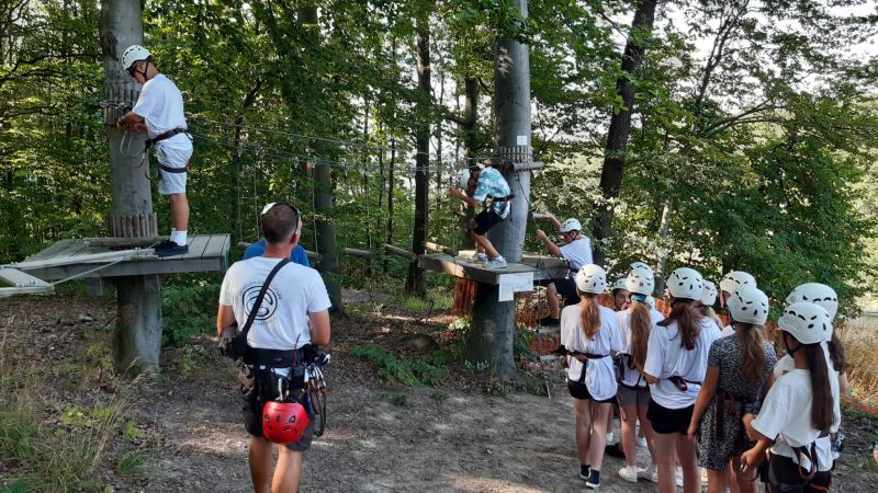 Kolejny dzień zapowiadał wiele wrażeń. W sobotę po śniadaniu udaliśmy się do kąpieliska w Sarospatak. Piękna, słoneczna pogoda pozwoliła na kąpiel i zabawy w wodzie. Po obiedzie młodzież wraz z opiekunami przemieściła się do Parku Przygód Zemplen w miejscowości Satoraljaujhely. Tam czekały atrakcje w Parku Linowym oraz zjazdy na bobslejach.