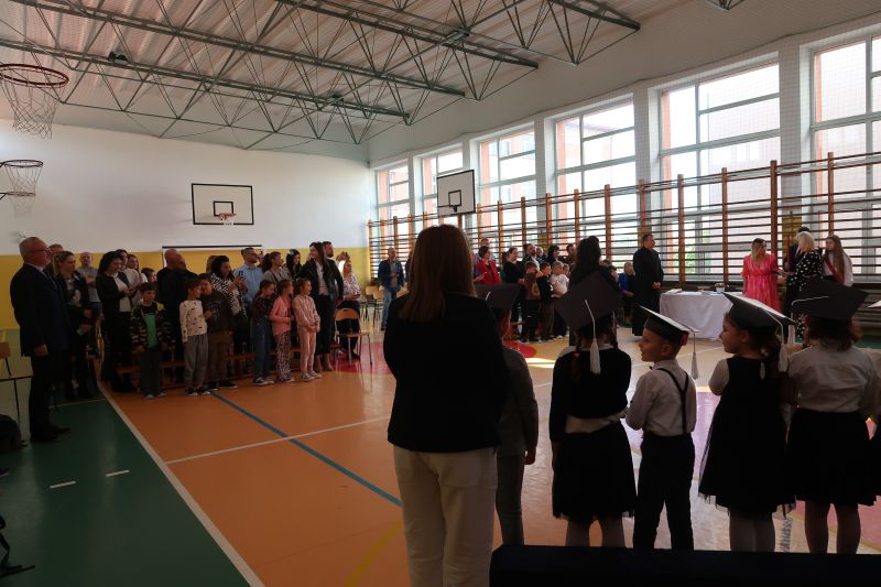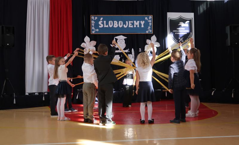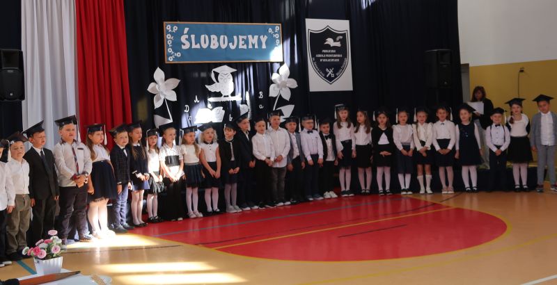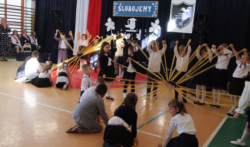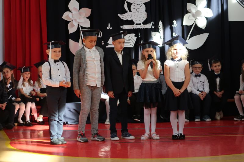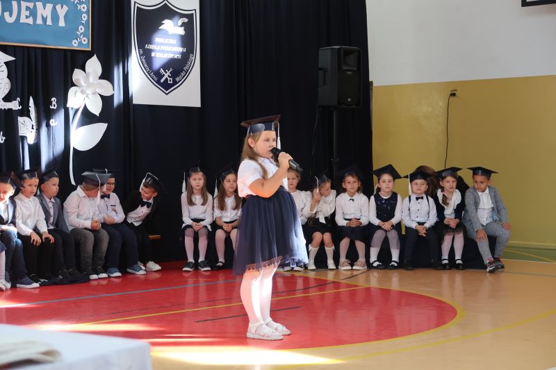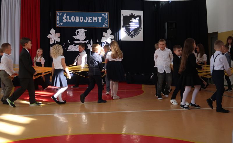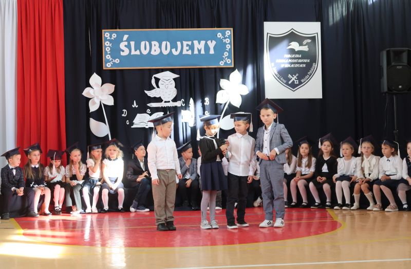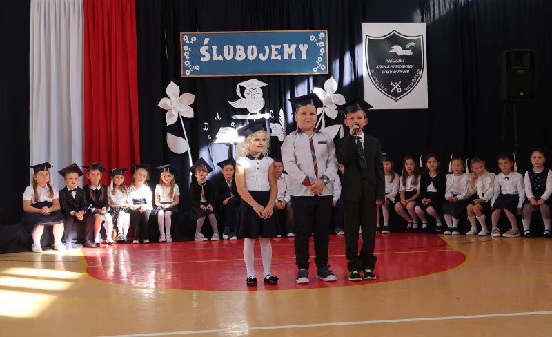 Pierwszym punktem wydarzenia było zaprezentowanie przez dzieci swoich umiejętności, aby zostać przyjętym do grona szkolnego. Uczniowie wspólnie recytowali wiersz Władysława Bełzy pt. „ Kto ty jesteś? - Polak mały”.