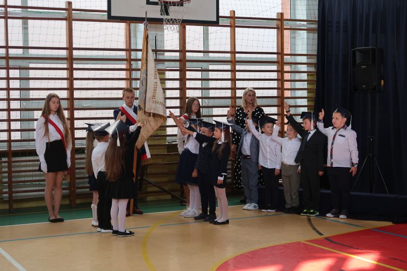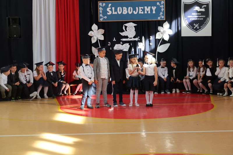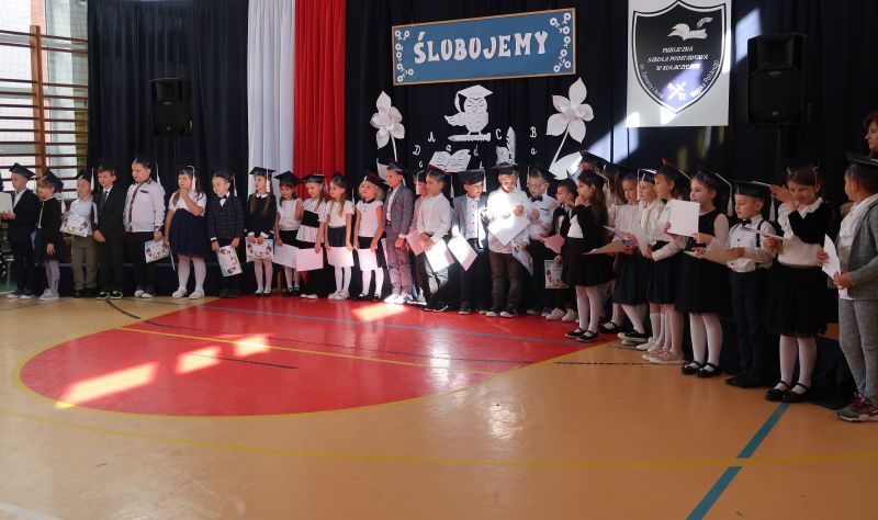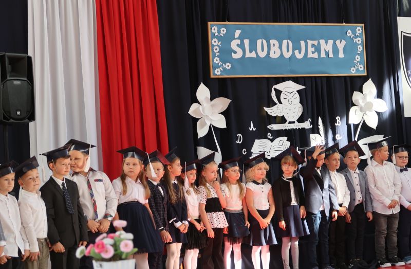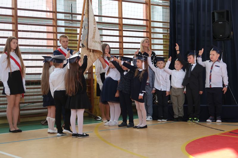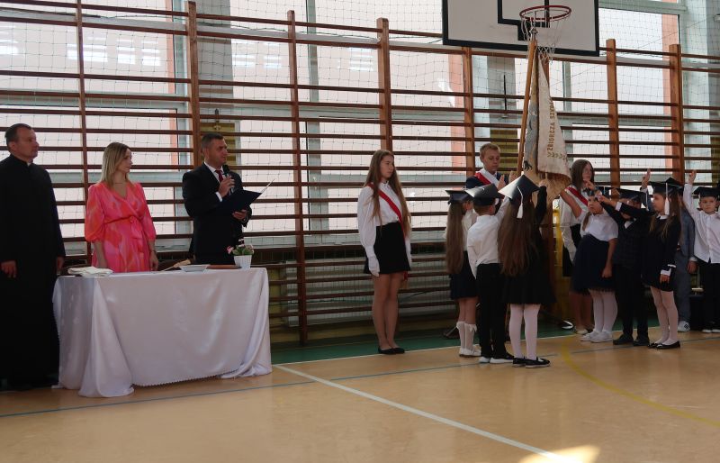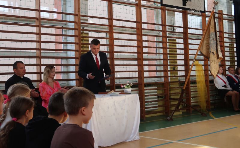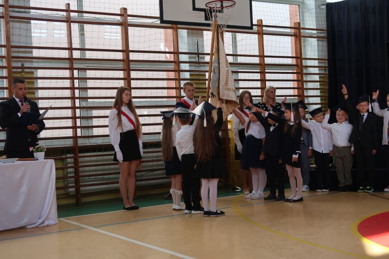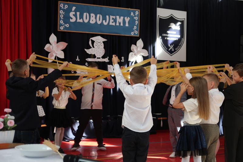 Następnie podczas ceremonii pierwszoklasiści ślubowali sumiennie wykonywać swoje obowiązki, a poprzez swoje zachowanie oraz naukę być przykładem dla innych. Po złożeniu ślubowania Pan Dyrektor pasował każde dziecko na ucznia.