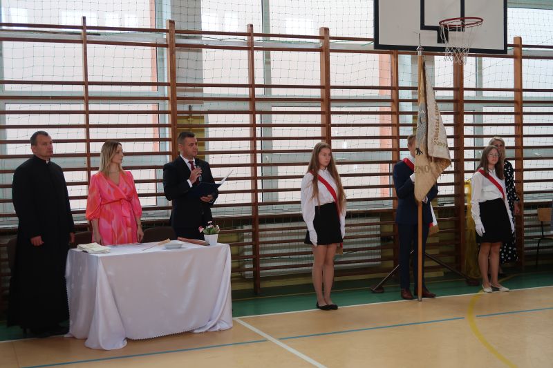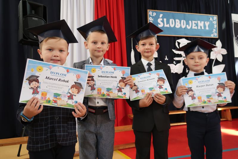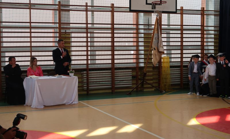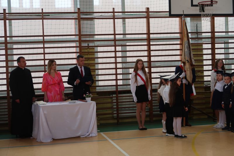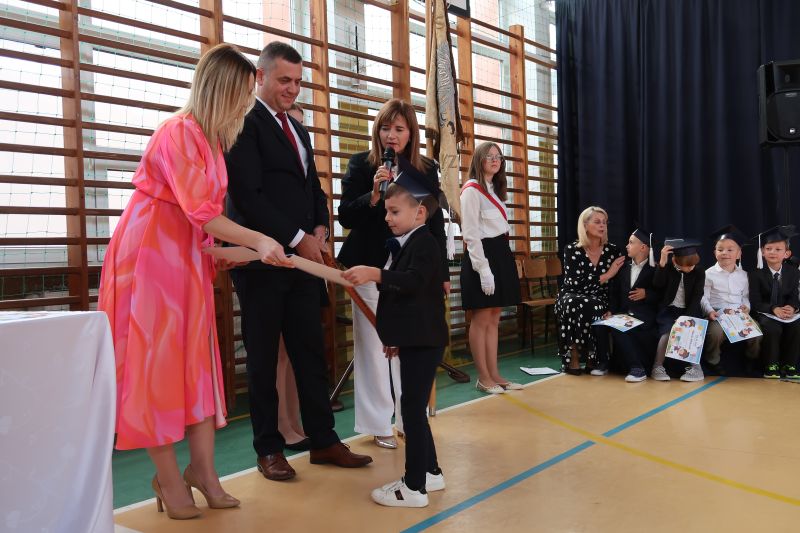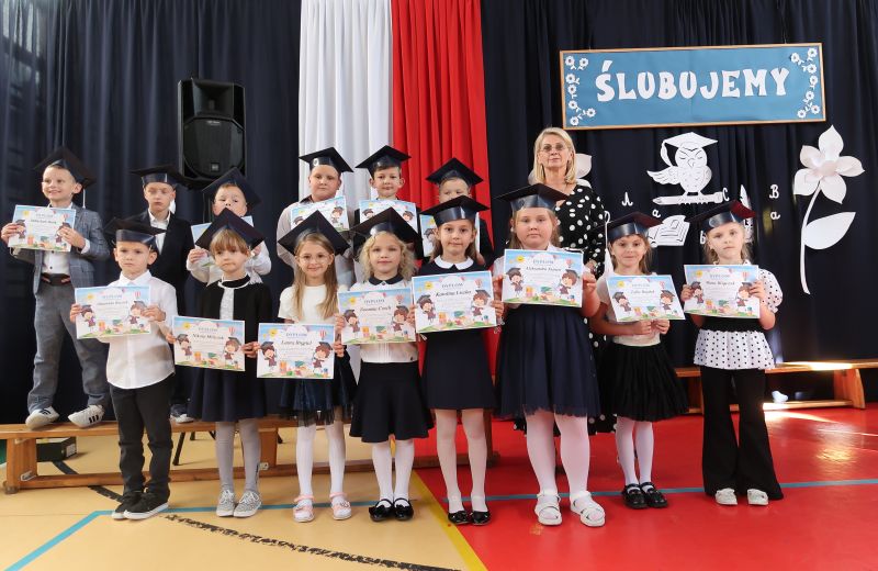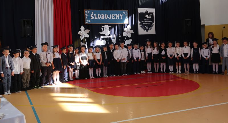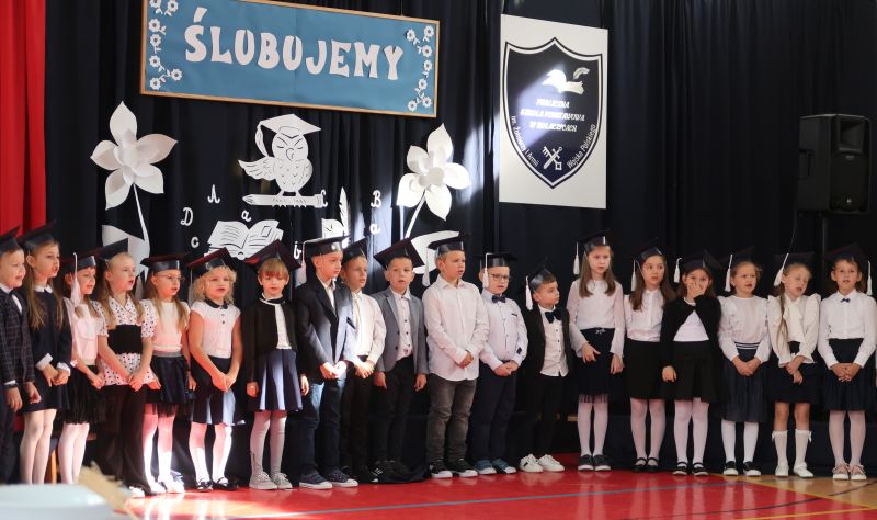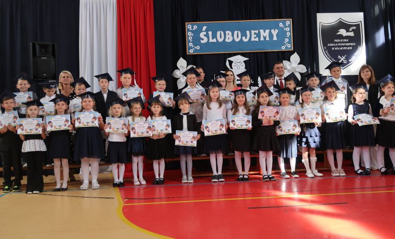 Następnie podczas ceremonii pierwszoklasiści ślubowali sumiennie wykonywać swoje obowiązki, a poprzez swoje zachowanie oraz naukę być przykładem dla innych. Po złożeniu ślubowania Pan Dyrektor pasował każde dziecko na ucznia.