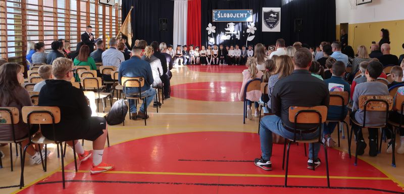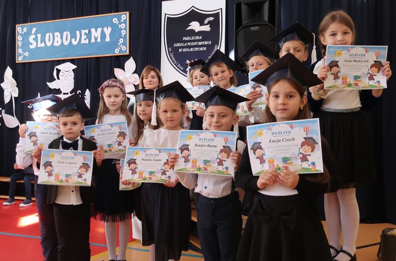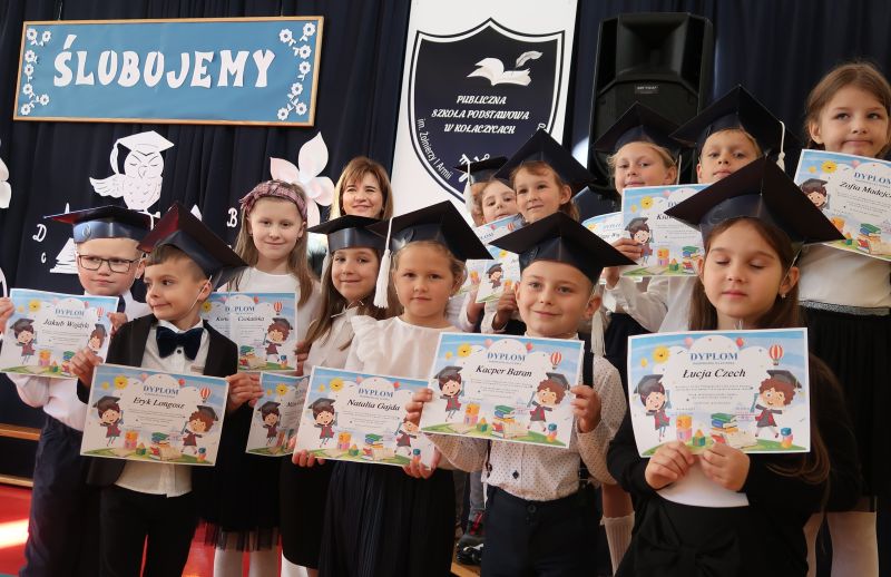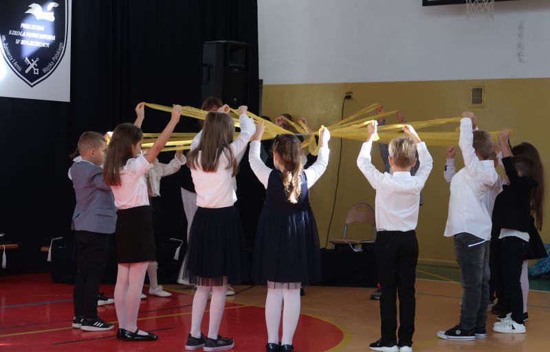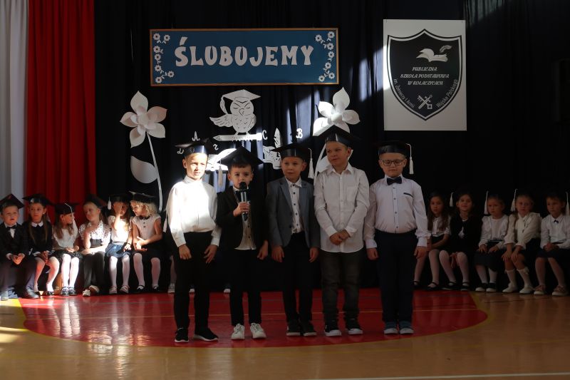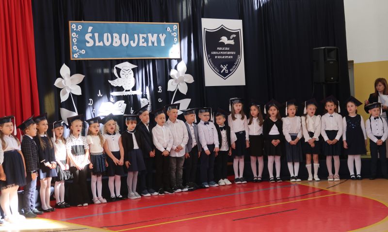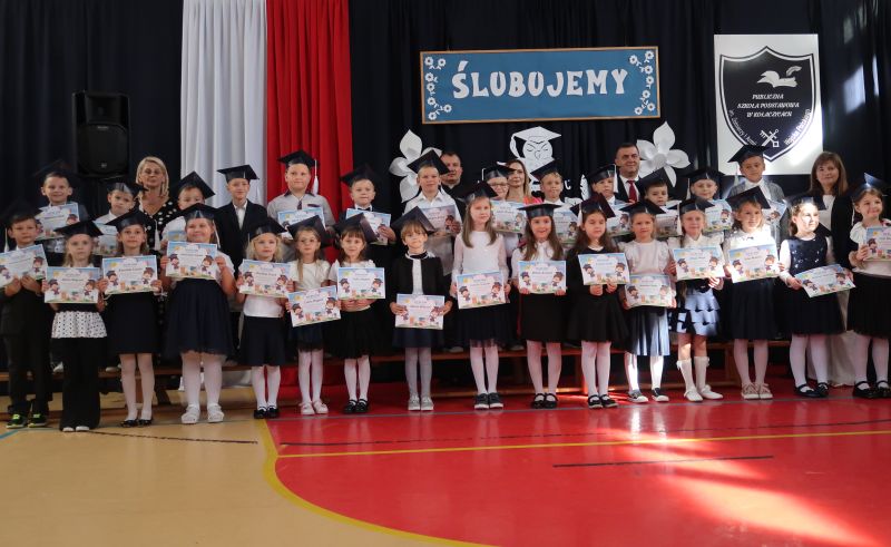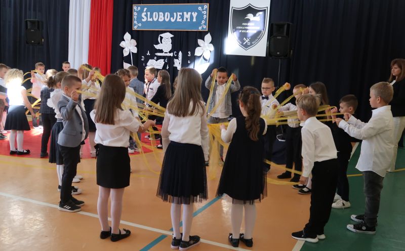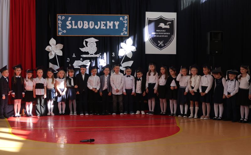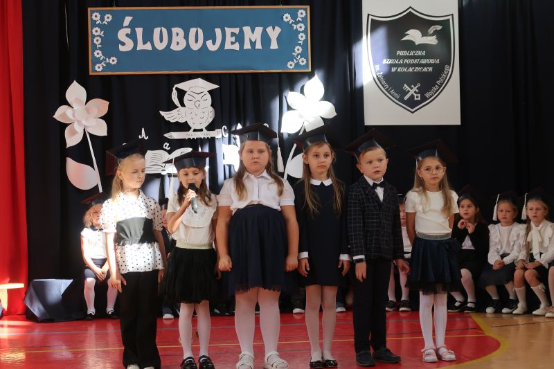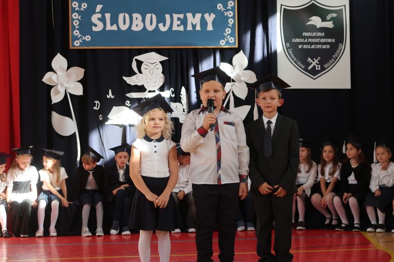 Dnia 12.10.2023 r. w Szkole Podstawowej w Kołaczycach odbyło się uroczyste ślubowanie uczniów klas pierwszych. Uroczystości rozpoczęły się wprowadzeniem pocztu sztandarowego i przywitaniem wszystkich uczniów, rodziców i wychowawców przez Pana Dyrektora Adama Iwanickiego.