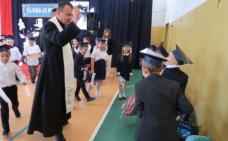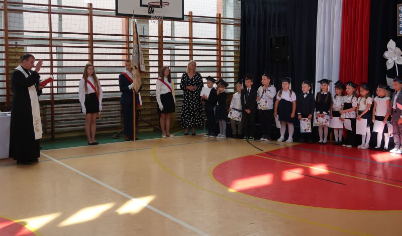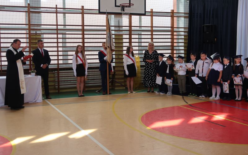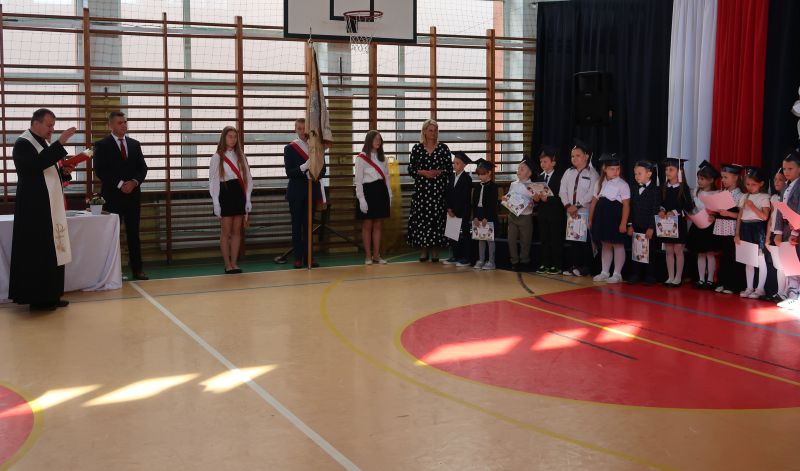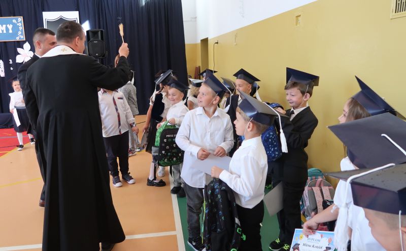Kolejnym punktem było uroczyste poświęcenie plecaków z podręcznikami i przyborami szkolny przez księdza proboszcza Grzegorza Siciaka.