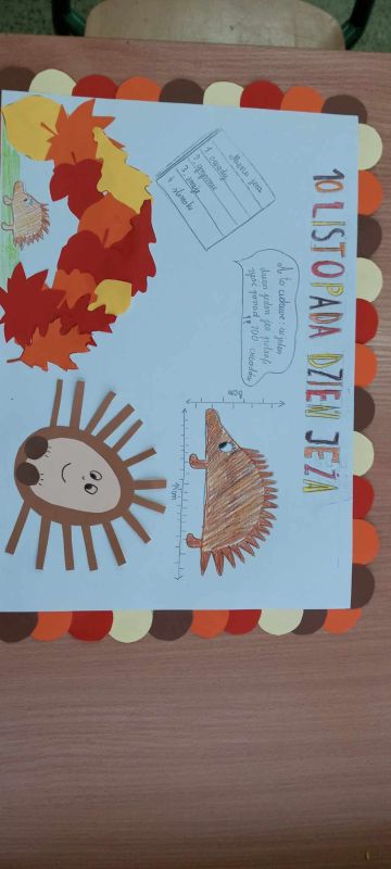 Dzisiaj 10 listopada- Dzień jeża. Podczas zajęć świetlicowych oglądaliśmy film edukacyjny, dowiedzieliśmy się wielu ciekawych rzeczy o tych pożytecznych zwierzętach. Nasze świetliczaki wykonały piękny plakat, rysunki i wycinanki z jeżami.