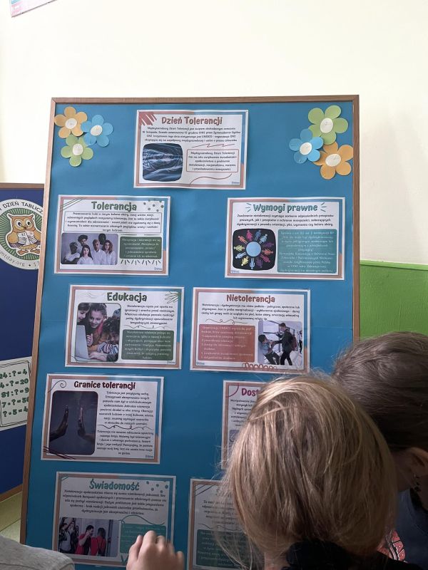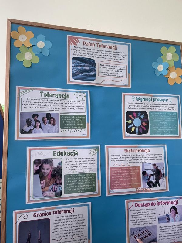 W naszej szkole 16 listopada 2023 roku odbyła się akcja informacyjna na temat Tolerancji i braku jej przestrzegania. Zostały również przeprowadzone warsztaty klasowe przez psychologa i pedagoga szkolnego. Uczniowie mieli możliwość zapoznania się z gazetką mówiącą o potrzebie otwartości i tolerancji, chętnie uczestniczyli w zajęciach związanych z tym tematem. Dzień ten stał się okazją do refleksji nad własną postawą w odniesieniu do innych osób. Celem inicjatywy było kształtowanie postaw tolerancji, szacunku i empatii.