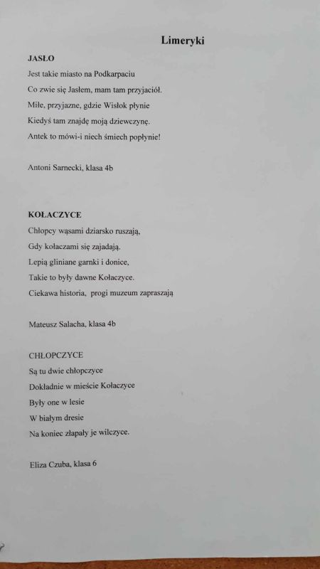 W tym dniu również został rozstrzygnięty konkurs na limeryk związany z naszym regionem, który był adresowany do uczniów klas IV-VIII. Celem konkursu było: promowanie czytelnictwa oraz sztuki żywego słowa ,zachęcenie do poszukiwania inspiracji w literaturze pięknej, pobudzanie postaw twórczych wobec literatury pięknej, uwrażliwienie na bogactwo języka ojczystego. Na konkurs wpłynęło pięć utworów . Jury przyznało I, II i III miejsce oraz wyróżnienie.