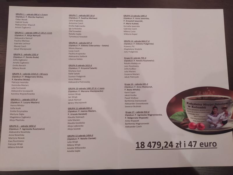 Kolędnicy nie zważając na pogodę i zmęczenie podjęli się trudu kolędowania. Ich ofiarność połączona z DARAMI SERCA ODWIEDZANYCH RODZIN zaowocowała zebraną kwotą w wysokości 18 479, 24 zł i 47 euro, „sklepowymi” ilościami słodyczy i kolejnymi chętnymi do kolędowania misyjnego za rok.