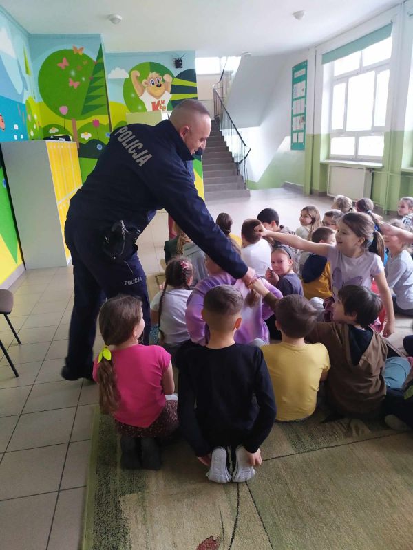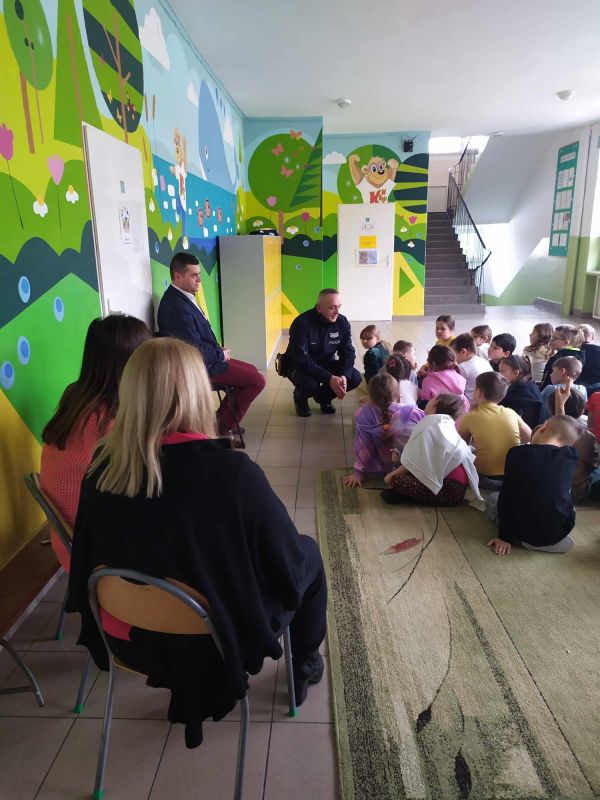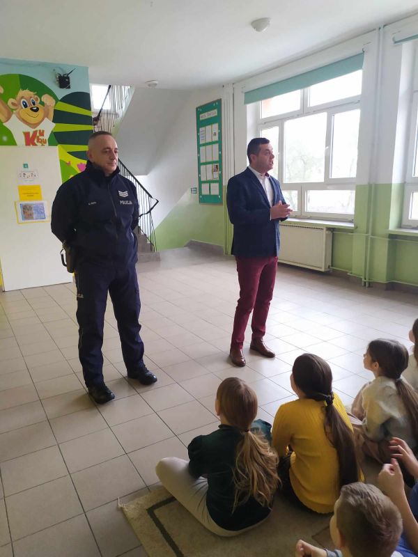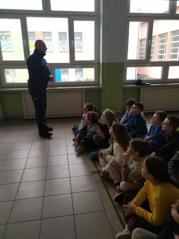 W ramach edukacji w tym kierunku, 18.01.2024 r. uczniowie klasy I,II i III uczestniczyli w spotkaniu z policjantem. Dzieci miały okazję porozmawiać o zachowaniu bezpieczeństwa w drodze do szkoły i poza szkołą. Policjant omówił zasady bezpieczeństwa podczas uprawiania sportów zimowych. Poruszył problem lodowisk na stawach i rzece oraz jazdy na sankach przy drogach.