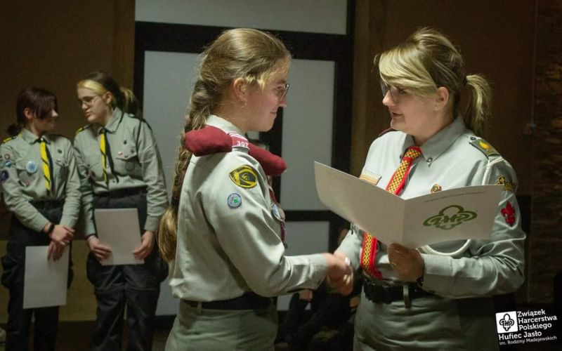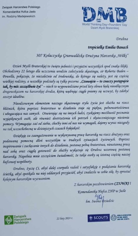 Jak co roku świętowanie Dnia Myśli Braterskiej harcerze i harcerze starsi rozpoczęli od gry terenowej. Podczas której ich zadaniem było zdobycie receptury na miksturę prawdziwej przyjaźni. Harcerze poruszając się po mieście znajdowali jej składniki. Poznając przy tym kolejnych bohaterów z baśniowej Krainy Lodu. Po zebraniu całej listy składników, wszyscy zebrali się na wspólnym świeczkowisku. Punktem kulminacyjnym była scena pojednania zwaśnionych sióstr. Na zakończenie uroczystości zostały wręczone listy gratulacyjne od druhny Komendantki dla najbardziej zasłużonych harcerzy z każdego środowiska z naszej drużyny listy gratulacyjnego otrzymały: druhna tropicielka Emilia Banach i druhna tropicielka Patrycja Iwanicka. Gratulujemy każdemu z osobna i mamy nadzieję, że za rok spotkamy się w jeszcze liczniejszym gronie.