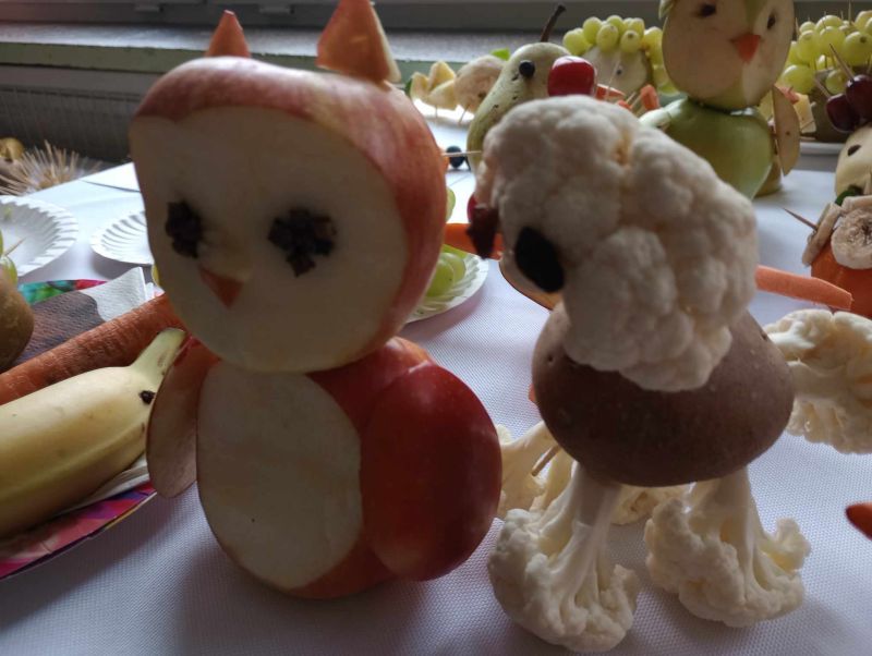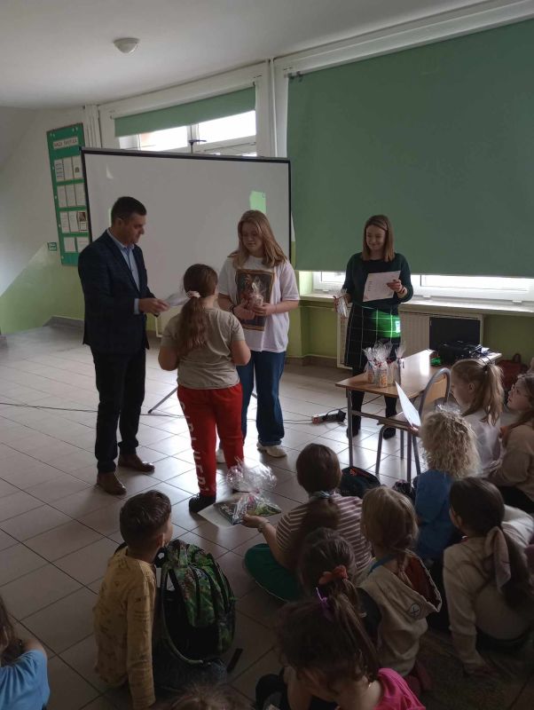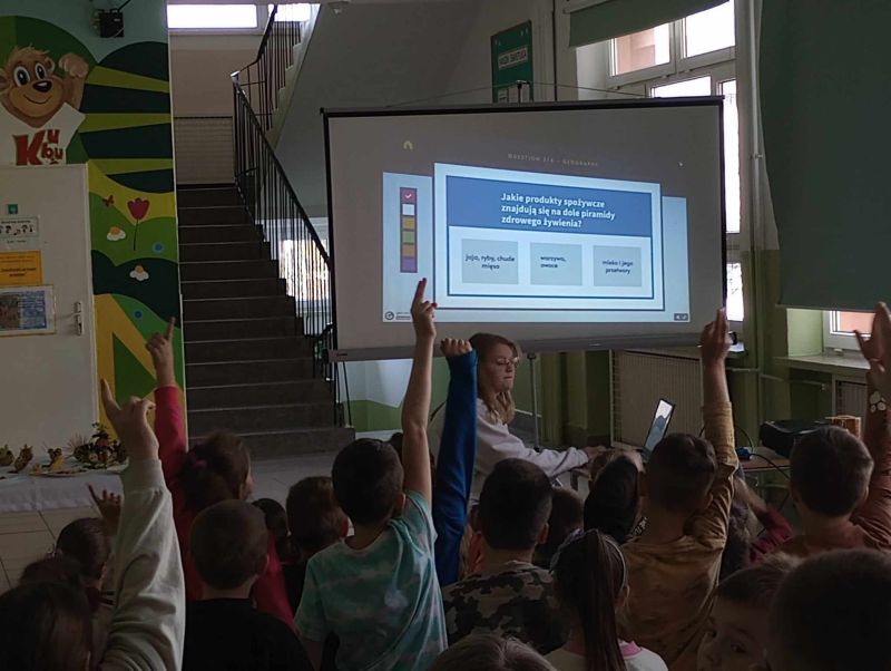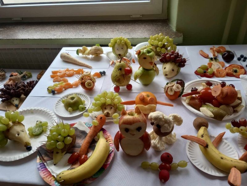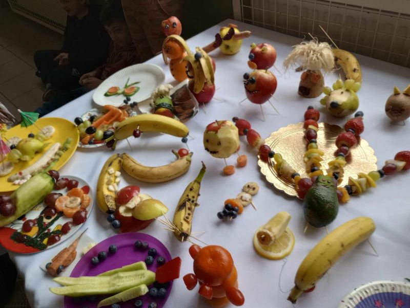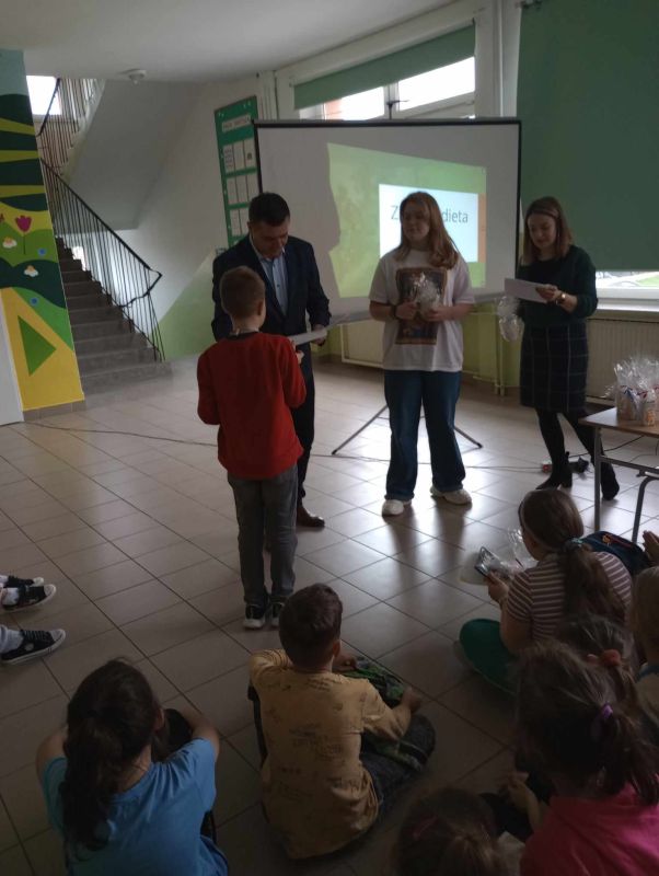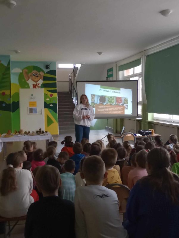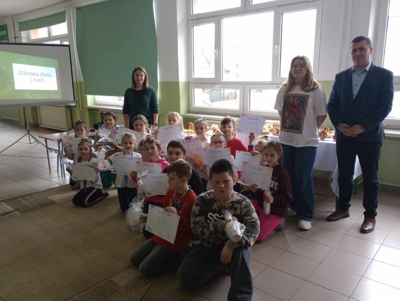 18 marca 2024 roku uczennica klasy VII b Zofia Żygłowicz przeprowadziła akcję prozdrowotną "Zdrowa dieta i ruch" dla uczniów klas I-III. Poprowadziła prelekcję na temat zasad zdrowego odżywiania i zdrowego stylu życia. Zosia omówiła piramidę żywienia, przekazując uczniom wskazówki z zakresu zdrowego odżywiania. Interesująca pogadanka połączona z prezentacją multimedialną stanowiły ciekawy element spotkania. Omówione zostały główne błędy w naszej diecie, które prowadzą do nadwagi i otyłości. Uczniowie dowiedzieli się, jak ważną rolę w naszym jadłospisie odgrywają dobrze skomponowane śniadanie, obiad i kolacja. Jak dużą wartość dla naszego organizmu ma woda i ile powinniśmy jej pić oraz jak ważną sprawą jest łączenie zdrowego odżywiania z aktywnością sportową. Dzieci uzyskały informacje na temat produktów jakich powinny unikać lub je ograniczyć, aby długo cieszyć się dobrym zdrowiem. Dodatkowo został zorganizowany konkurs "Owocowe czary- mary" dla uczniów klas I-III. Zadaniem uczestników konkursu było przygotowanie kompozycji przestrzennej z warzyw i owoców. Wszystkie prace były piękne i pomysłowe. Zwycięzcy otrzymali nagrody rzeczowe oraz dyplomy.
