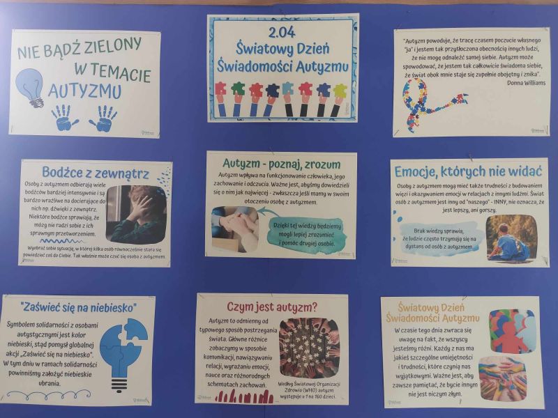 2 kwietnia na całym świecie organizowane są obchody Światowego Dnia Świadomości Autyzmu. Kampania ta trwa przez cały miesiąc kwiecień i ma na celu propagowanie wiedzy na jego temat oraz jest wyrazem akceptacji i solidarności z osobami ze spektrum autyzmu i ich rodzinami. W tym roku w naszej szkole zostały zorganizowane warsztaty dla uczniów z orzeczeniem o potrzebie kształcenia specjalnego. Solidaryzując się z osobami z autyzmem, uczniowie klas I-III przyszli ubrani w niebieskie stroje. Działania te były realizowane w ramach projektu „Każdy inny – wszyscy równi”, a także akcji zainicjowanej w naszym powiecie przez Fundację LATAWIEC @fundacja.latawiec#WspolnieNaNiebiesko.