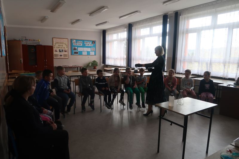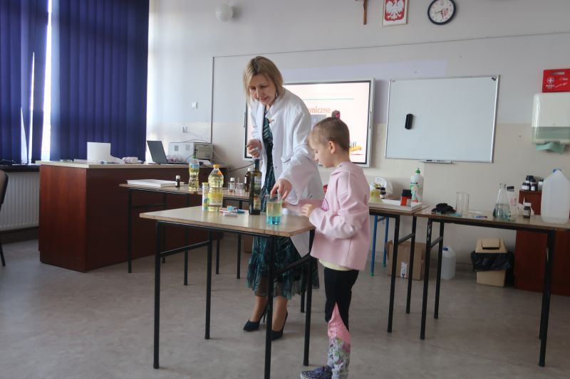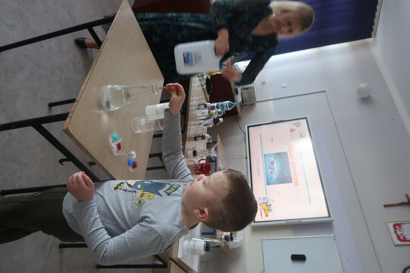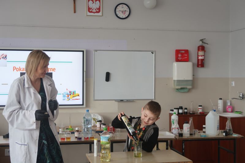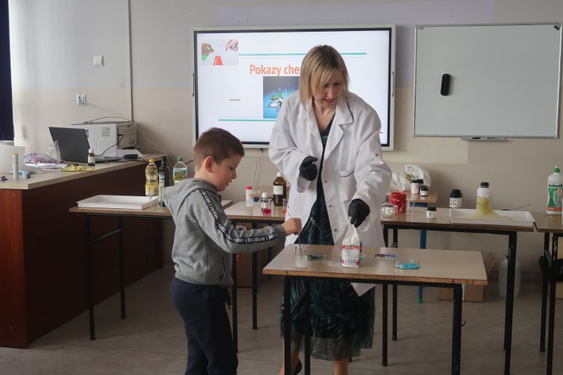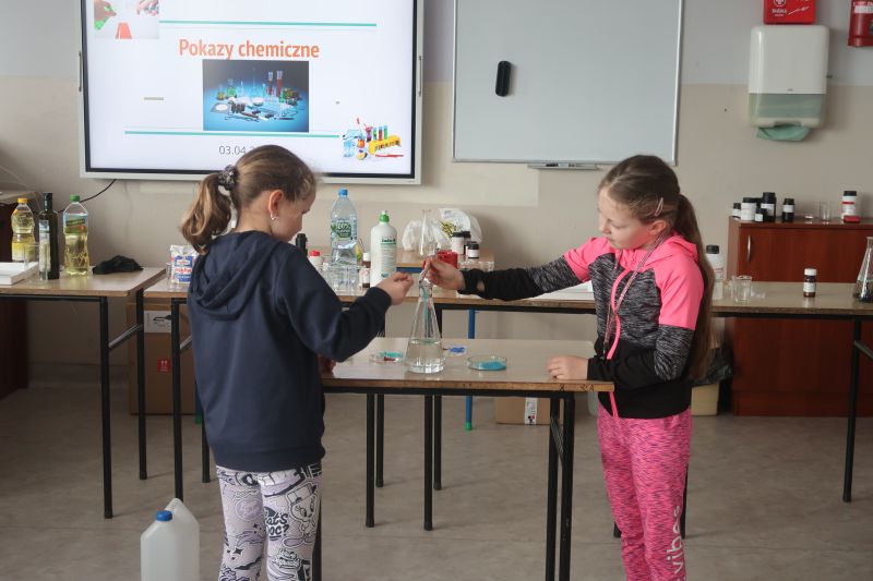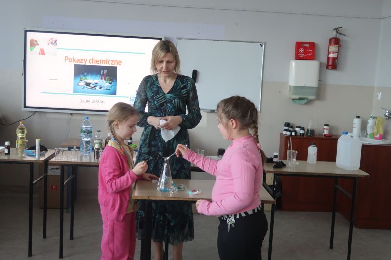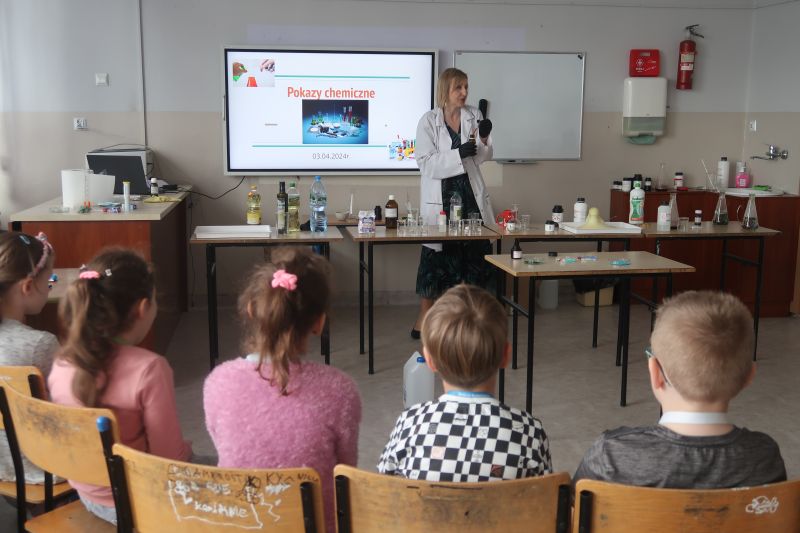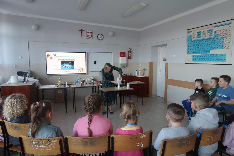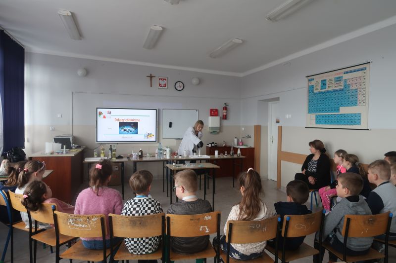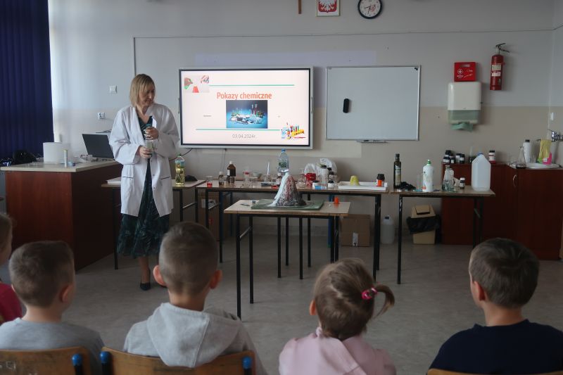 W dniu 5 kwietnia 2024 r. odbyły się pokazy chemiczne dla uczniów klas I-III szkoły podstawowej przygotowane przez nauczycielkę chemii p. Justynę Iwanicką. Wśród przeprowadzonych doświadczeń największym zainteresowaniem cieszyły się m.in.: ogrody chemiczne, chemiczny parowóz, pasta do mycia zębów dla słonia, zabawa z kolorami z wykorzystaniem różnych wskaźników chemicznych, lampa lawa, czy wulkan. Do pokazów wykorzystano wiele odczynników chemicznych, a także substancje znane uczniom z życia codziennego. Podczas pokazów nauczyciel angażował uczniów do pomocy przy wykonaniu doświadczeń.