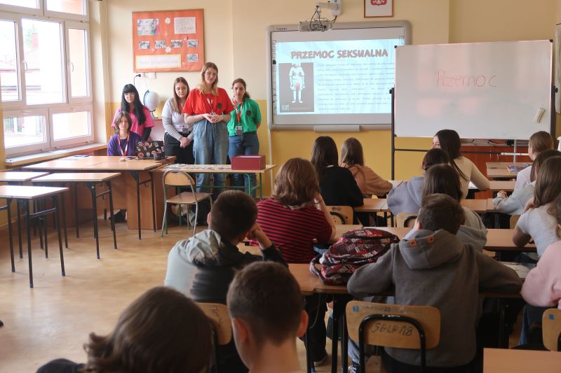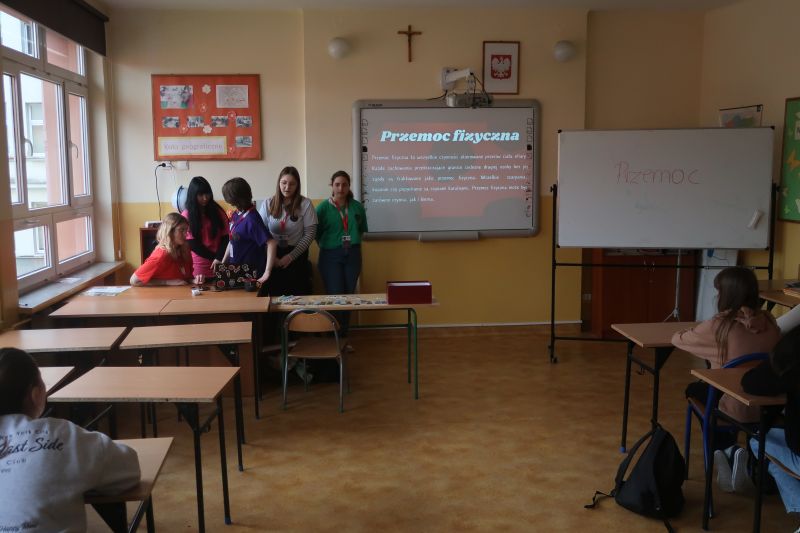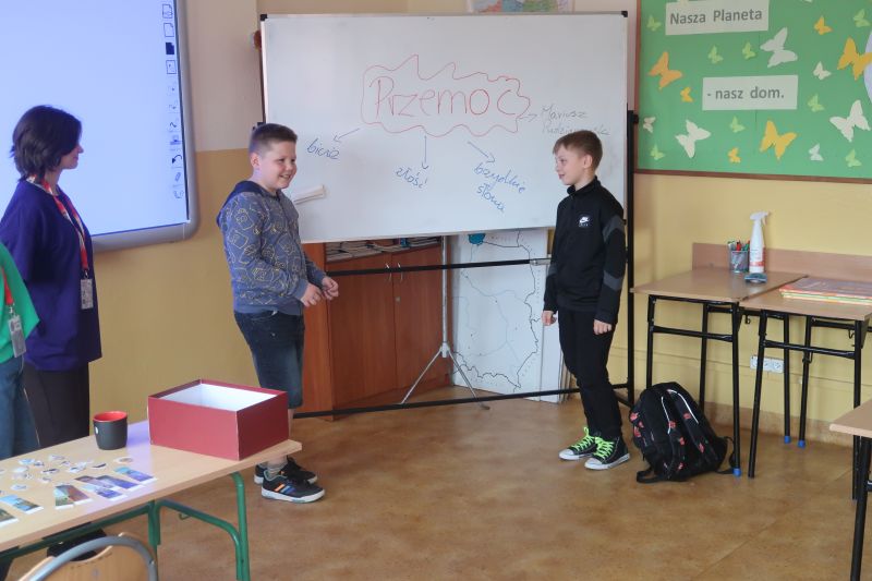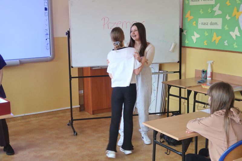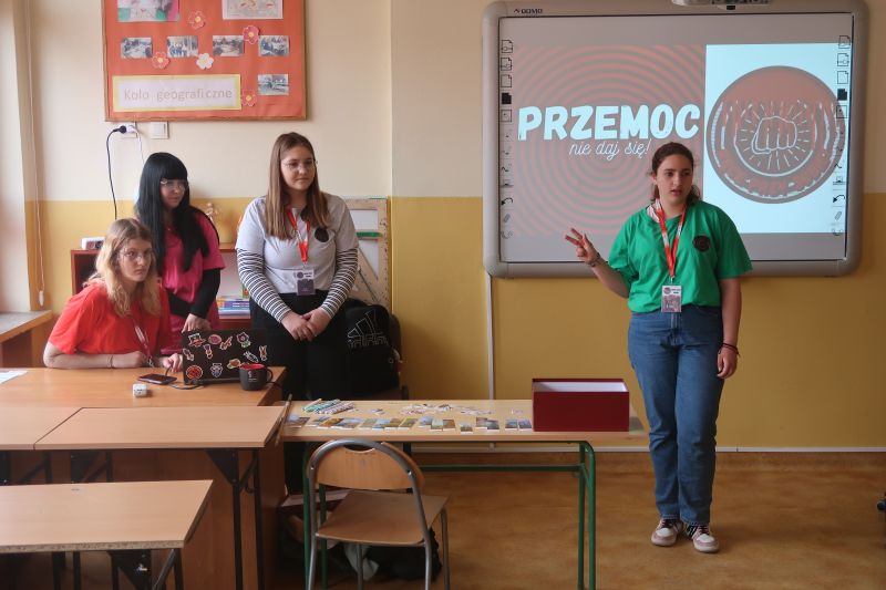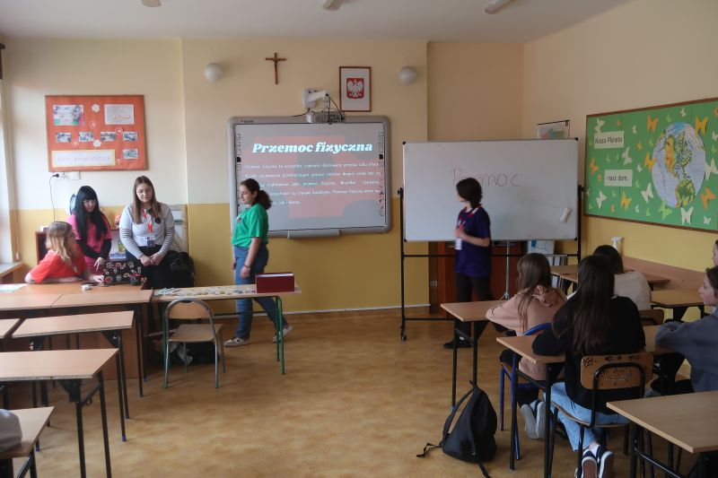 W środę 10 kwietnia br. pięć uczennic Liceum Ogólnokształcącego w Kołaczycach przeprowadziło w naszej szkole warsztaty dla uczniów klas 4-8 pod nazwą "PRZEMOC - nie daj się!". Celem warsztatów było poszerzenie wiedzy uczniów na temat szeroko rozumianej przemocy i zagrożeń z nią związanych. Na spotkaniu omówiono najczęściej występujące rodzaje przemocy. Uczniowie czynnie uczestniczyli w rozmowie na temat hejtu. Zapoznali się ze sposobami reagowania w trudnych sytuacjach, a także poznali istniejące instytucje oraz specjalistów działających na rzecz przeciwdziałania przemocy.