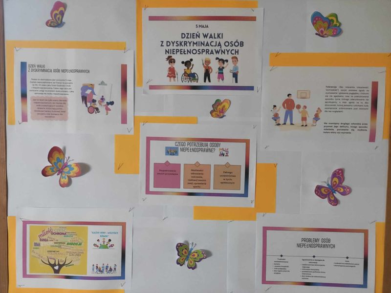 5 maja to Europejski Dzień Walki z Dyskryminacją Osób Niepełnosprawnych. Wyjątkowość tego święta polega, na okazaniu solidarności z osobami niepełnosprawnymi. Dzień ten zwraca szczególną uwagę na problem nierównego traktowania osób niepełnosprawnych, dlatego powinien skłonić do refleksji, przemyślenia i wsłuchania się w ich potrzeby związane z codziennym funkcjonowaniem oraz napotykanymi trudnościami. W naszej szkole odbyła się akcja informacyjna, która miała na celu przybliżenie społeczności szkolnej problemów osób z niepełnosprawnością oraz upowszechnianie idei tolerancji, otwartości i szacunku dla inności.