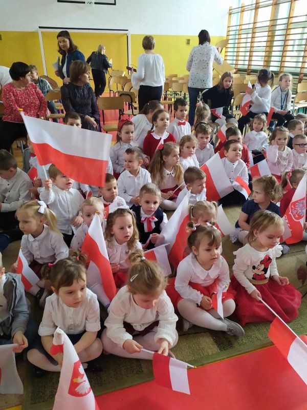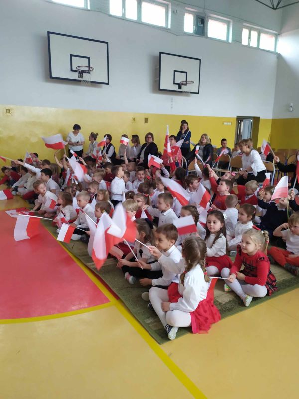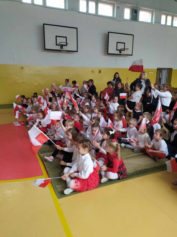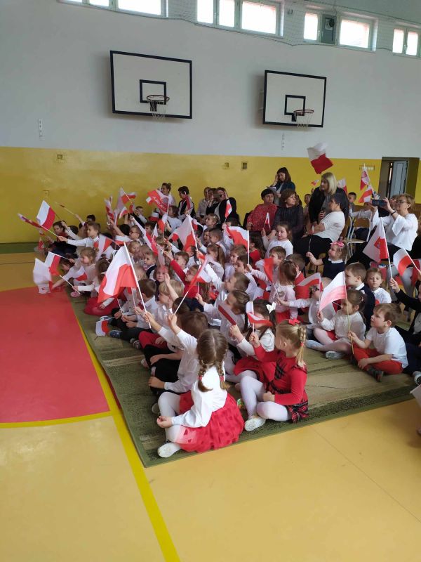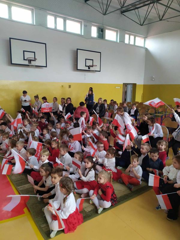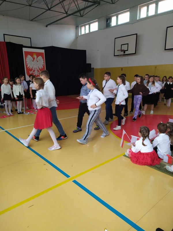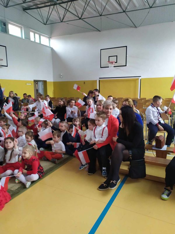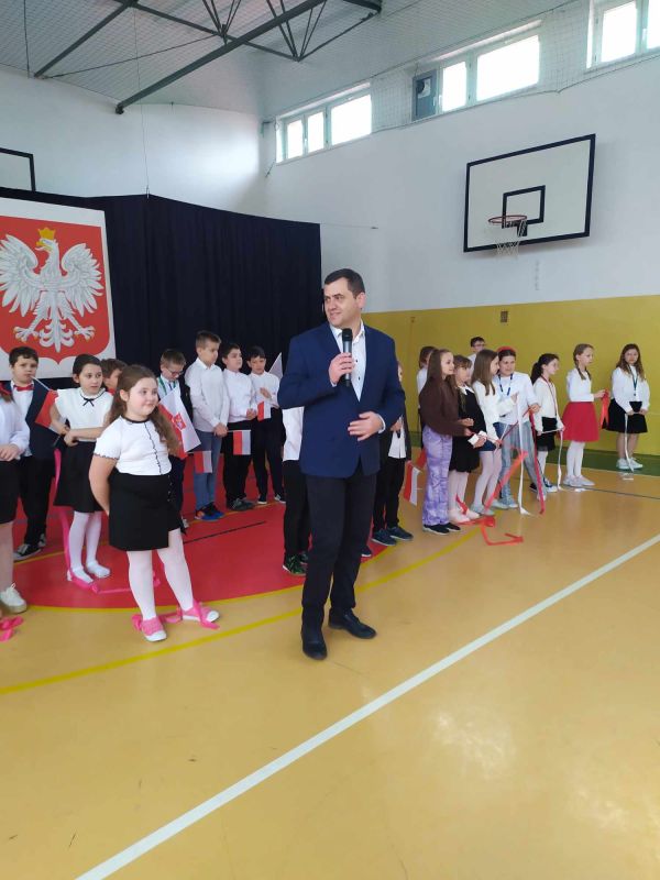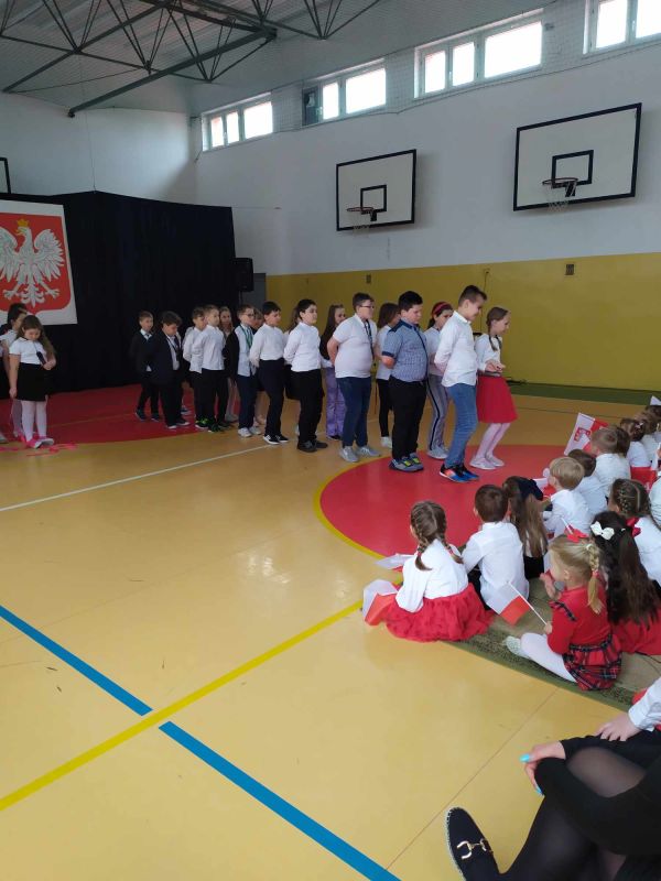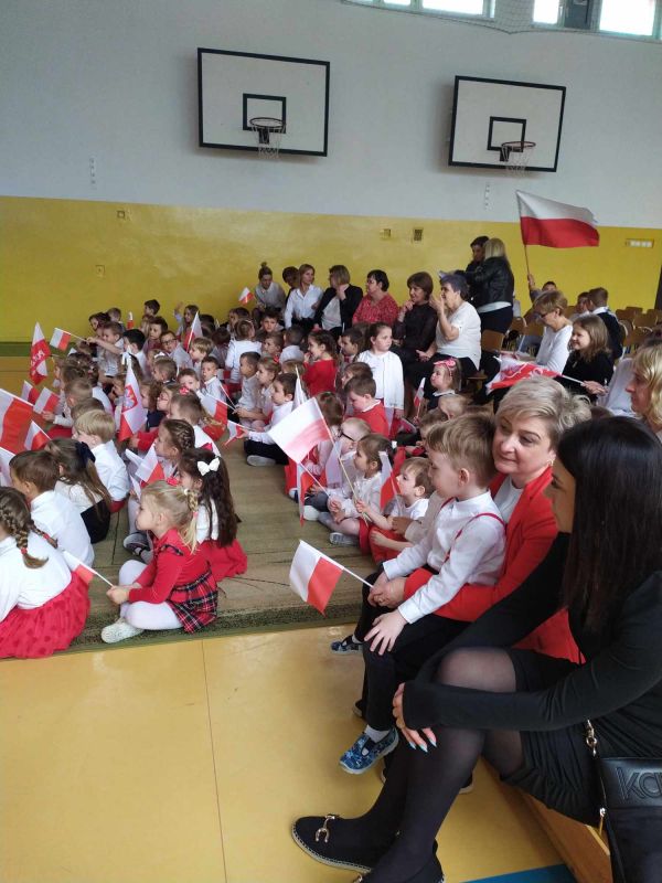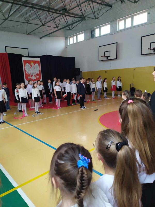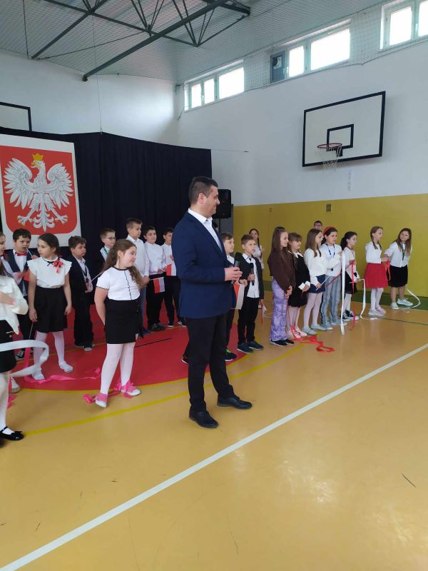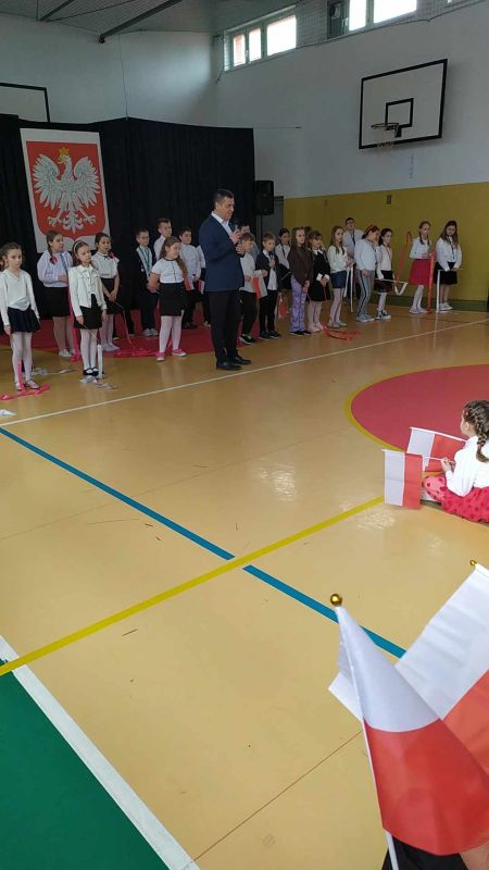 Uczniów i gości z przedszkola powitał pan dyrektor Adam Iwanicki i krótko opowiedział o dzisiejszym święcie. Następnie wszyscy wspólnie odśpiewali Mazurek Dąbrowskiego.