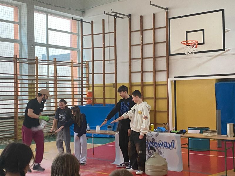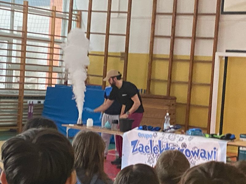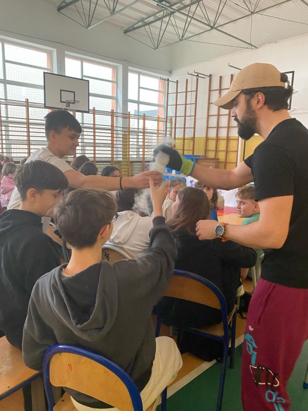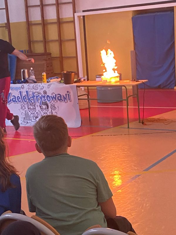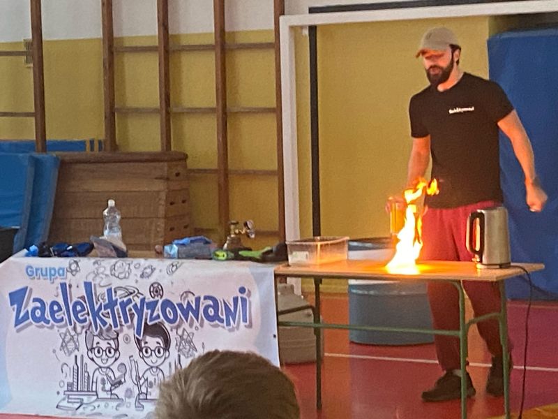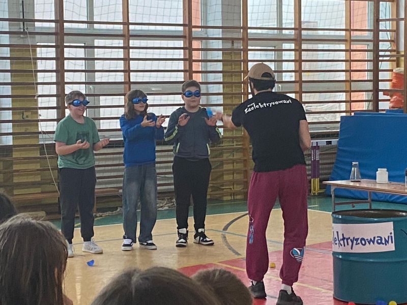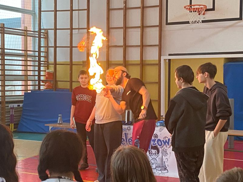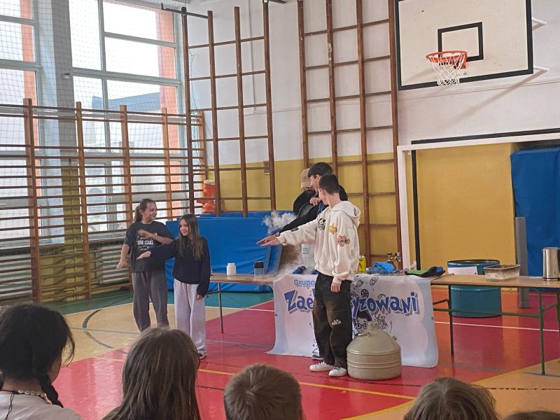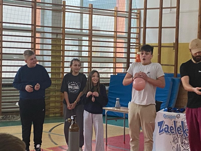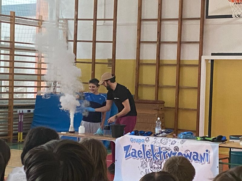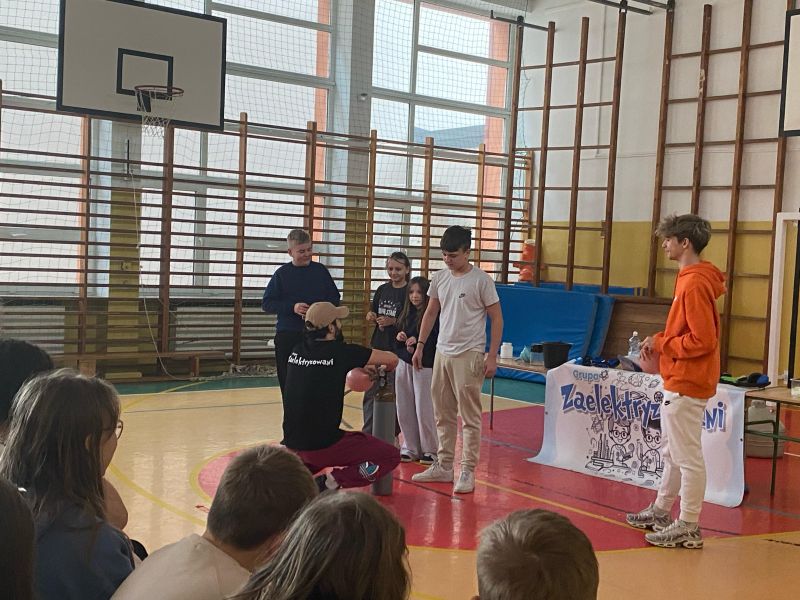3 lutego 2025 r. naszą szkołę odwiedził animator z Lublina, przedstawiciel grupy „Zaelektryzowani”, który przybliżył wszystkim uczestnikom wiedzę z zakresu chemii i fizyki. Tematem zajęć były m.in. właściwości fizyczne i chemiczne wybranych gazów, rozkład termiczny perhydrolu, doświadczenia związane z napięciem powierzchniowym, działaniem sił odśrodkowych czy krzesłem fakira. Prezentujący pokazał wiele ciekawych doświadczeń z wodorem, helem oraz ciekłym azotem. Dzieci bardzo aktywnie brały udział w pokazie chemiczno-fizycznych doświadczeń. Mogły one bezpośrednio zaobserwować zjawisko wrzenia ciekłego azotu, zmianę wysokości dźwięku w helu czy efekt idealnego kształtu. Prowadzącemu udało się w umiejętny sposób połączyć elementy humorystyczne oraz edukacyjne zachęcając obserwujących do wspólnego, bezpiecznego eksperymentowania. Dzięki czemu uczniowie poszerzyli swoją wiedzę z zakresu chemii i fizyki. Świetnie się bawili, miło i pożytecznie spędzili czas.