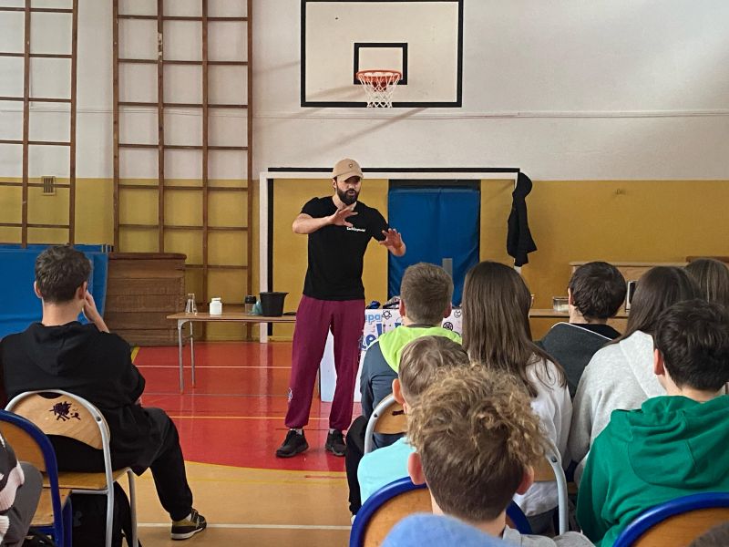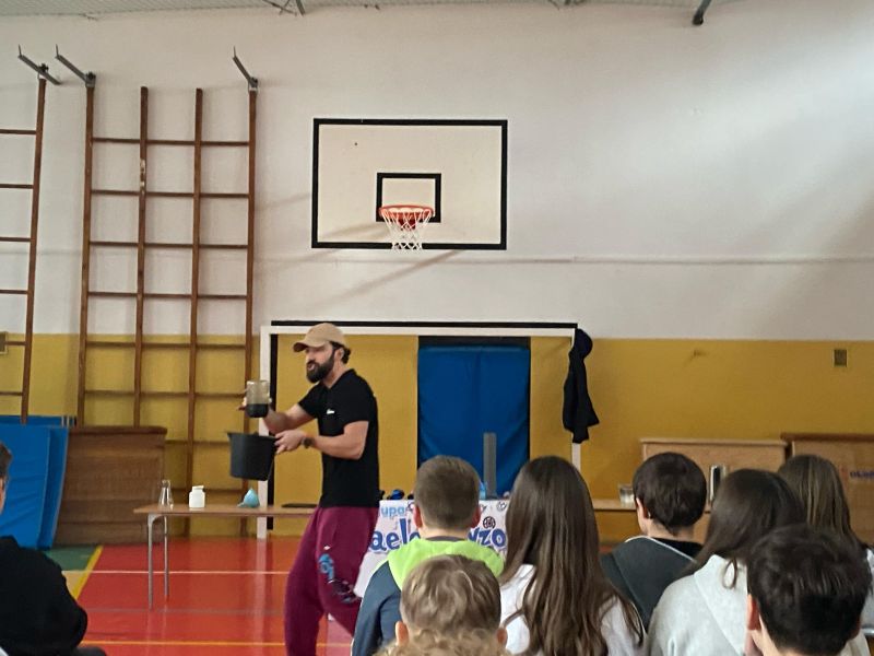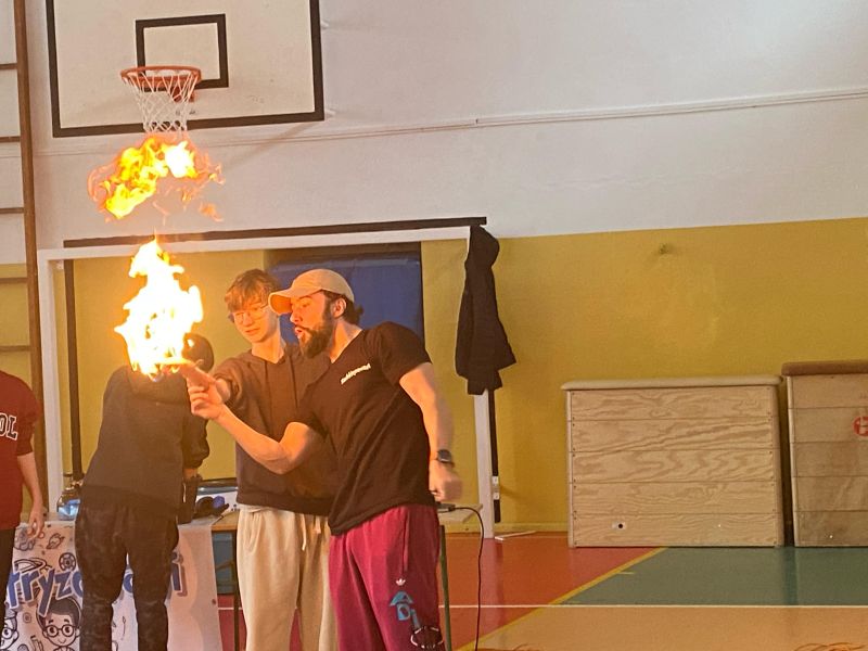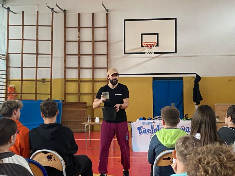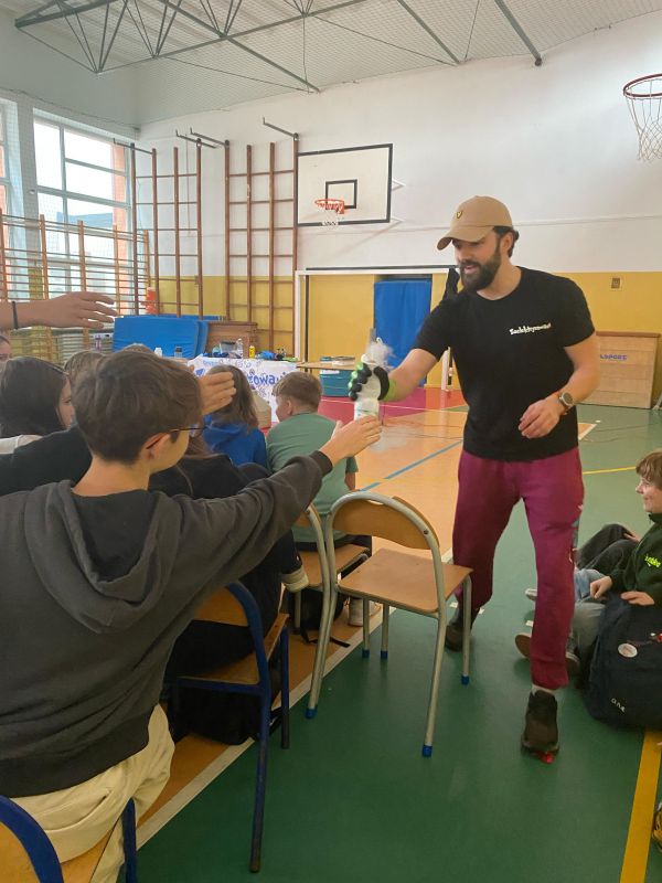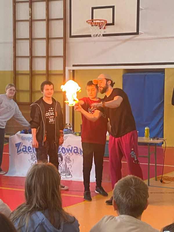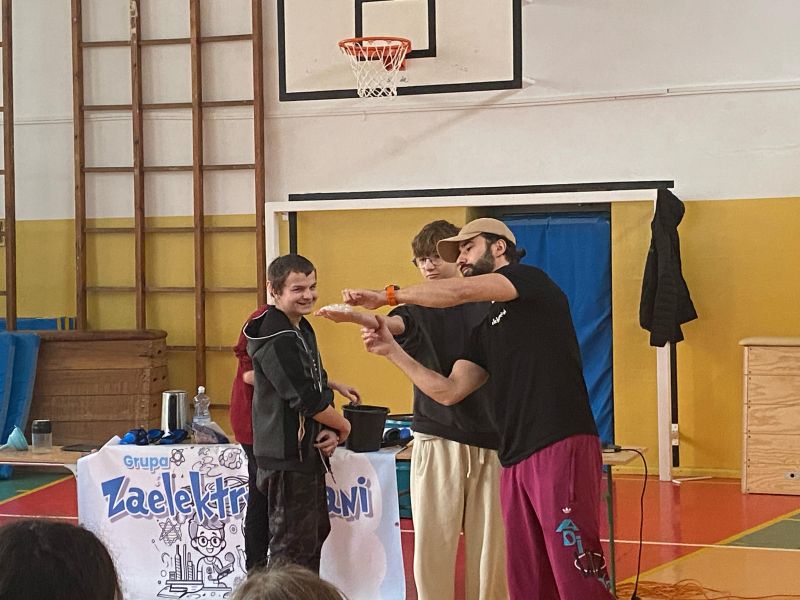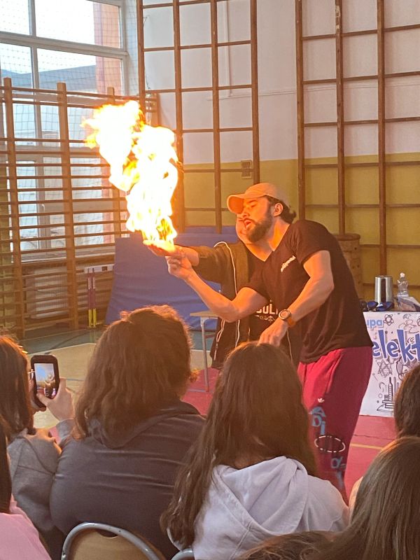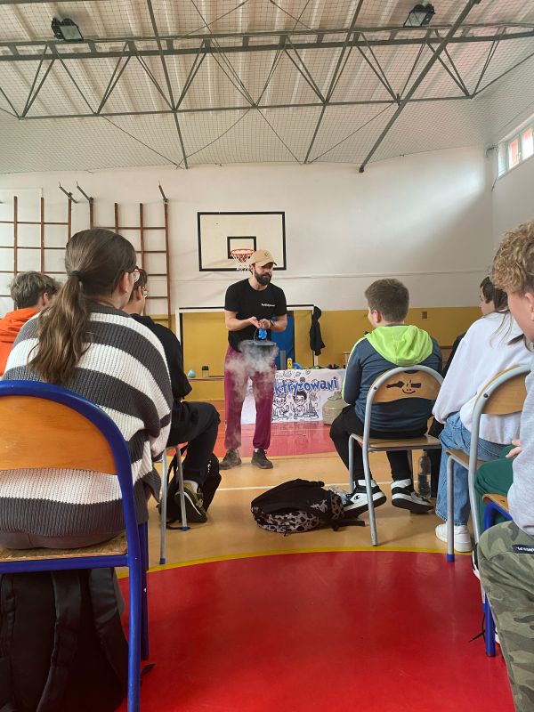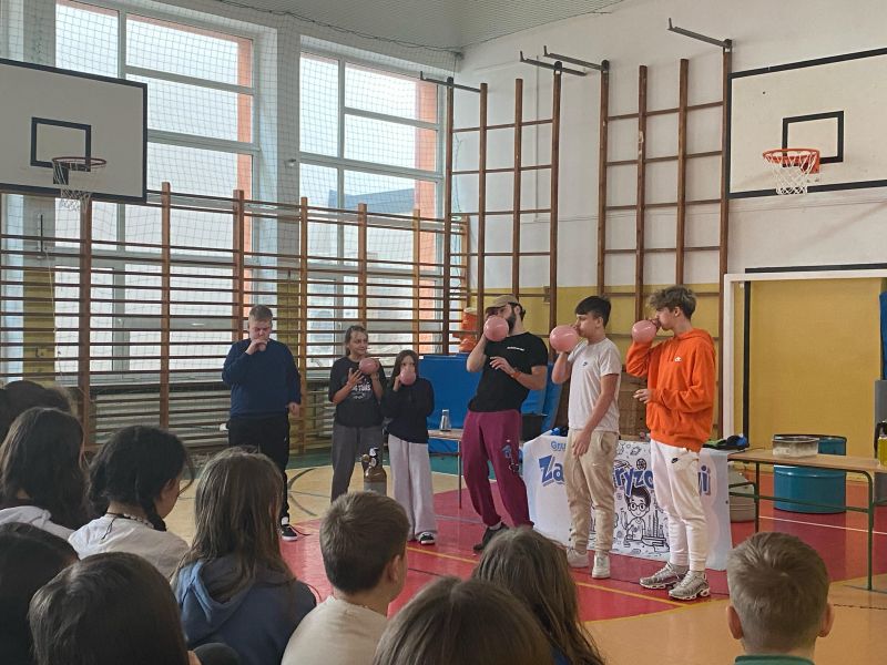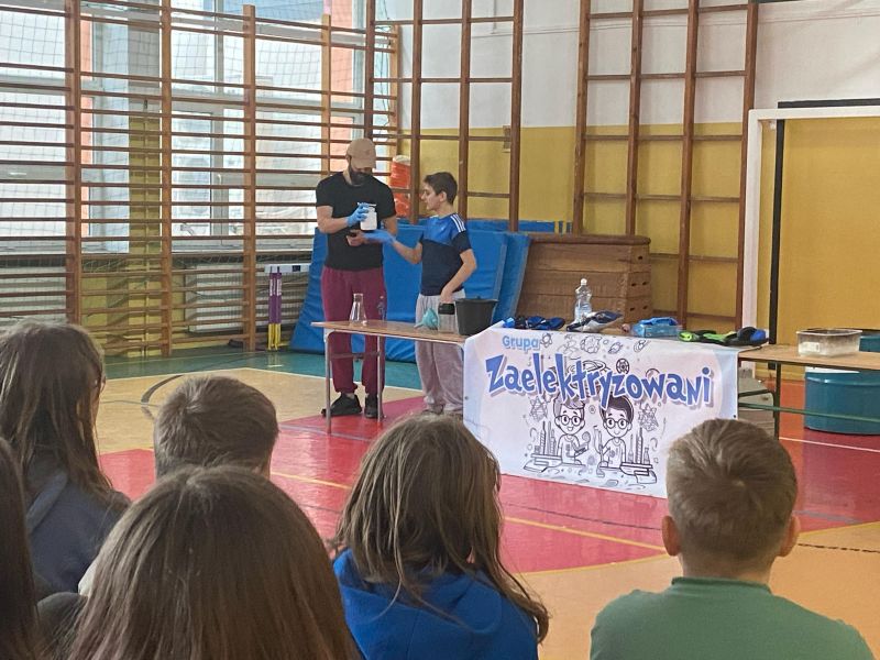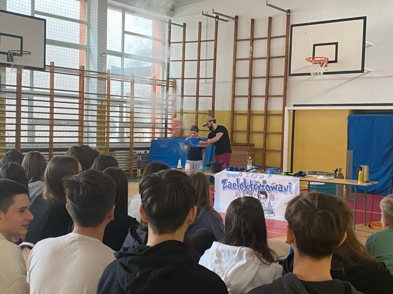 3 lutego 2025 r. naszą szkołę odwiedził animator z Lublina, przedstawiciel grupy „Zaelektryzowani”, który przybliżył wszystkim uczestnikom wiedzę z zakresu chemii i fizyki. Tematem zajęć były m.in. właściwości fizyczne i chemiczne wybranych gazów, rozkład termiczny perhydrolu, doświadczenia związane z napięciem powierzchniowym, działaniem sił odśrodkowych czy krzesłem fakira. Prezentujący pokazał wiele ciekawych doświadczeń z wodorem, helem oraz ciekłym azotem. Dzieci bardzo aktywnie brały udział w pokazie chemiczno-fizycznych doświadczeń. Mogły one bezpośrednio zaobserwować zjawisko wrzenia ciekłego azotu, zmianę wysokości dźwięku w helu czy efekt idealnego kształtu. Prowadzącemu udało się w umiejętny sposób połączyć elementy humorystyczne oraz edukacyjne zachęcając obserwujących do wspólnego, bezpiecznego eksperymentowania. Dzięki czemu uczniowie poszerzyli swoją wiedzę z zakresu chemii i fizyki. Świetnie się bawili, miło i pożytecznie spędzili czas.