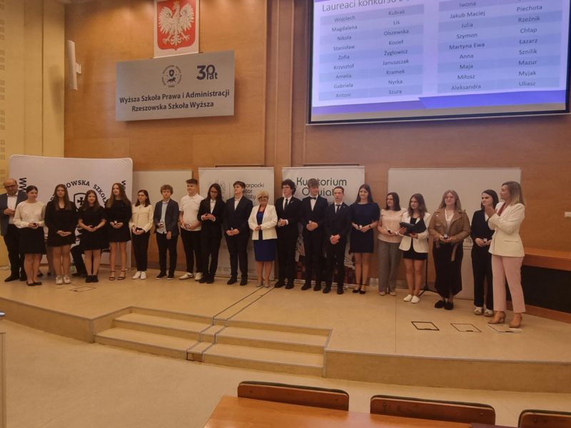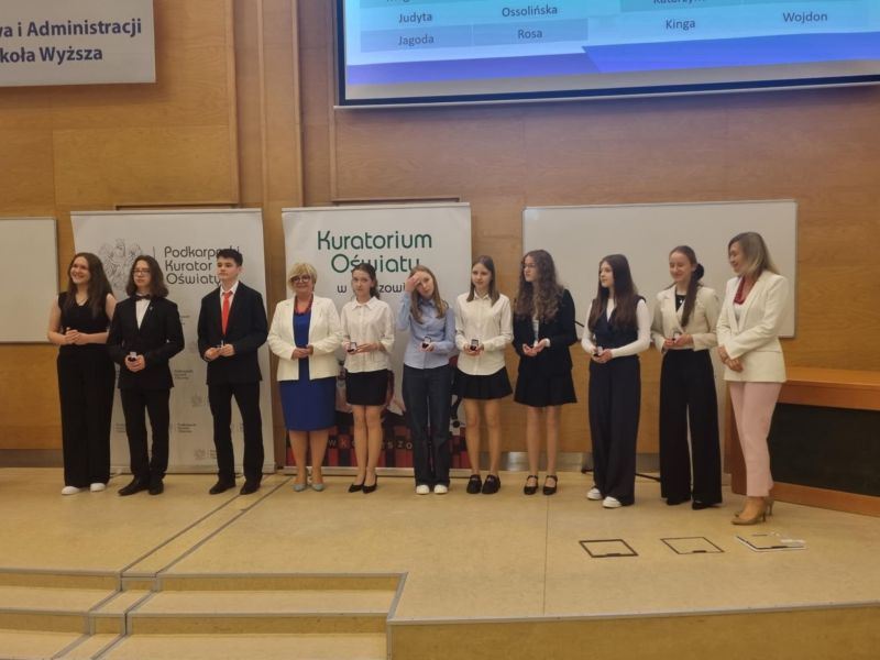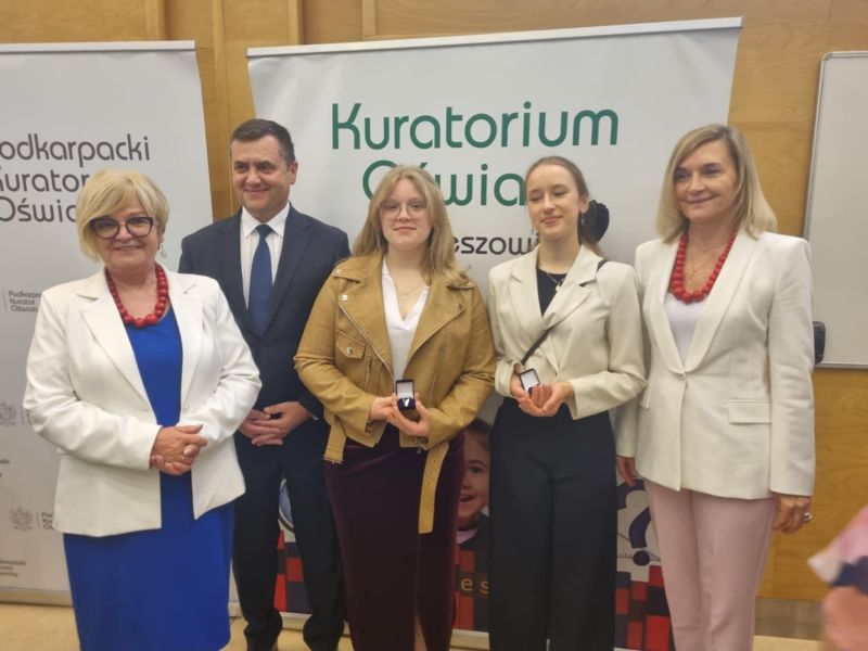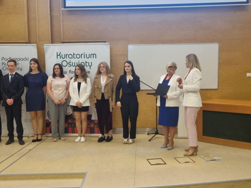 W piątek 30 maja 2025 r. w Wyższej Szkole Prawa i Administracji w Rzeszowie odbyło się podsumowanie tegorocznej edycji konkursów przedmiotowych organizowanych przez Podkarpackiego Kuratora Oświaty. Na uroczystą galę zostali zaproszeni wszyscy Laureaci konkursów wraz z Dyrektorami szkół. Nasze uczennice Patrycja Iwanicka (Laureatka konkursu z języka polskiego) oraz Zofia Żygłowicz (Laureatka konkursu z chemii) odebrały nagrody z rąk Pani Wojewody Teresy Kubas-Hul oraz Podkarpackiego Kuratora Oświaty Pani Doroty Nowak-Maluchnik. Serdecznie gratulujemy.