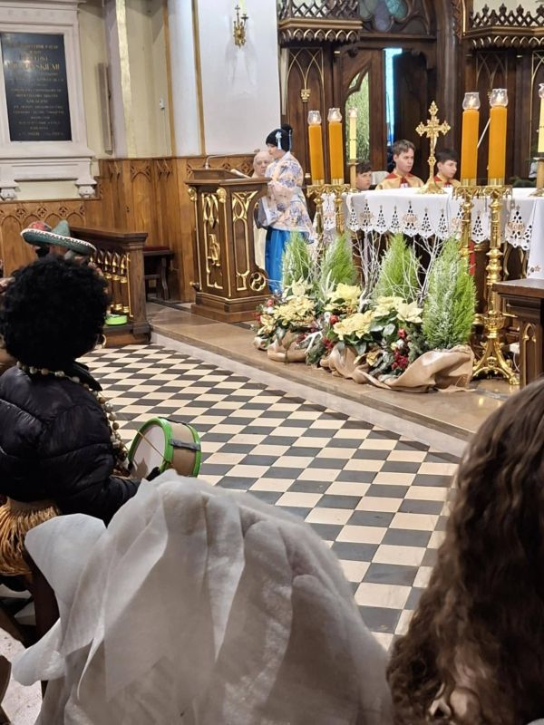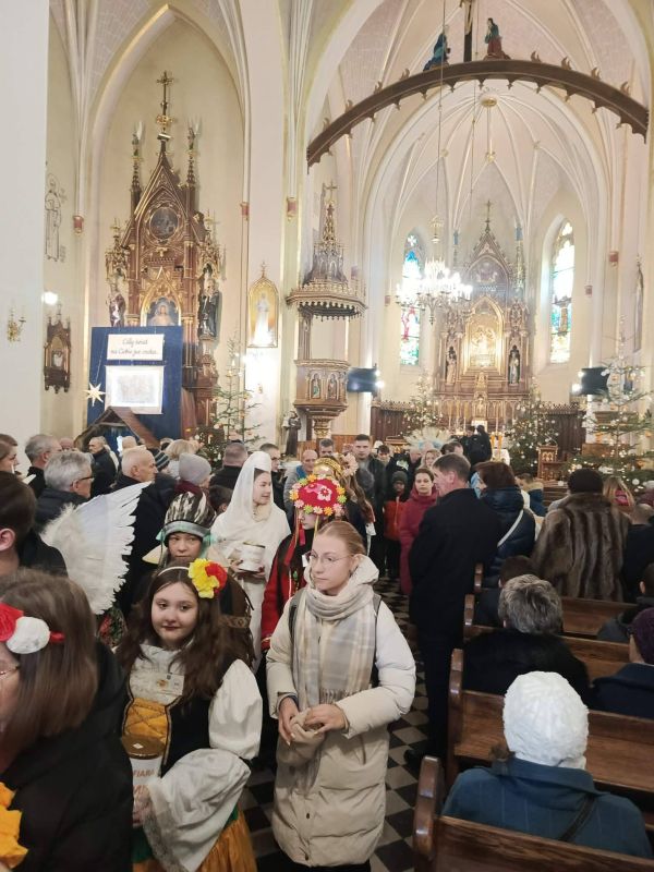 Akcję rozpoczęła Msza Święta, w którą tradycyjnie zaangażowali się kolędnicy. Włączyli się w czytania, psalm, modlitwy wiernych, komentarz do darów i dary ołtarza -  złożyli: KWIATY, HERBATĘ I CYNAMON, PAMIĄTKI KOLĘDOWANIA, CHLEB, WODĘ I WINO.