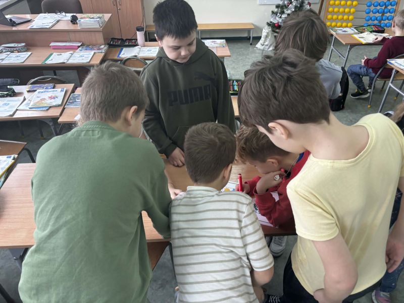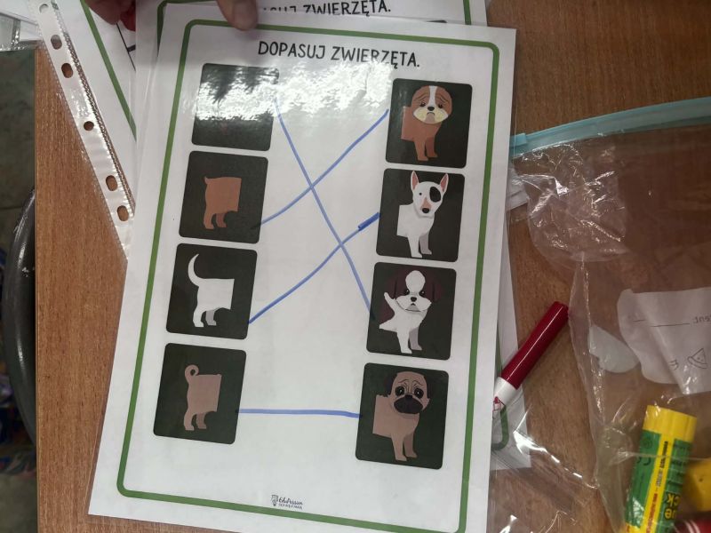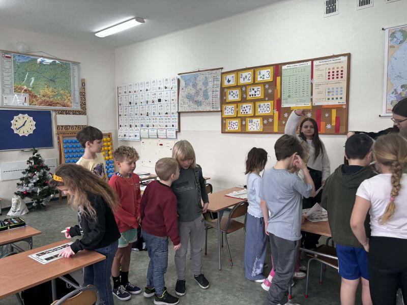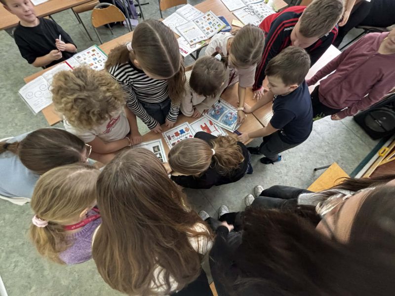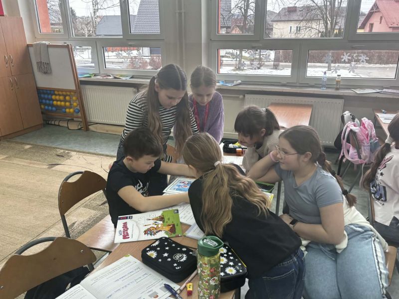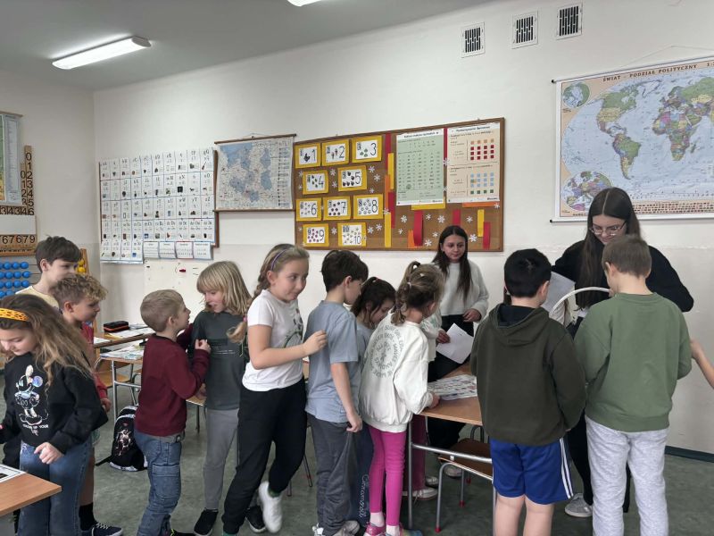 Uczniowie klasy 7a przygotowali atrakcje dla młodszych kolegów i koleżanek. Odwiedzili klasy 1–3, gdzie wspólnie rozwiązywano zagadki, układano puzzle oraz wykonywano różne zadania logiczne. Dużym wyzwaniem okazało się zadanie „Znajdź 10 różnic”. Było ono na tyle trudne, że nawet nauczyciele mieli problem ze znalezieniem wszystkich szczegółów.