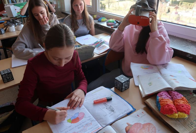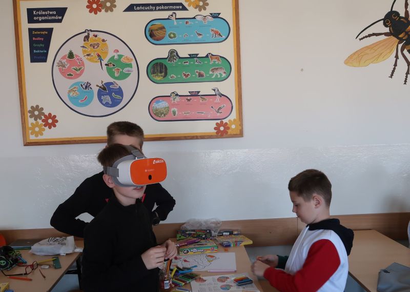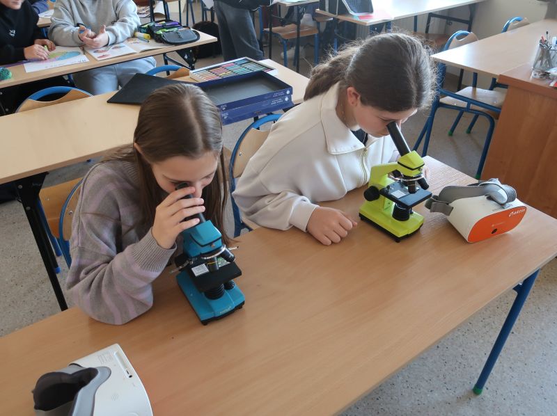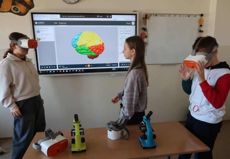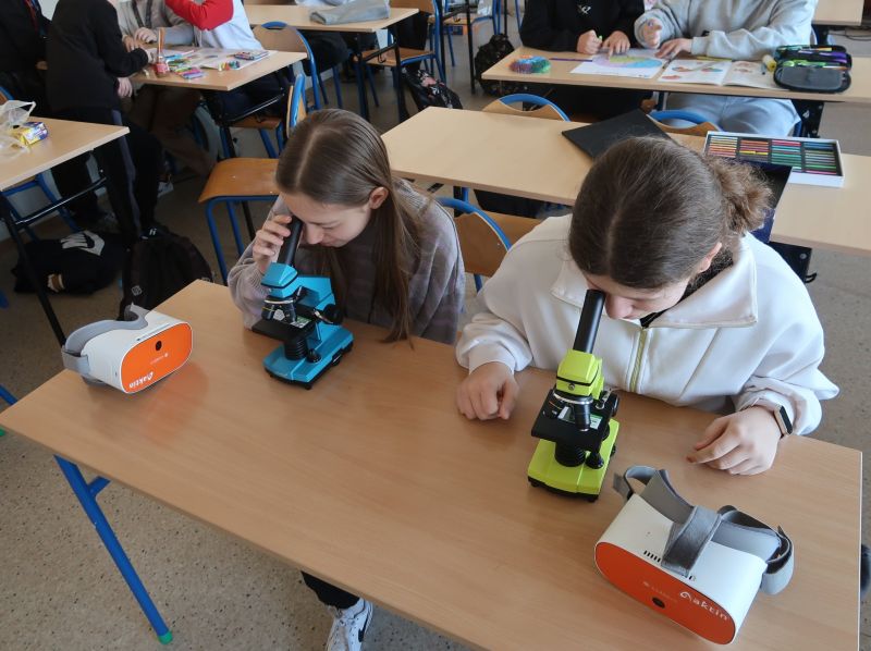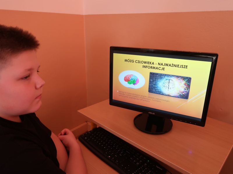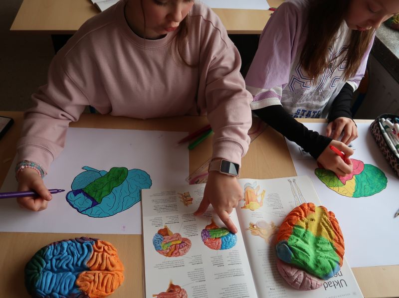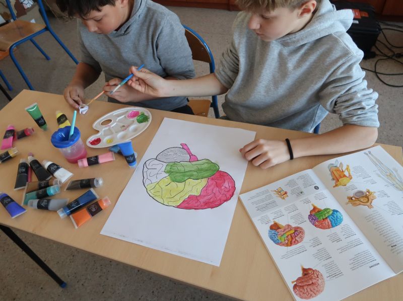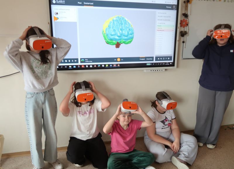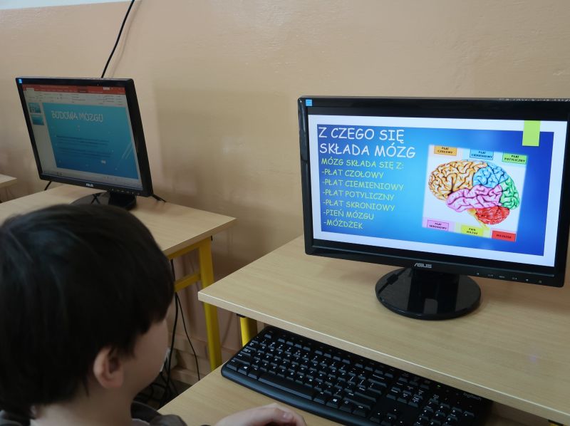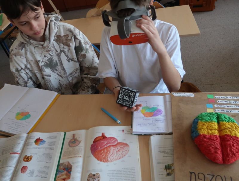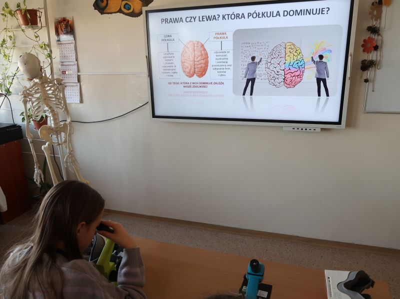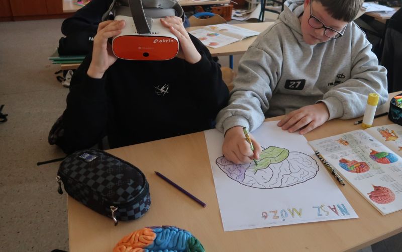 Uczniowie klas IV – VIII też bardzo chętnie włączyli się w obchody Europejskiego Dnia Mózgu. Na lekcjach biologii, przyrody oraz zajęciach edukacji zdrowotnej zdobywali wiedzę na temat budowy i higieny mózgu oraz zgłębiali tajniki funkcjonowania tego fascynującego narządu. Tworzyli niezwykłe projekty i podcasty dotyczące sekretów mózgu, brali udział w teleturniejach, zabawach i quizach wiedzy o mózgu. Na lekcjach informatyki powstawały ciekawe prezentacje i plakaty dotyczące m.in. nawyków negatywnie wpływających na mózg nastolatka. Uczniowie wielu klas mogli oglądać i podziwiać ten wyjątkowy narząd w technologii 3D korzystając z okularów VR, jak również pod mikroskopem. Były też liczne debaty, pogadanki i projekcja filmów edukacyjnych. Uczniowie z dużym zaangażowaniem włączali się we wszystkie działania związane z Europejskim Dniem Mózgu.