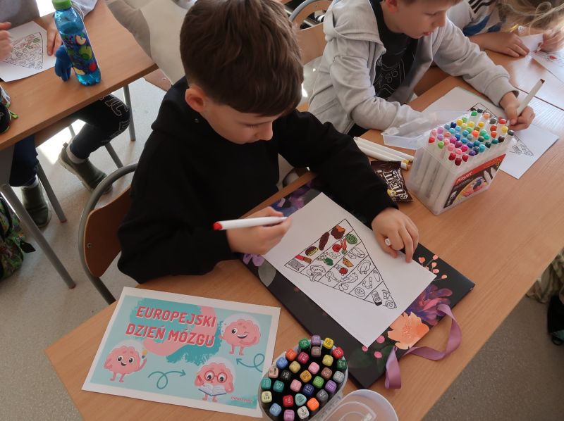 i zasady jego funkcjonowania,  dowiedzieli się jak resetować i relaksować ten ważny narząd. Obejrzeli kilka ciekawych filmów edukacyjnych, np.„ Jak działa mózg?” oraz „Twój mózg ma supermoc”. Pod hasłem „Odżywiamy mózg” uczniowie przygotowali zdrowe śniadanie wg własnych przepisów. Wśród propozycji znalazły się kolorowe kanapki, owocowe szaszłyki, desery i przekąski oraz pyszne sałatki owocowo-warzywne, które były kompozycją odpowiednio dobranych składników wspomagających i odżywiających mózg. W ramach obchodów Dnia Mózgu nasi najmłodsi uczniowie uczestniczyli również w zajęciach relaksacyjnych przy muzyce, podczas których mogli wypocząć i wyciszyć swoje emocje. Były też zabawy wspomagające równowagę i koordynację ruchową, ćwiczenia umysłowe rozwijające pamięć i spostrzegawczość oraz zajęcia plastyczne.