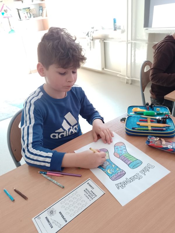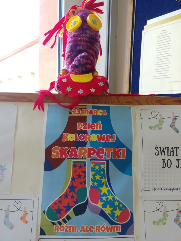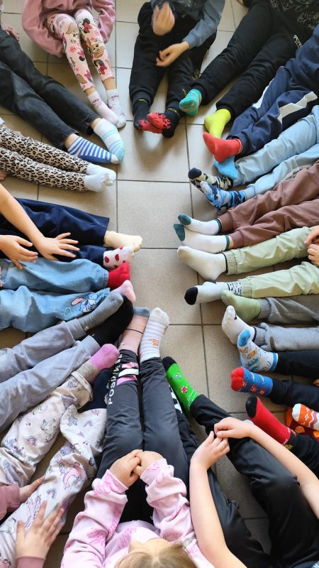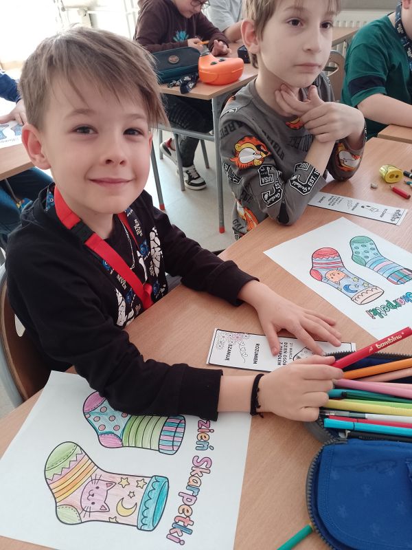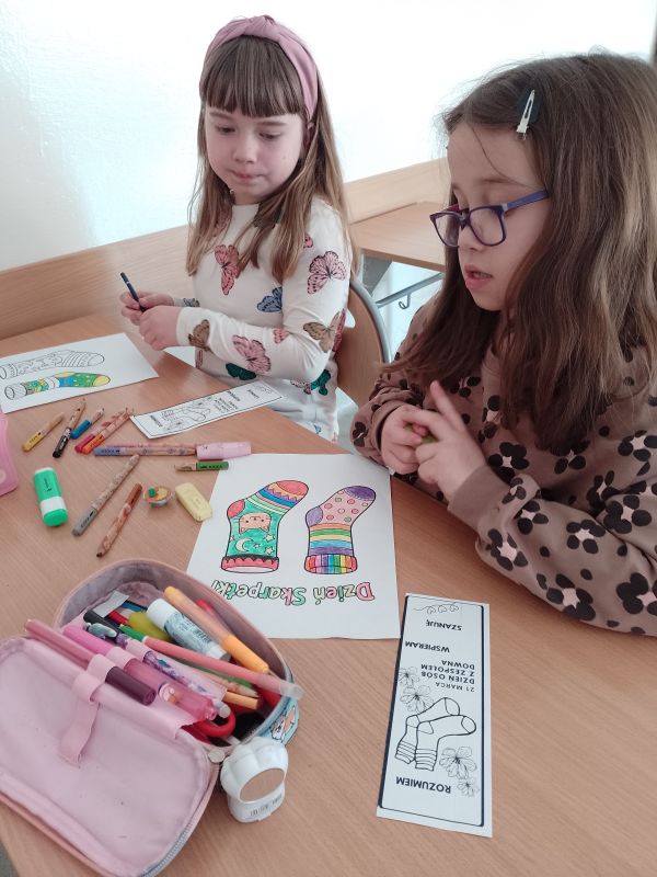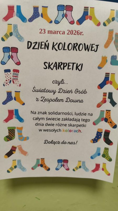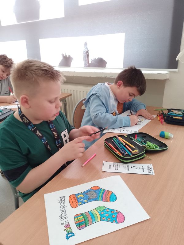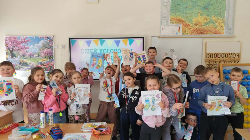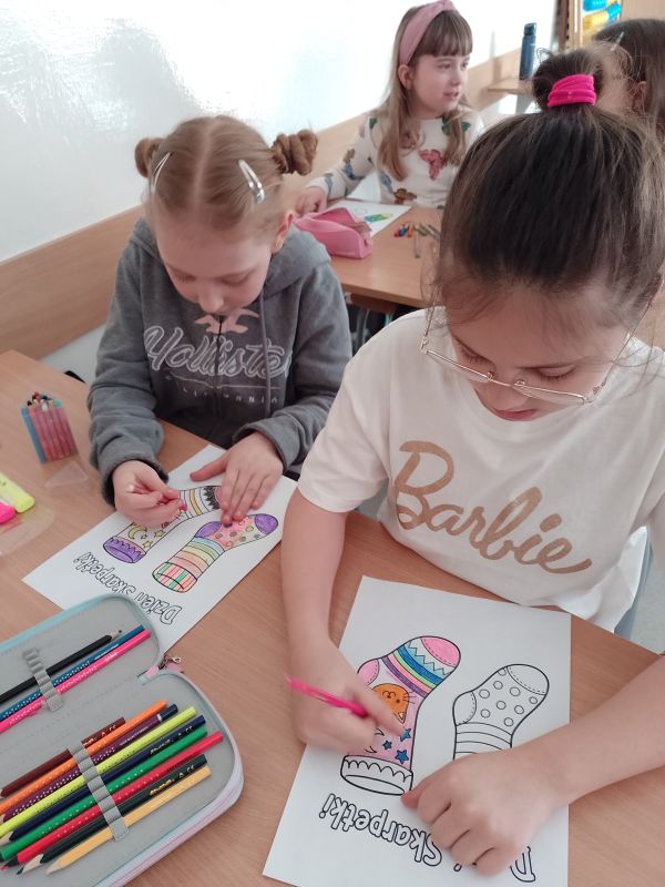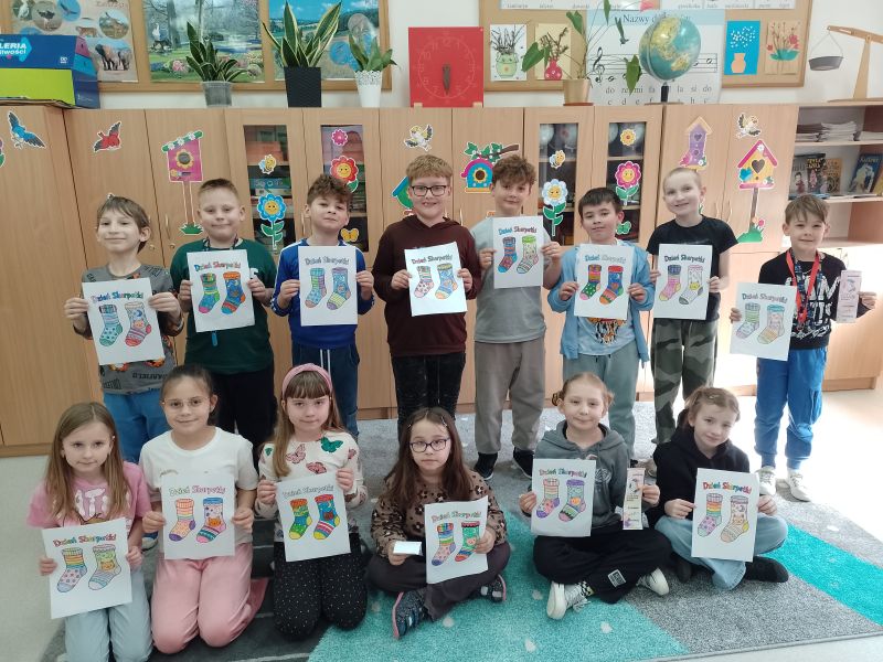 23 marca 2026 r. w klasach 1–3 obchodziliśmy Dzień Kolorowej Skarpetki - wyjątkowe wydarzenie, którego celem było uwrażliwienie uczniów na potrzeby i codzienne życie osób z Zespołem Downa oraz kształtowanie postaw akceptacji, empatii i szacunku wobec drugiego człowieka. Obchody rozpoczęły się od obejrzenia filmu edukacyjnego, który w przystępny i dostosowany do wieku dzieci sposób przybliżył temat różnorodności oraz pokazał, jak ważne jest wzajemne zrozumienie i życzliwość. Film stał się punktem wyjścia do pogadanki, podczas której uczniowie aktywnie uczestniczyli w rozmowie, dzielili się swoimi spostrzeżeniami oraz zastanawiali się, jak mogą okazywać wsparcie i akceptację innym osobom na co dzień. W dalszej części zajęć dzieci brały udział w aktywności plastycznej - kolorowały papierowe skarpetki według własnych pomysłów. Powstałe prace były niezwykle barwne i różnorodne, co pięknie oddawało symbolikę tego dnia. Uczniowie z zaangażowaniem uczestniczyli w zadaniu, rozwijając swoją kreatywność i wyobraźnię. Nie zabrakło również elementów integracyjnych - dzieci przyszły w tym dniu do szkoły w kolorowych skarpetkach, nie do pary, wyrażając w ten sposób solidarność z osobami z Zespołem Downa. Dzień Kolorowej Skarpetki był dla uczniów nie tylko radosnym i pełnym kolorów wydarzeniem, ale przede wszystkim ważną lekcją wrażliwości, zrozumienia i otwartości na drugiego człowieka.