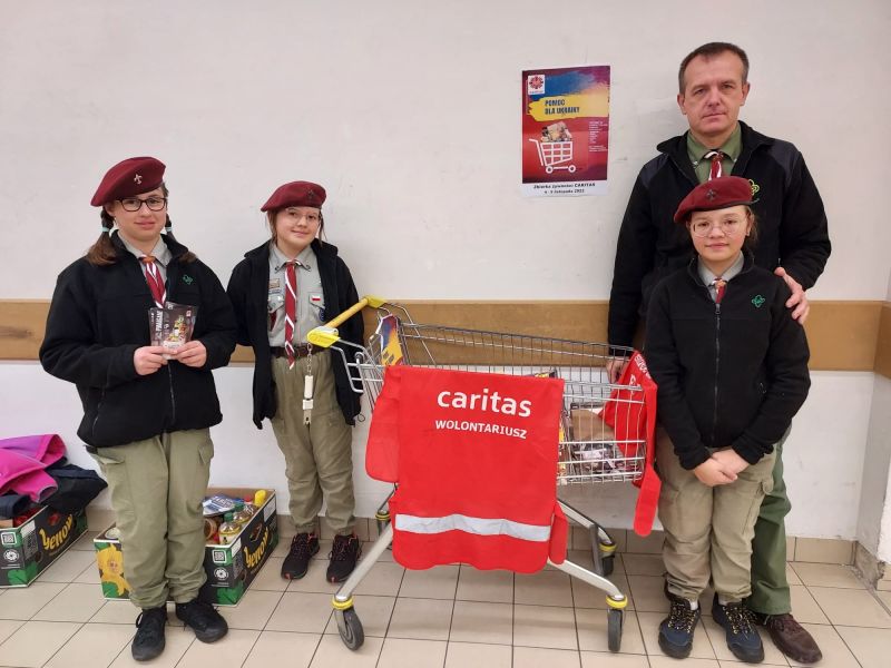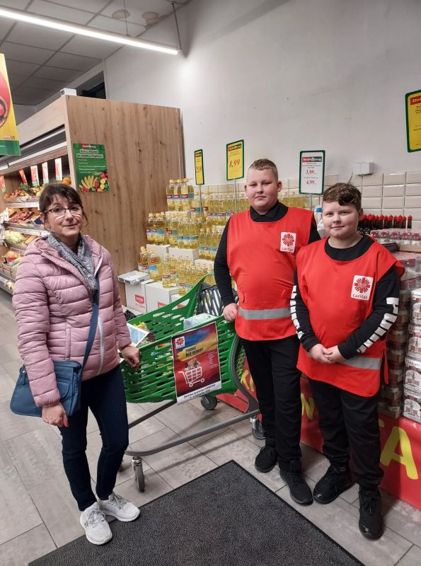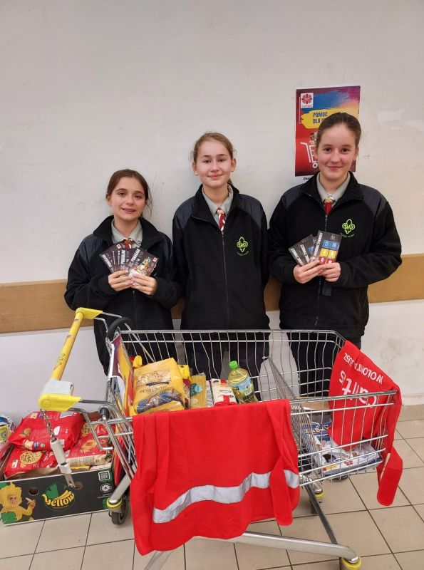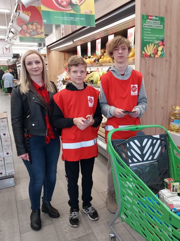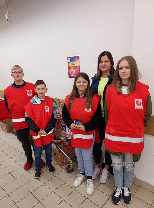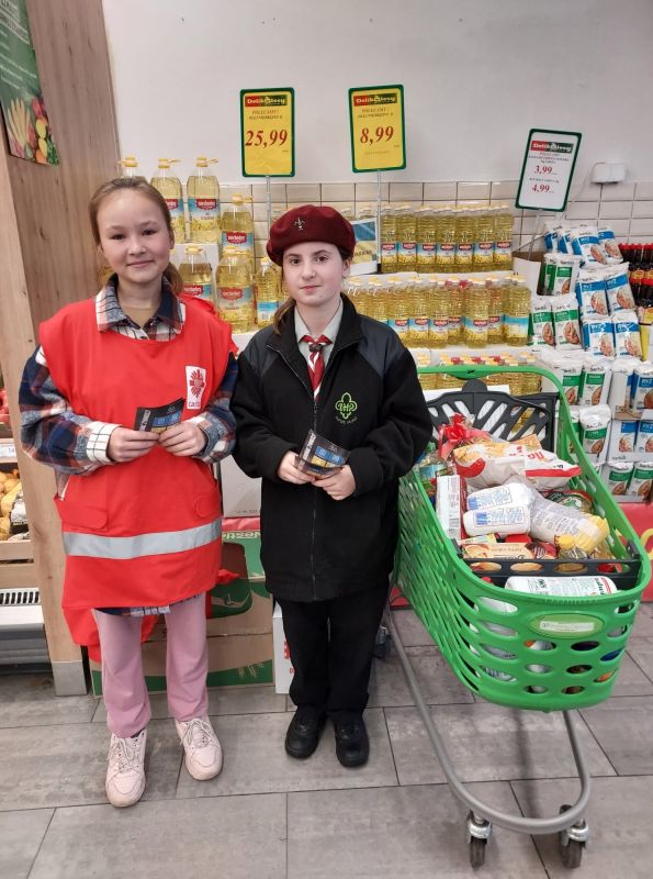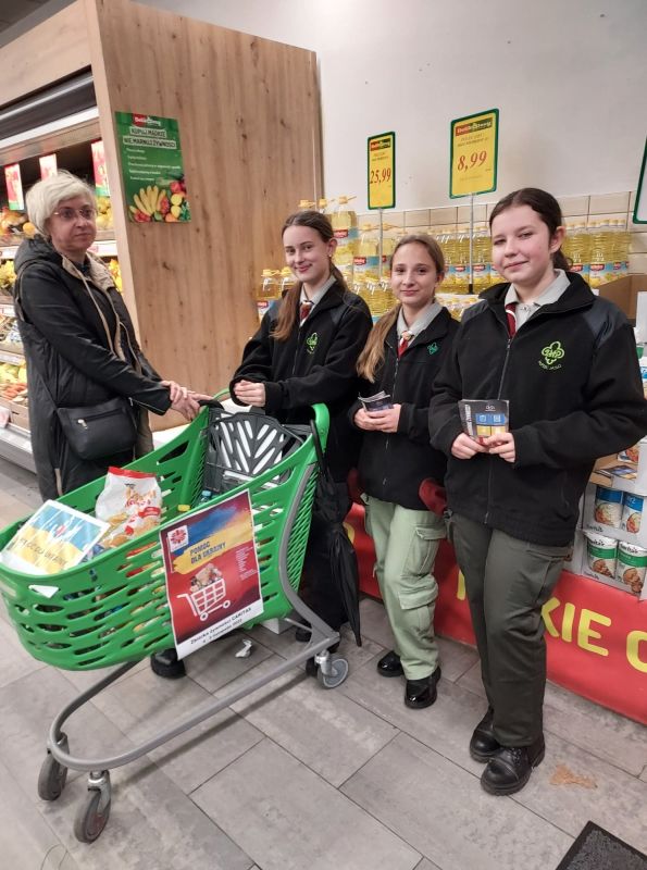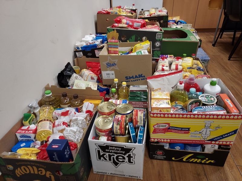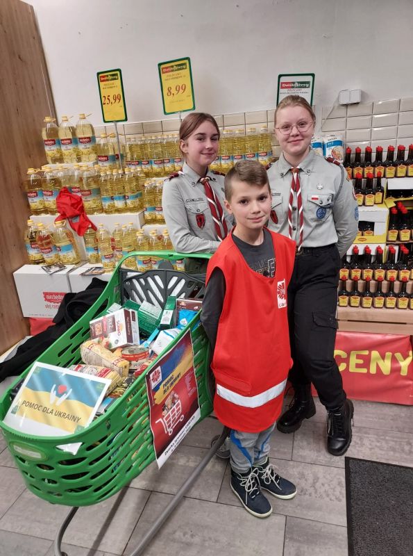 „Więcej szczęścia jest w dawaniu aniżeli w braniu” (Dz 20,35) W dniach od 4 do 5 listopada uczniowie Szkoły Podstawowej w Kołaczycach wzięli udział w zbiórce żywności zorganizowanej na #PomocUkrainie. Prze dwa dni wolontariusze z naszej szkoły wraz z uczniami liceum w Kołaczycach dyżurowali na zmianę w dwóch kołaczyckich supermarketach. Zbierane były podstawowe produkty: mąka, kasze, ryż, makarony, konserwy, mleko, olej, cukier, itp. oraz środki sanitarne. Ofiarność klientów sklepów przeszła nasze najśmielsze oczekiwania. Efektem zbiórki żywności było kilkaset kilogramów trwałej żywności i środków czystości. Większość artykułów poprzez Fundację DROGA DO BOGA - kierowaną przez ks. Łukasza Leśniaka, trafi do uchodźców wewnętrznych w parafii św. Jana Pawła II we Lwowie. Część produktów zostanie rozdysponowana na miejscu do potrzebujących rodzin i uchodźców będących pod opieką "Caritas" Diecezji Rzeszowskiej. W akcję w tym roku zaangażowali się przede wszystkim wolontariusze ze Szkolnego Koła "Caritas", ale również harcerze i niezrzeszeni uczniowie, łącznie ponad 60 osób - 33 z Publicznej Szkoły Podstawowej oraz 31 z LO w Kołaczycach. Dziękujemy wszystkim za zaangażowanie: wolontariuszom za ich pracę na rzecz potrzebujących; nauczycielom i rodzicom - za opiekę, dowóz wolontariuszy oraz transport darów, pracownikom Biedronki i Delikatesów Centrum za zrozumienie i otwartość. Bóg zapłać!