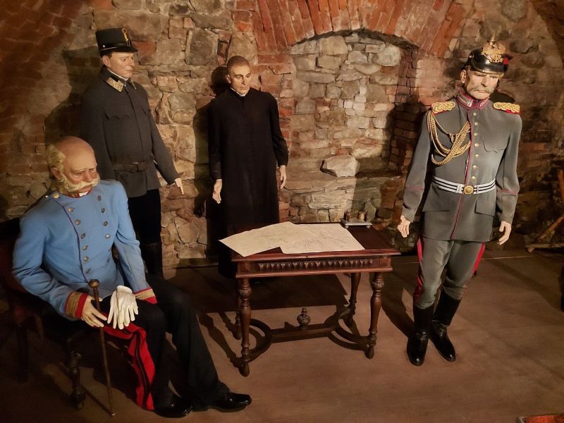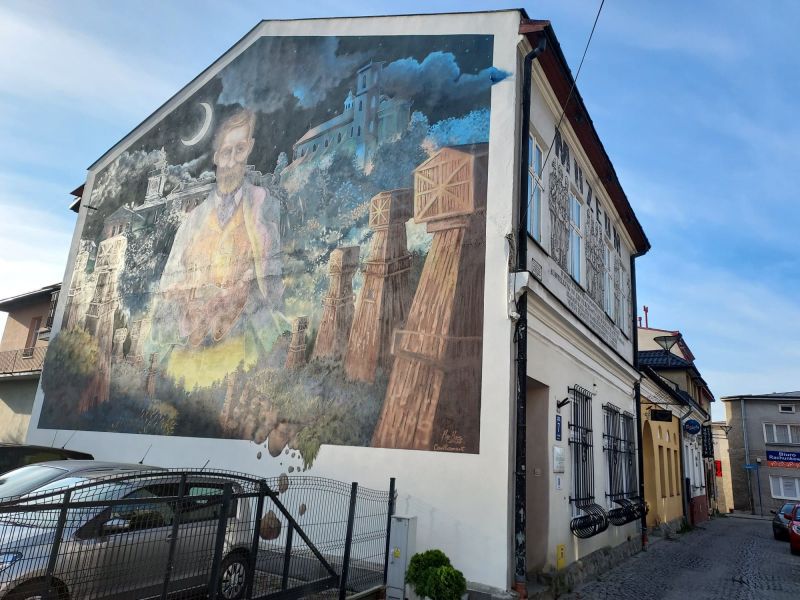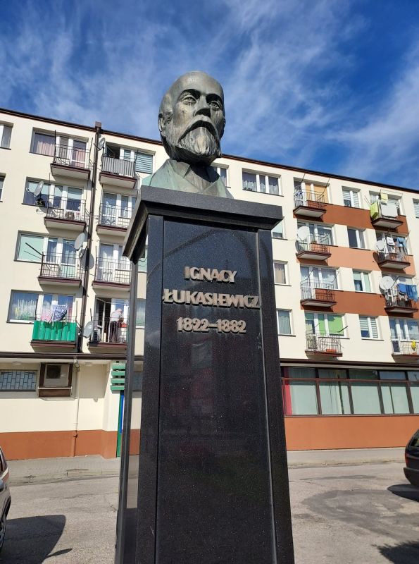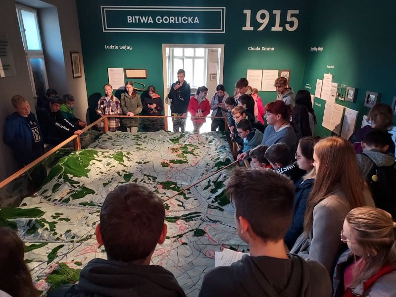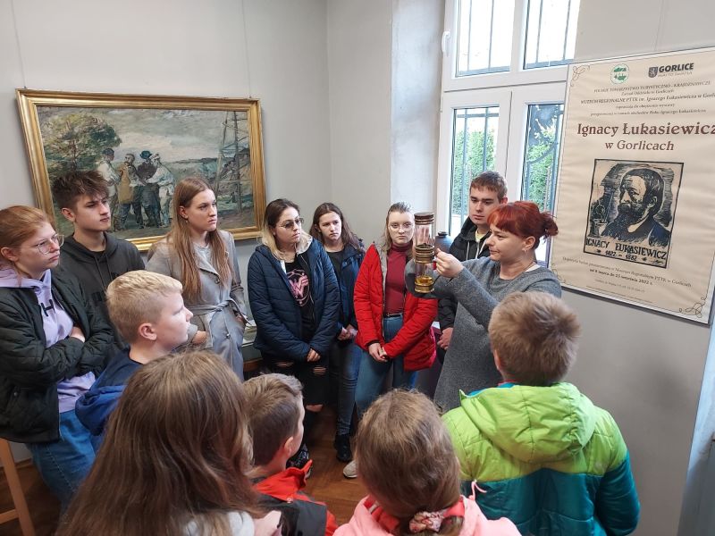 Pierwszym punktem naszej wycieczki było zwiedzanie Muzeum Regionalnego PTTK im. Ignacego Łukasiewicza w Gorlicach. W muzeum zgromadzono eksponaty dokumentujące historię Gorlic, m.in. zabytkowe dokumenty z pieczęciami, plany miasta oraz statuty cechowe od XV do XVII w. W związku z przypadającym w 2022 r. Rokiem Ignacego Łukasiewicza - prekursora przemysłu naftowego, nasza Pani Przewodnik szczególną uwagę zwróciła na tę wybitną postać związaną z gorlicką ziemią, a także na wielką wagę tej gałęzi przemysłu we współczesnym świecie. Wśród pamiątek po Ignacym Łukasiewiczu zgromadzonych w muzeum na uwagę zasługują: alembik aptekarski (urządzenie do destylacji ropy naftowej) oraz prototyp pierwszej na świecie lampy naftowej. Mogliśmy też zobaczyć atrakcyjną ekspozycję dotyczącą I wojny światowej z makietą rozegranej 2 maja 1915 r. bitwy pod Gorlicami oraz salon figur woskowych najważniejszych postaci tej operacji.