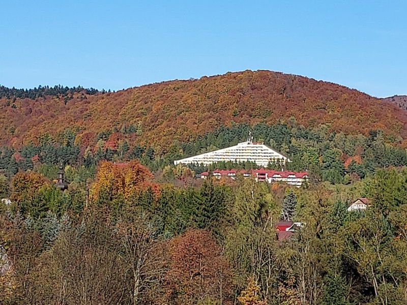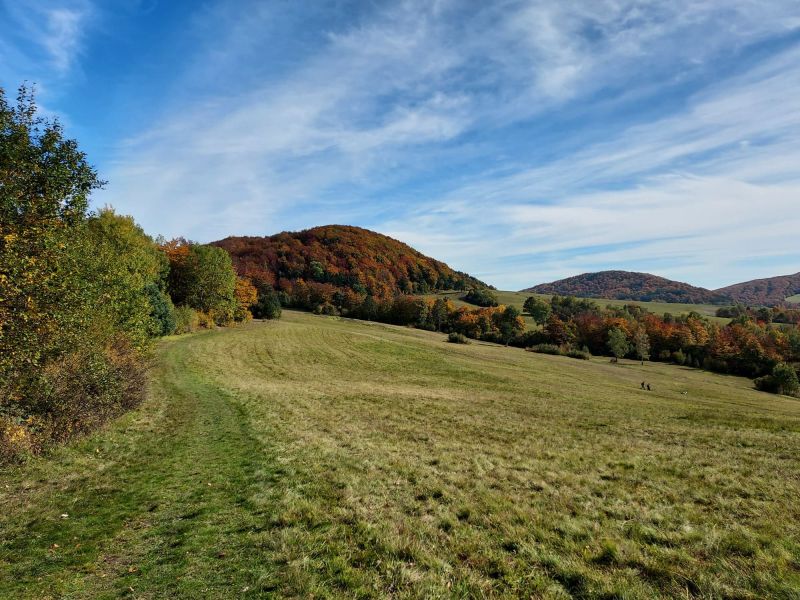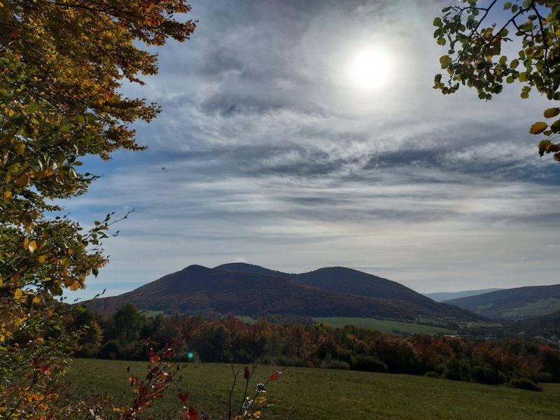 Po krótkim postoju w tym niezwykłym miejscu skierowaliśmy kroki w stronę niedalekiej granicy skąd rozpościerał się przepiękny widok na Słowację z położoną w górskiej dolinie cygańską wsią Cigelka i górującym na horyzoncie najwyższym szczytem Beskidu Niskiego - Busovem (1002 m n.p.m.). Słoneczna pogoda podkreślała tylko piękno pomalowanych jesiennymi kolorami drzew. Po około kilometrowym marszu pasem granicznym zeszliśmy z Przełęczy Cigelka z powrotem do Wysowej.