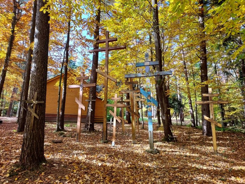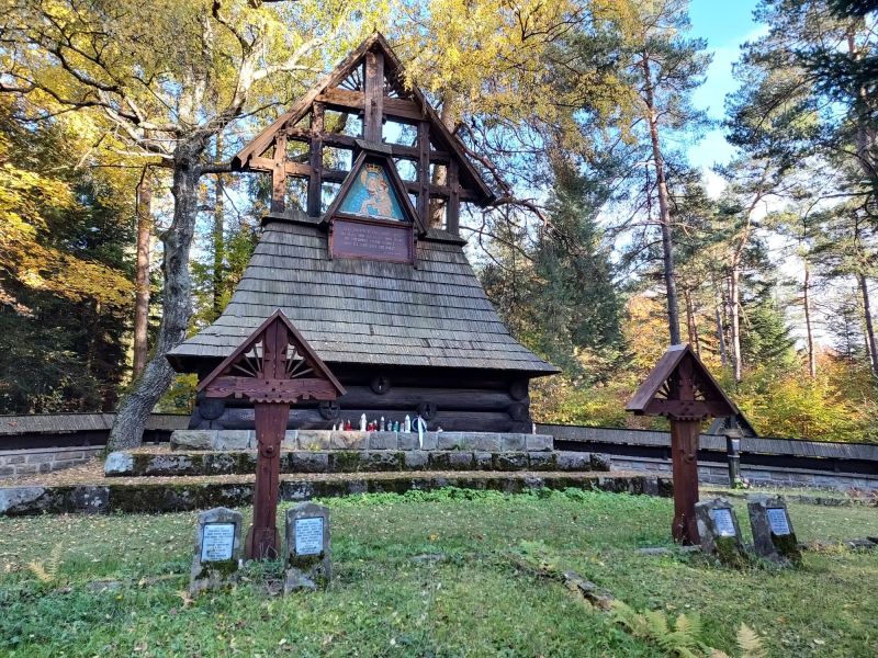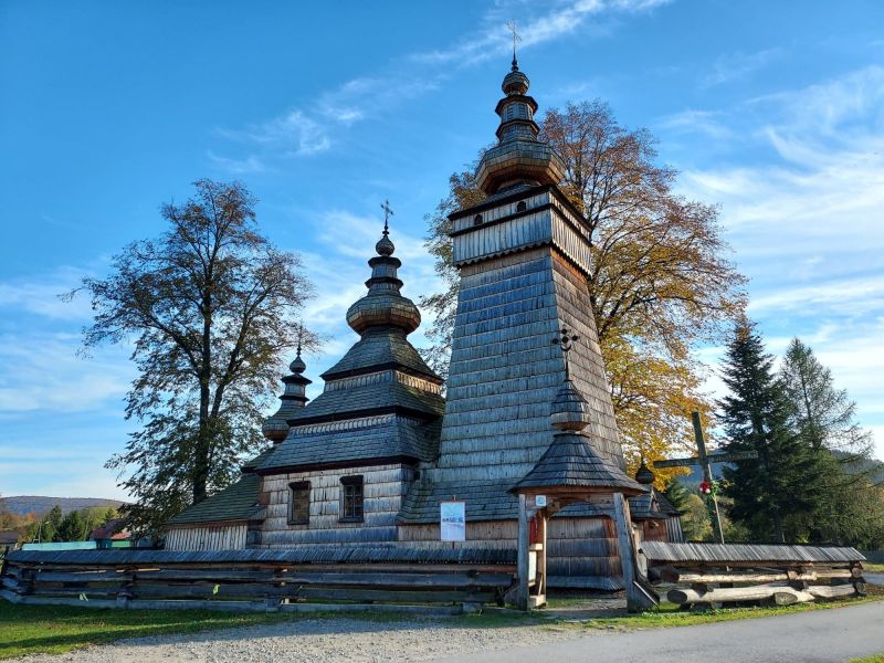 Następnie dotarliśmy do Wysowej Zdrój - uzdrowiskowej miejscowości położonej przy granicy ze Słowacją. Spod cerkwi pw. św. Michała Archanioła w Wysowej uczestnicy rajdu wyruszyli zielonym szlakiem pieszo w stronę granicy. Dochodząc do rozdroża skręciliśmy w lewo, zbaczając z zielonego szlaku i wybierając drogę przygotowaną dla pielgrzymów. Po przekroczeniu potoku Cygołka weszliśmy w las, by po około pół godzinie marszu wzdłuż Głębokiego Potoku dotrzeć do położonego na zboczach Jawora grekokatolickiego sanktuarium maryjnego. To tutaj, kilkaset metrów od granicy polsko-słowackiej w paśmie Gór Hańczowskich znajduje się otoczona wianuszkiem krzyży wotywnych cerkiew Opieki Matki Bożej w świętym dla Łemków miejscu. Historia tego sanktuarium sięga roku 1925, w którym to jednej z miejscowych Łemkiń objawić się miała Matka Boża. Gdy w miejscu objawień wytrysnęło źródło, z którego woda miała uzdrawiającą moc, na Jaworze rozwinął się kult maryjny. Sama zaś góra uznana została za świętą. Sześć lat później w miejscu objawień poświęcono kaplicę, a źródełko przekształcono w zadaszoną studnię, z której i my zaczerpnęliśmy wody.