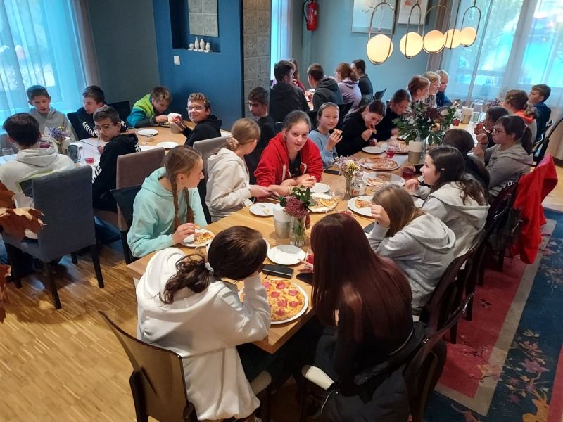 Ostatnim punktem naszej wycieczki była restauracja "Różana" w Skołyszynie. W tym miejscu należałoby podziękować Gminie Kołaczyce za dofinansowanie naszej wycieczki, dzięki czemu każdy z uczestników wyjazdu mógł zjeść pyszną pizzę. Po posiłku wszyscy zadowoleni wrócili do Kołaczyc.