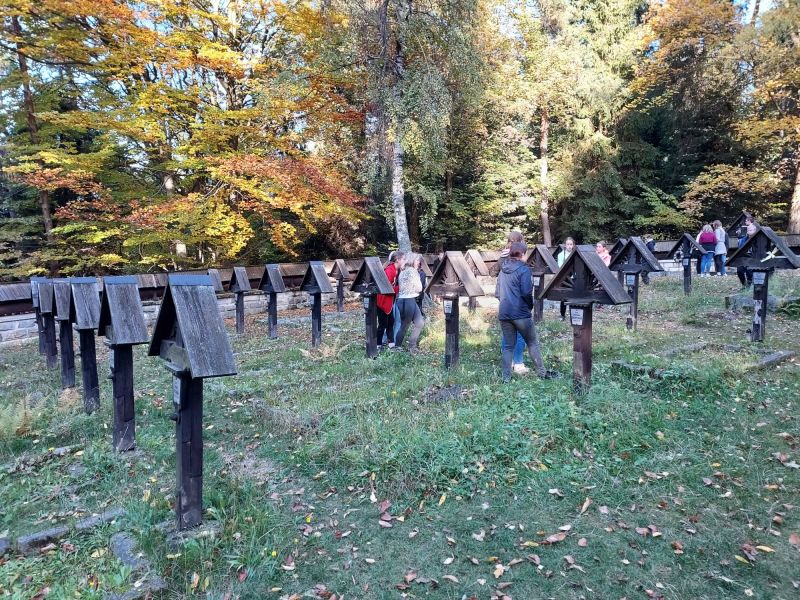 Po dotarciu do Parku Zdrojowego uczestnicy wycieczki mogli skosztować kilku rodzajów wód mineralnych dostępnych w wysowskiej pijalni. Odpocząwszy nieco wyruszyliśmy w drogę powrotną. Po drodze mogliśmy zobaczyć jedną z najpiękniejszych drewnianych cerkwi w Polsce. To wpisana na Listę Światowego Dziedzictwa UNESCO dawna grekokatolicka cerkiew pw. św. Paraskewy w Kwiatoniu. Następnie zatrzymaliśmy się na Przełęczy Małastowskiej gdzie odwiedziliśmy cmentarz z czasów I wojny światowej nr 60, na którym pochowani zostali m.in. uczestnicy tzw. operacji gorlickiej, przybliżonej nam w muzeum w Gorlicach. Był to czas na chwilę zadumy i refleksji.