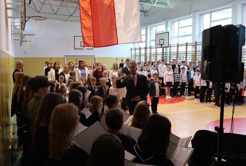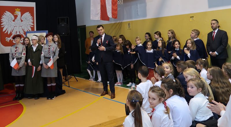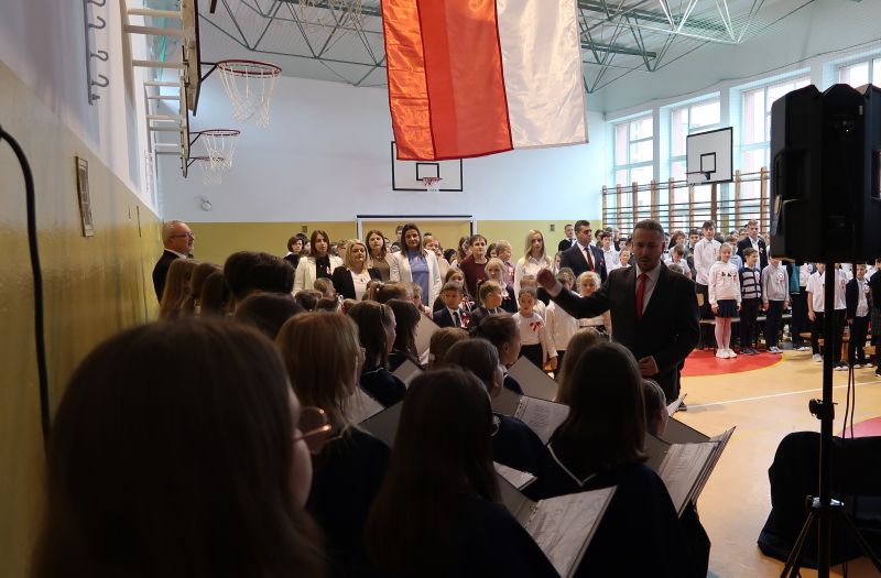 Po wprowadzeniu pocztu sztandarowego i odśpiewaniu hymnu, głos zabrał Dyrektor Szkoły p. Adam Iwanicki.