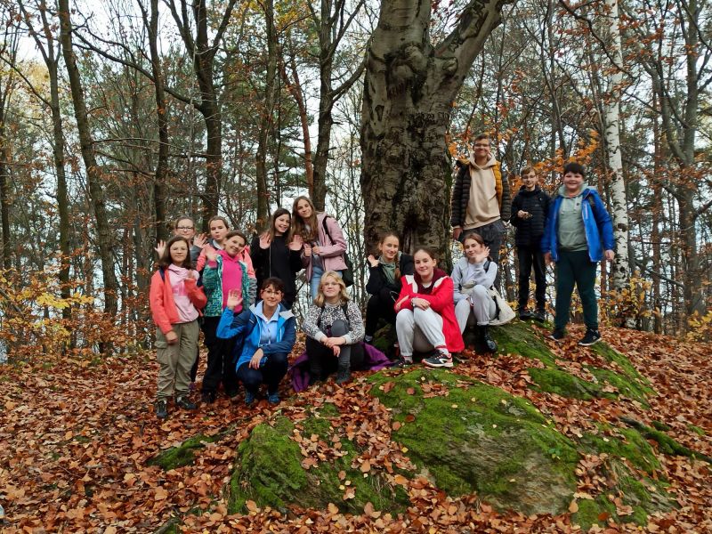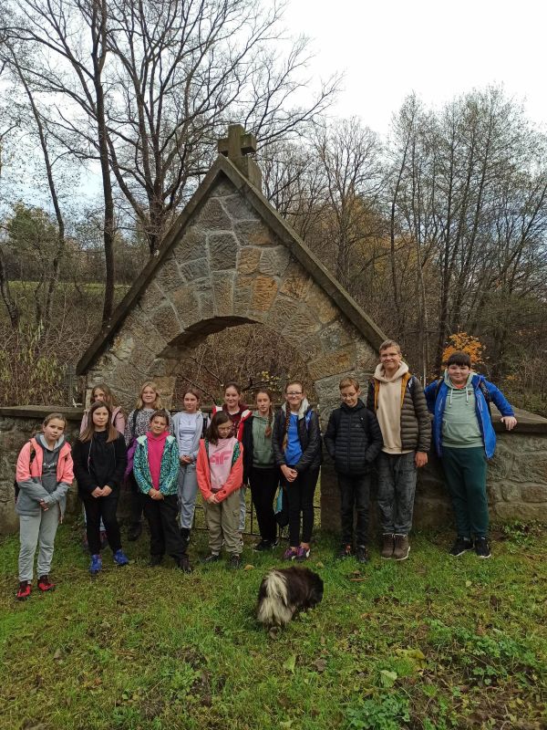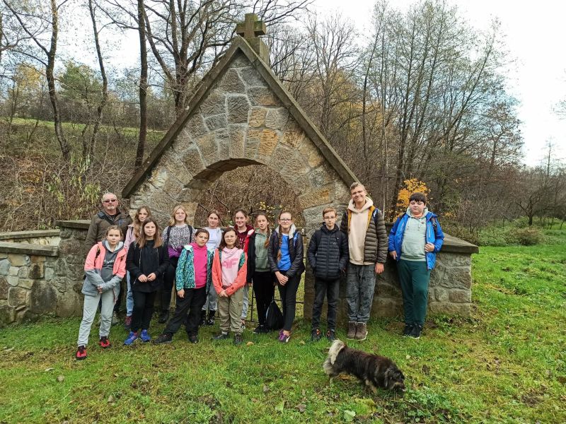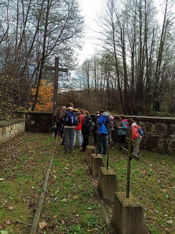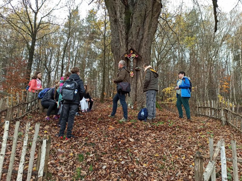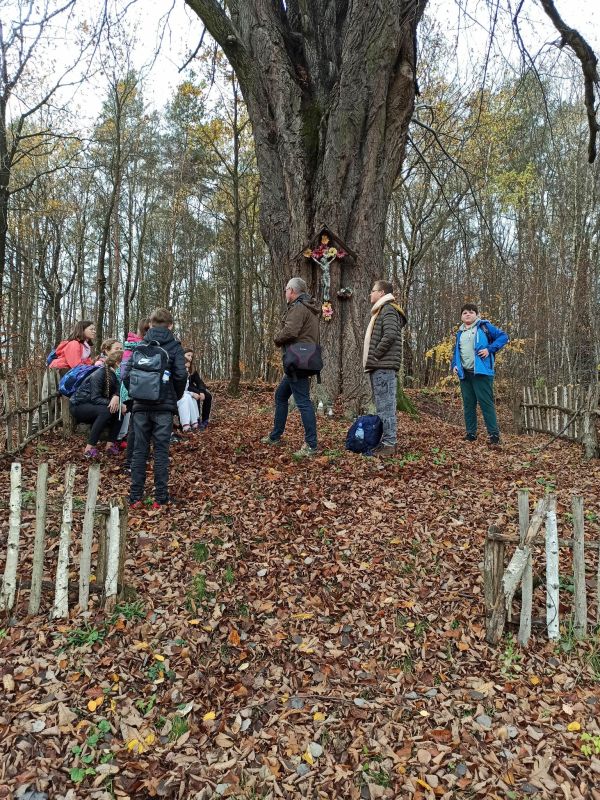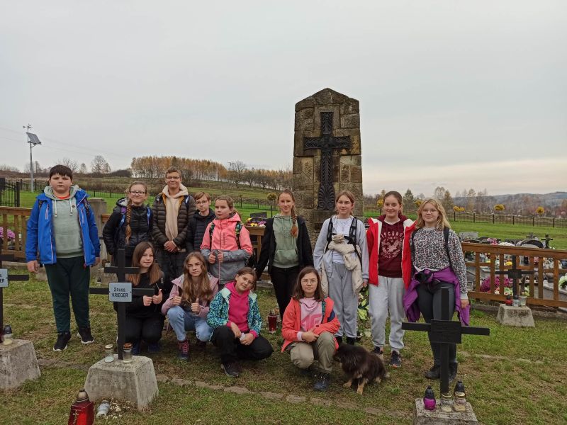 Na początku listopada, korzystając ze sprzyjających warunków pogodowych, jako członkowie SK PTTK „Liwocz” wybraliśmy się na pieszy rajd po najbliższej okolicy. Szliśmy Szlakiem Cmentarzy Wojennych, aby oddać hołd poległym za ojczyznę. Trasa naszej wędrówki nieprzypadkowo prowadziła tym szlakiem, bowiem miesiąc listopad tradycyjnie jest poświęcony pamięci Tych, którzy odeszli, a szczególnie Tych, którzy swoje życie oddali w walce za niepodległość Ojczyzny. Wędrowaliśmy wzdłuż DK 28, a później ul.Frontową, gdzie w pobliżu „Skały Dudkiewicza” znajduje się Cmentarz wojenny nr 38 . Zapaliliśmy tam znicze i zmówiliśmy modlitwy za poległych żołnierzy. Następnie udaliśmy się na tzw. „Rączkową Górkę”, gdzie mogliśmy zobaczyć pozostałości umocnień obronnych z okresu I wojny światowej, jak również mogiłę oficera oraz cmentarz „Choleryczny”, na którym spoczywają mieszkańcy Nawsia Kołaczyckiego, zmarli podczas epidemii zarazy.Tu również zapaliliśmy znicze i pomodliliśmy się. Ostatnim punktem wędrówki był cmentarz wojenny nr 39, który znajduje się w obrębie Kołaczyckiego Cmentarza Komunalnego. Wędrując przez naszą miejscowość poznawaliśmy jej historię i ciekawe miejsca, o których opowiadali nam nasi opiekunowie p. Małgorzata Skicka i p. Jerzy Woźniak.