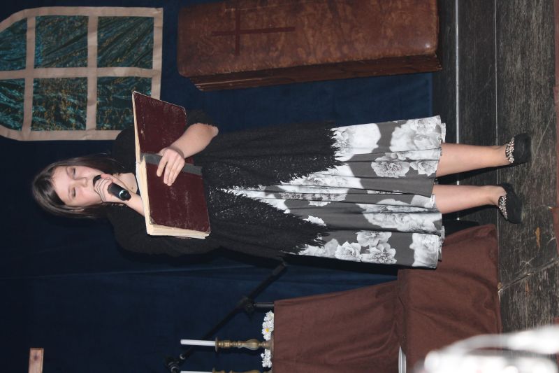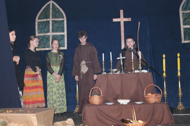 Sztukę rozpoczęła Pasterka (Aleksandra Namysł), która wprowadziła widownię w tematykę dzieła i opowiedziała o pogańskim obrzędzie - dziadów, polegającym na wywoływaniu duchów zmarłych przodków i zaspokajaniu ich pośmiertnych potrzeb. Później na scenie pojawili się Guślarz (Jan Wnęk), Starzec (Adrian Pancerz) oraz Chór (Patrycja Iwanicka, Bartłomiej Kołeczek, Maja Lechwar, Paulina Merkwa, Wiktor Michalec i Aleksandra Namysł). Przewodniczący obrzędowi Guślarz przyzywał niespokojne dusze i pytał jak może zaspokoić ich pragnienia. W zamian za pomoc duchy udzielały zebranym w kaplicy porad i pouczały ich jak żyć, aby dostąpić szczęścia po śmierci.