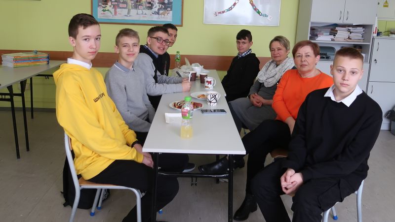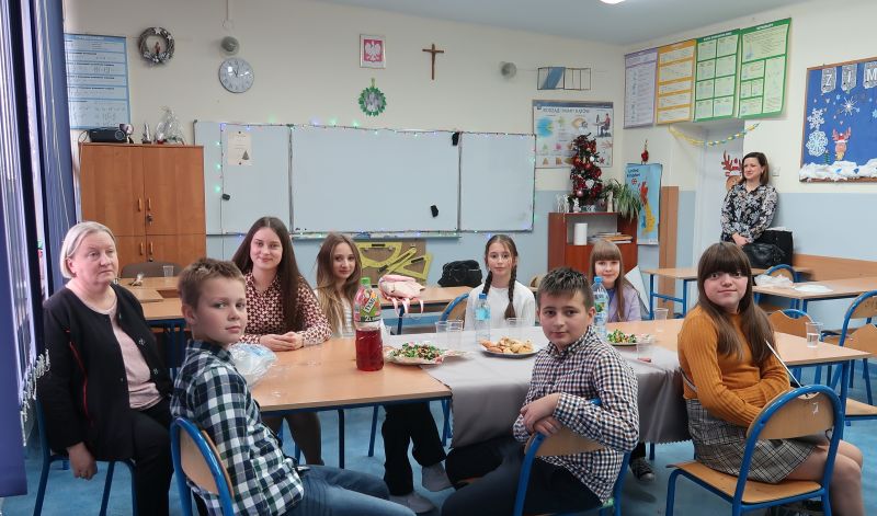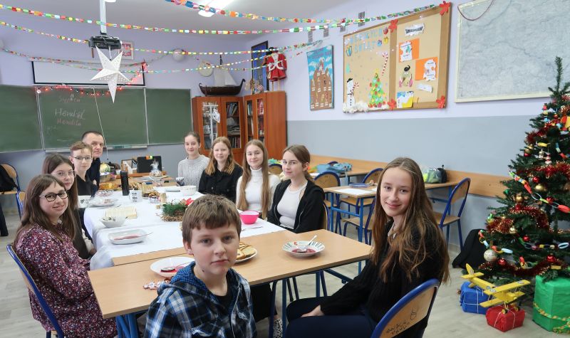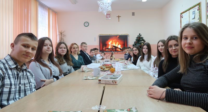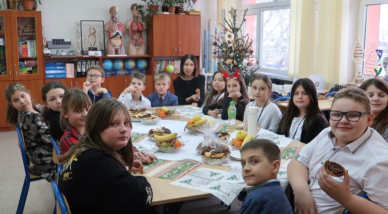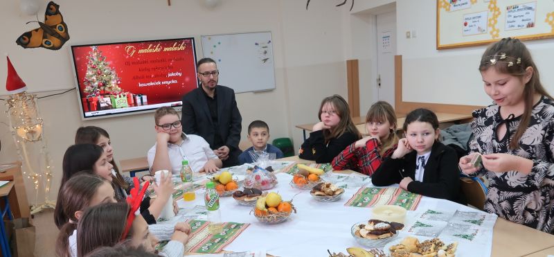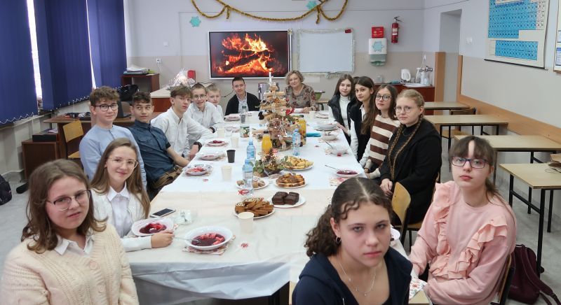 Po części artystycznej i ciepłych życzeniach uczniowie wraz z wychowawcami udali się na wigilie do swoich klas. W odświętnych strojach, bardzo podekscytowani, zasiedli do wigilijnego stołu. Były życzenia, barszcz z uszkami, ciasteczka oraz wspólne kolędowanie.