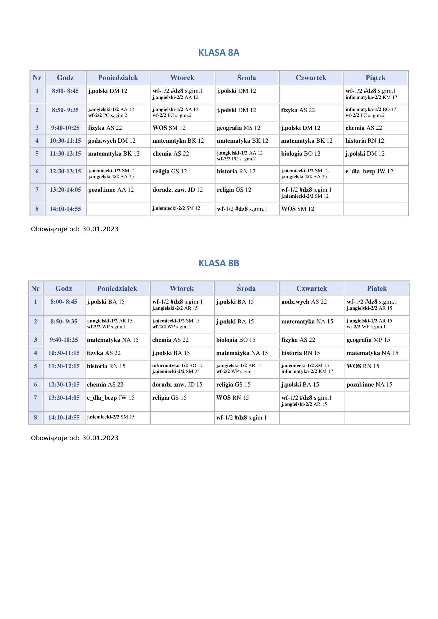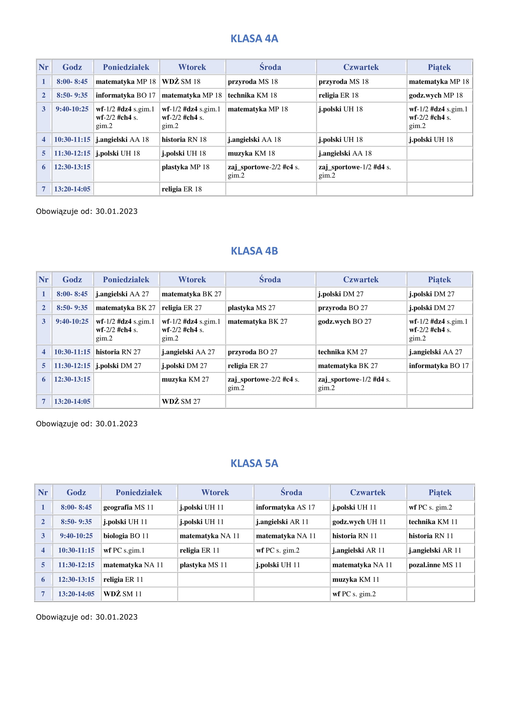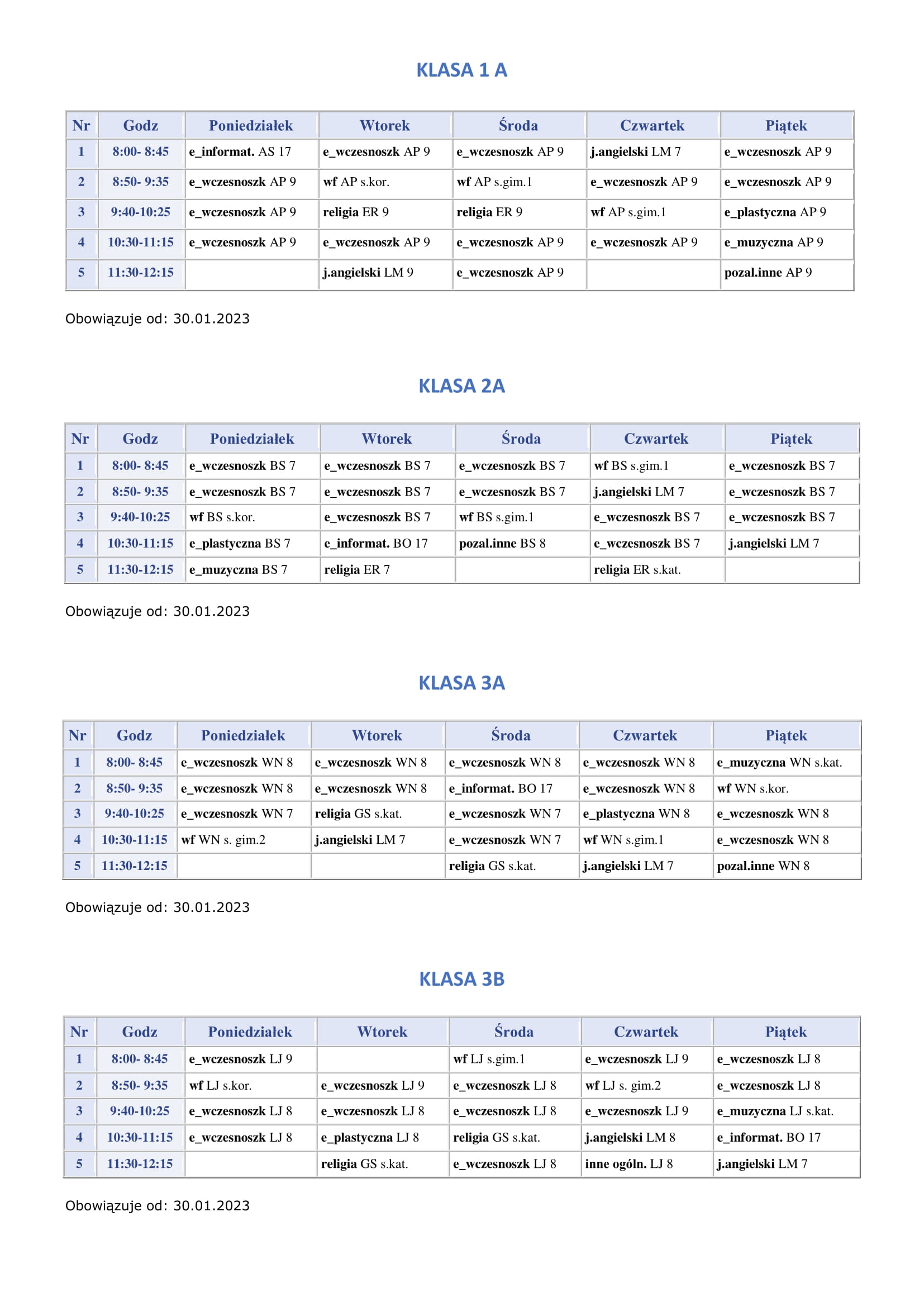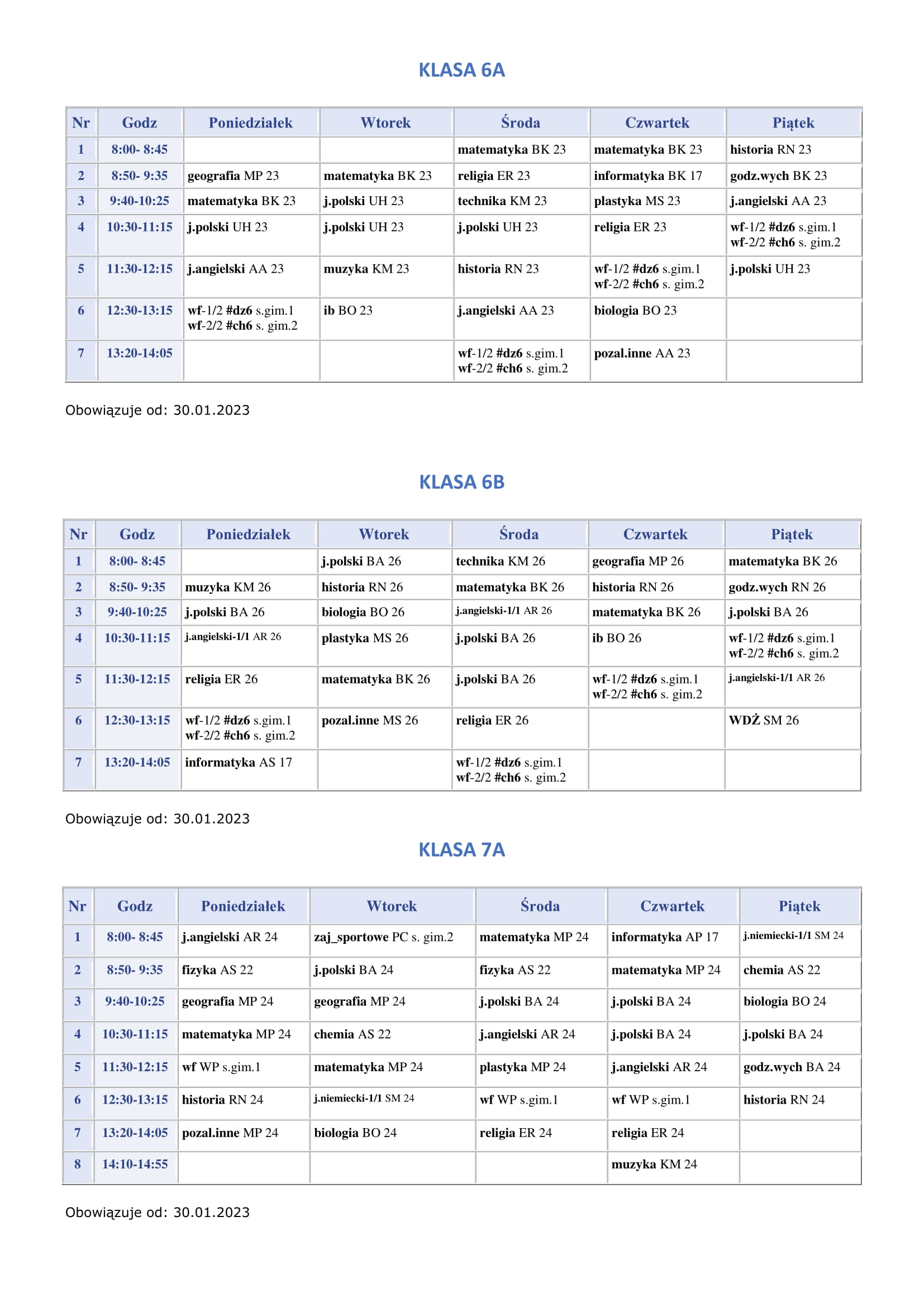 Plan lekcji obowiązujący od 30.01.2023r.