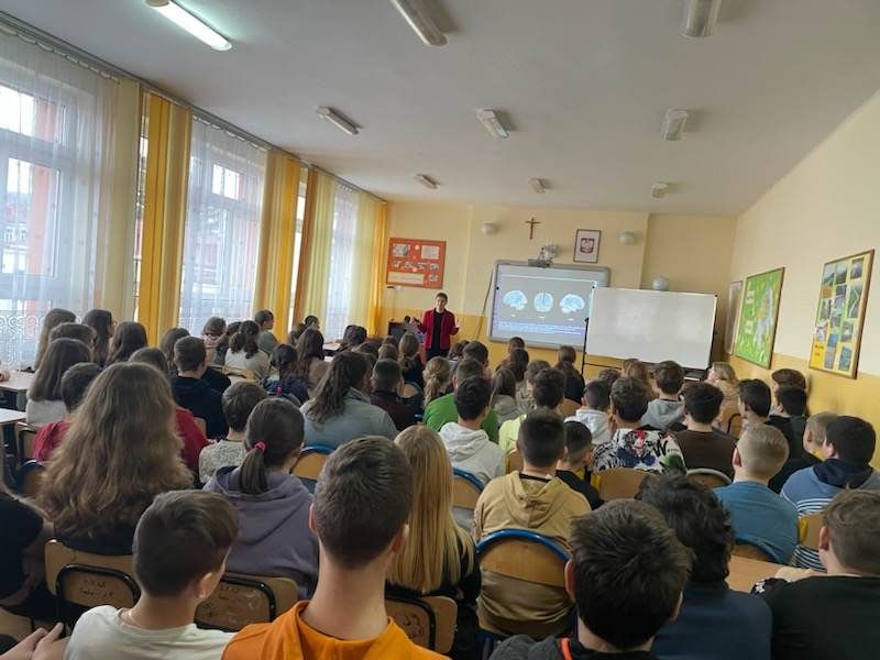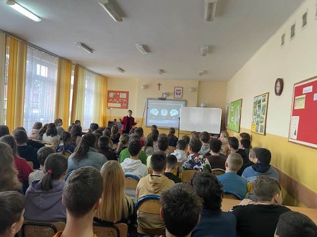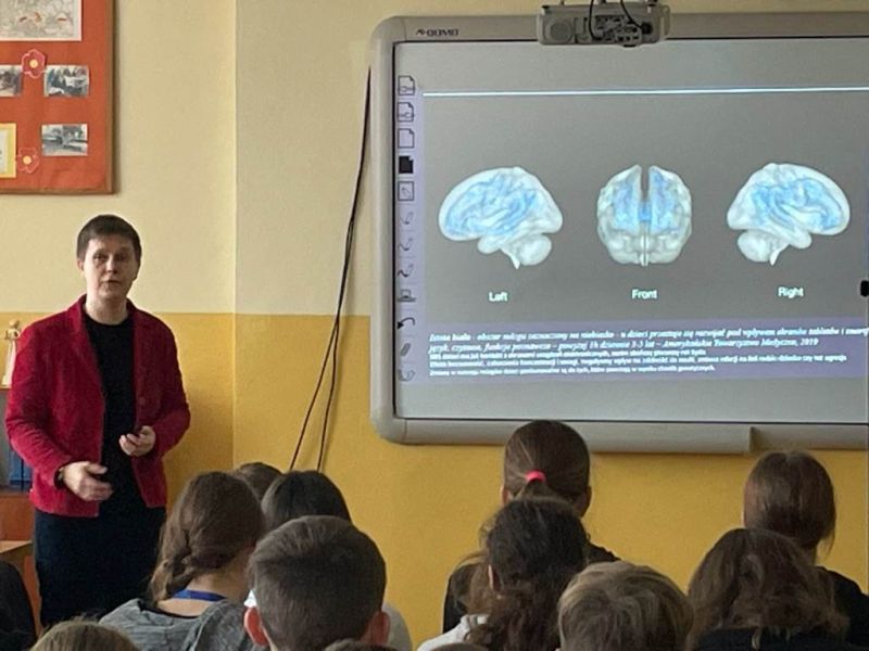 W dniu 1 lutego 2023 roku uczniowie klas VI, VII i VIII wzięli udział w spotkaniu pt. „Smartfon pod lupą” prowadzonym przez panią dr hab. Moniką Przybysz profesorem nadzwyczajnym UKSW. Podczas spotkania poruszono temat niekorzystnego wpływu Instagrama, Facebooka, Tik – Toka i związane z tym problemy ze snem, agresją, impulsywnością oraz prawidłowym postrzeganiem własnego ciała. Pani dr uświadomiła młodzieży jakie konsekwencje niesie ze sobą ciągłe korzystanie z urządzeń elektronicznych. Młodzież narażona jest wówczas na wady postawy, rozdrażnienie i nerwowość, brak koncentracji uwagi. Do tego pojawiają się problemy w naturalnej komunikacji werbalnej a w konsekwencji lęk i nieumiejętność nawiązywania relacji. Prowadząca spotkanie zwróciła również uwagę na niepokojący wzrost samookaleczania się i prób samobójczych. Starała się również wskazać alternatywne sposoby spędzania wolnego czasu z dala od mediów społecznościowych i zachęciła młodzież do uprawiania sportów, bowiem są one naturalnym sposobem uwalniania napięcia i stresu.
