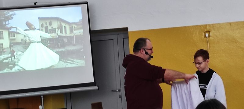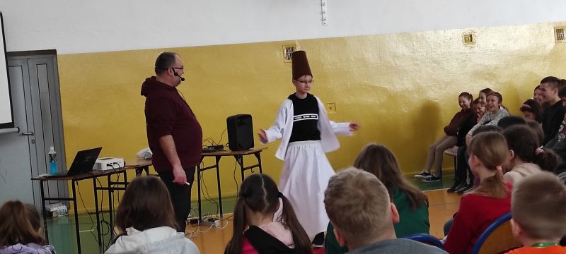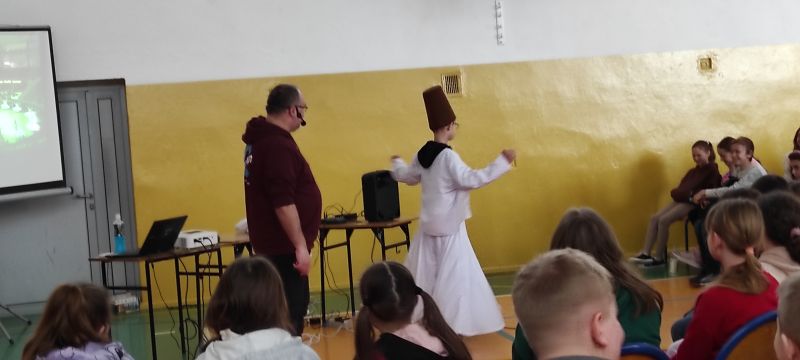 Dzisiaj (7 lutego 2023) w naszej szkole gościł Podróżnik – przedstawiciel firmy Trzask z Gorlic. Zaprezentował naszym uczniom zdjęcia z podróży do Turcji. Przedstawił ciekawostki z historii starożytnej jak i życia codziennego mieszkańców Turcji. Uczniowie usłyszeli też oryginalne brzmienie języka tureckiego i muzyki. Na zdjęciach widać było starożytny Efez, Hierapolis, Myrę. Pan Darek udał się też do Kapadocji - prezentował krajobrazy wulkaniczne i niebo usiane balonami pełnymi turystów podziwiających krainę z góry. Na koniec zaprezentowano film z tańcem derwiszów. Pokazano też tradycyjny strój do tegoż tańca. Pokaz bardzo się podobał. Czekamy na kolejny – z Kalifornii i Meksyku.