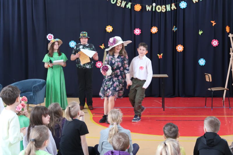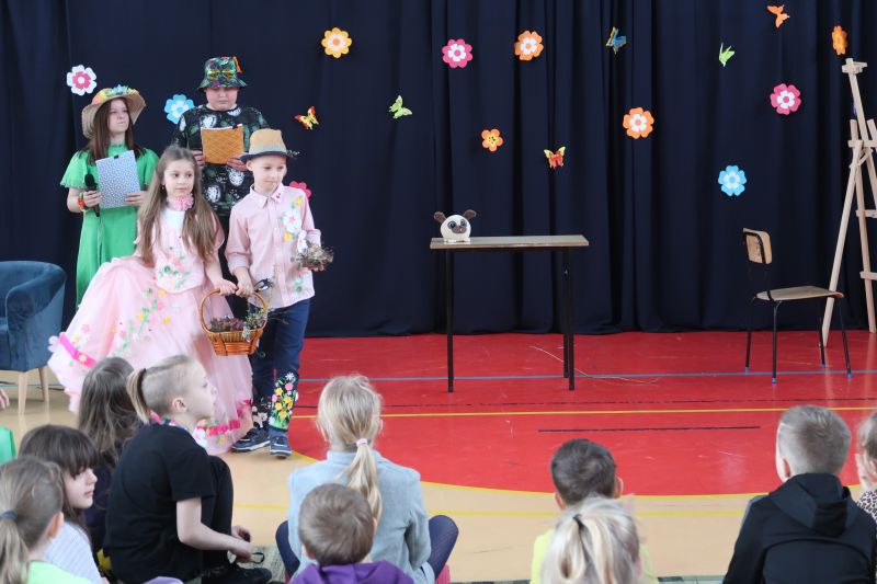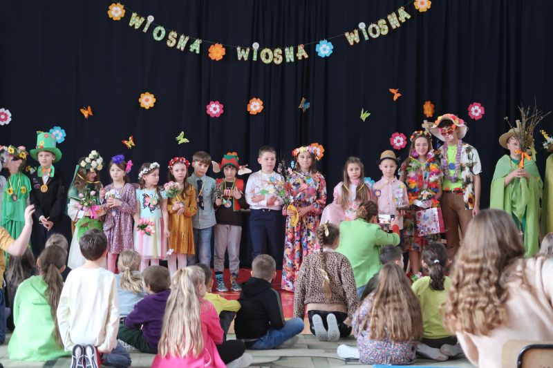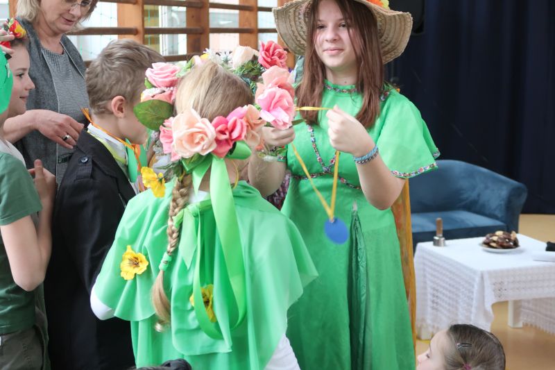 Goście obejrzeli również inscenizację wybranych bajek I.Krasickiego, które przygotowane zostało przez uczniów Szkolnego Koła Teatralnego. Następnie odbyły się klasowe pokazy mody wiosennej, w którym to pokazie wzięli udział również nasi goście. Wszyscy uczestnicy zostali nagrodzeni gromkimi brawami i otrzymali pamiątkowe medale oraz dyplomy. Na koniec cała społeczność szkolna zebrana na sali gimnastycznej zatańczyła wspólnie belgijkę. Dziękujemy za przyjęcie zaproszenia i przybycie, uczniom i opiekunom SOSW i wspólne świętowanie tego wyjątkowego dnia, mając nadzieję na kontynuację współpracy.