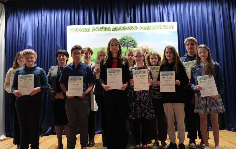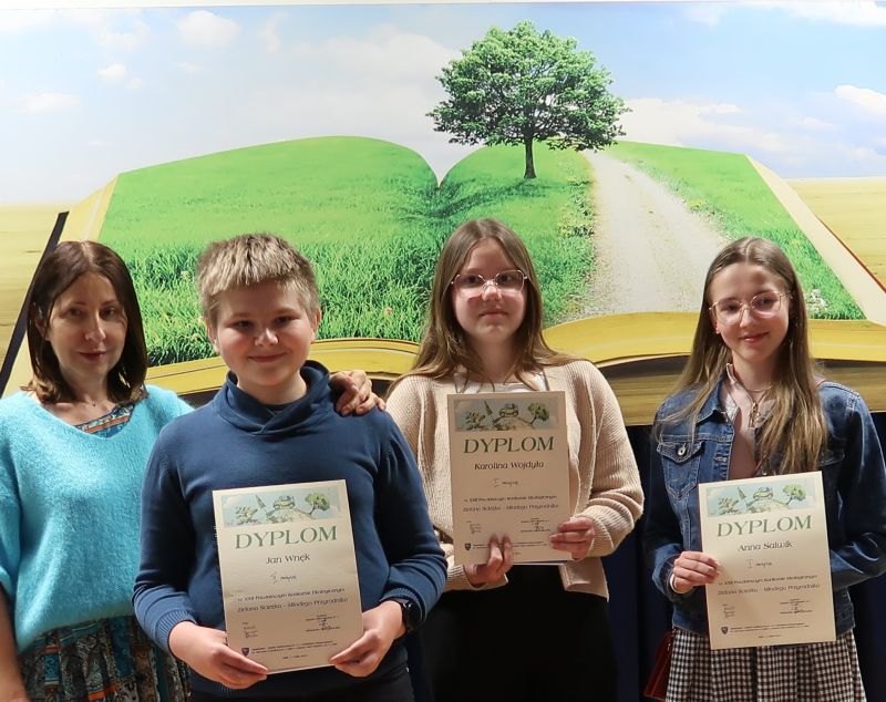 11 maja 2023 r. w Szkole Podstawowej Nr 12 z Oddziałami Integracyjnymi w Jaśle odbył się XXII Powiatowy Konkurs Ekologiczny „Zielona Ścieżka Młodego Przyrodnika”. Naszą szkołę reprezentowało w tym konkursie trzech uczniów, którzy wykazali się imponującą wiedzą z zakresu ekologii i ochrony środowiska. Uczniowie pracowali indywidualnie rozwiązując test składający się z 50 zadań oraz rozpoznawali na slajdach gatunki drzew liściastych i iglastych. ANNA SALWIK– uczennica klasy 8b oraz KAROLINA WOJDYŁA – uczennica klasy 8a uzyskały najwyższą liczbę punktów i zajęły ex aequo I miejsce, natomiast JAN WNĘK – uczeń klasy 8a zajął miejsce II. Laureaci konkursu otrzymali, z rąk Pani Dyrektor Aleksandry Zajdel-Kijowskiej, nagrody rzeczowe i pamiątkowe dyplomy.