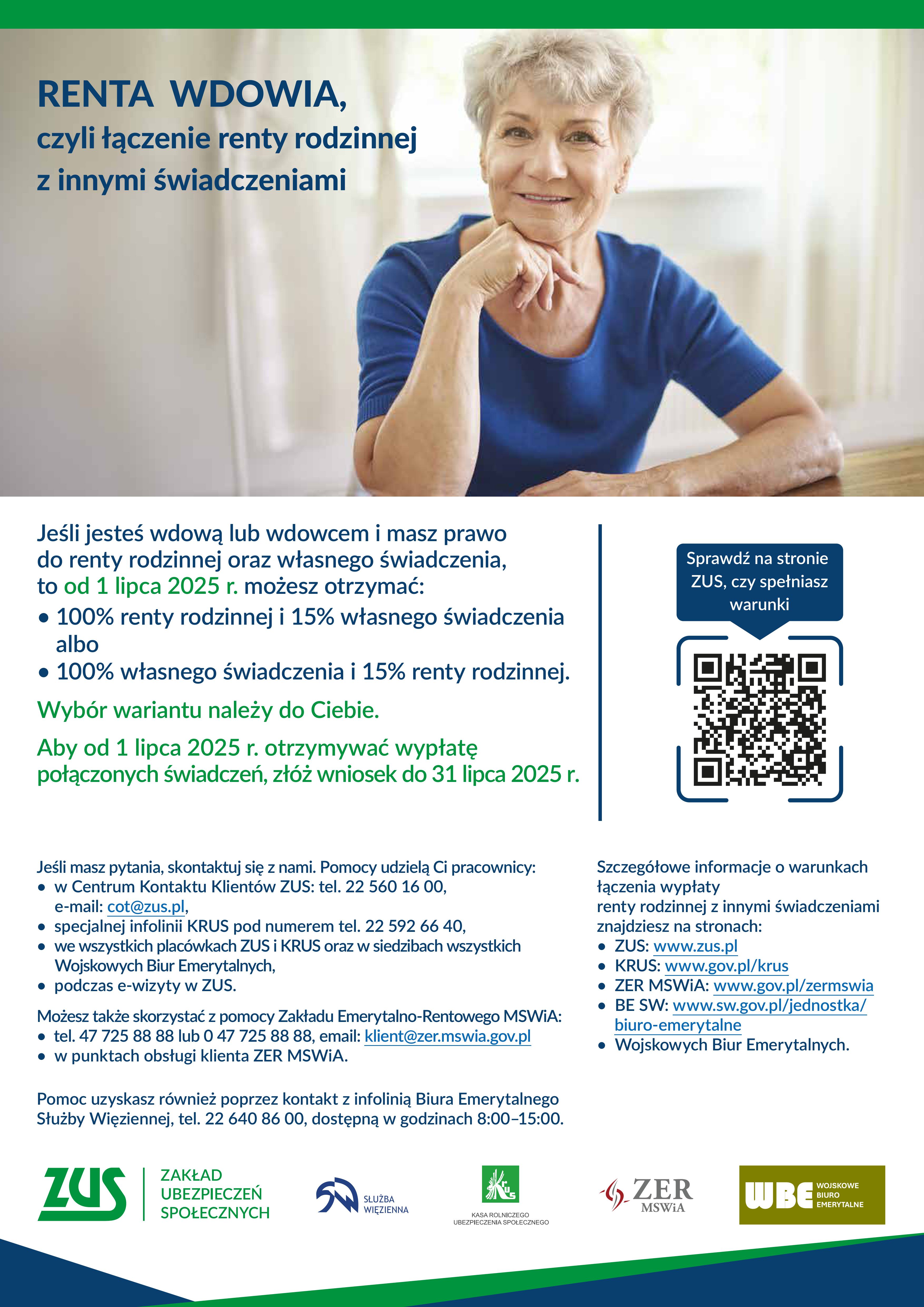 Uprawnione wdowy oraz uprawnieni wdowcy, którzy mają prawo do renty rodzinnej oraz własnego świadczenia (np. emerytury), od 1 lipca 2025 r. mogą otrzymać:
