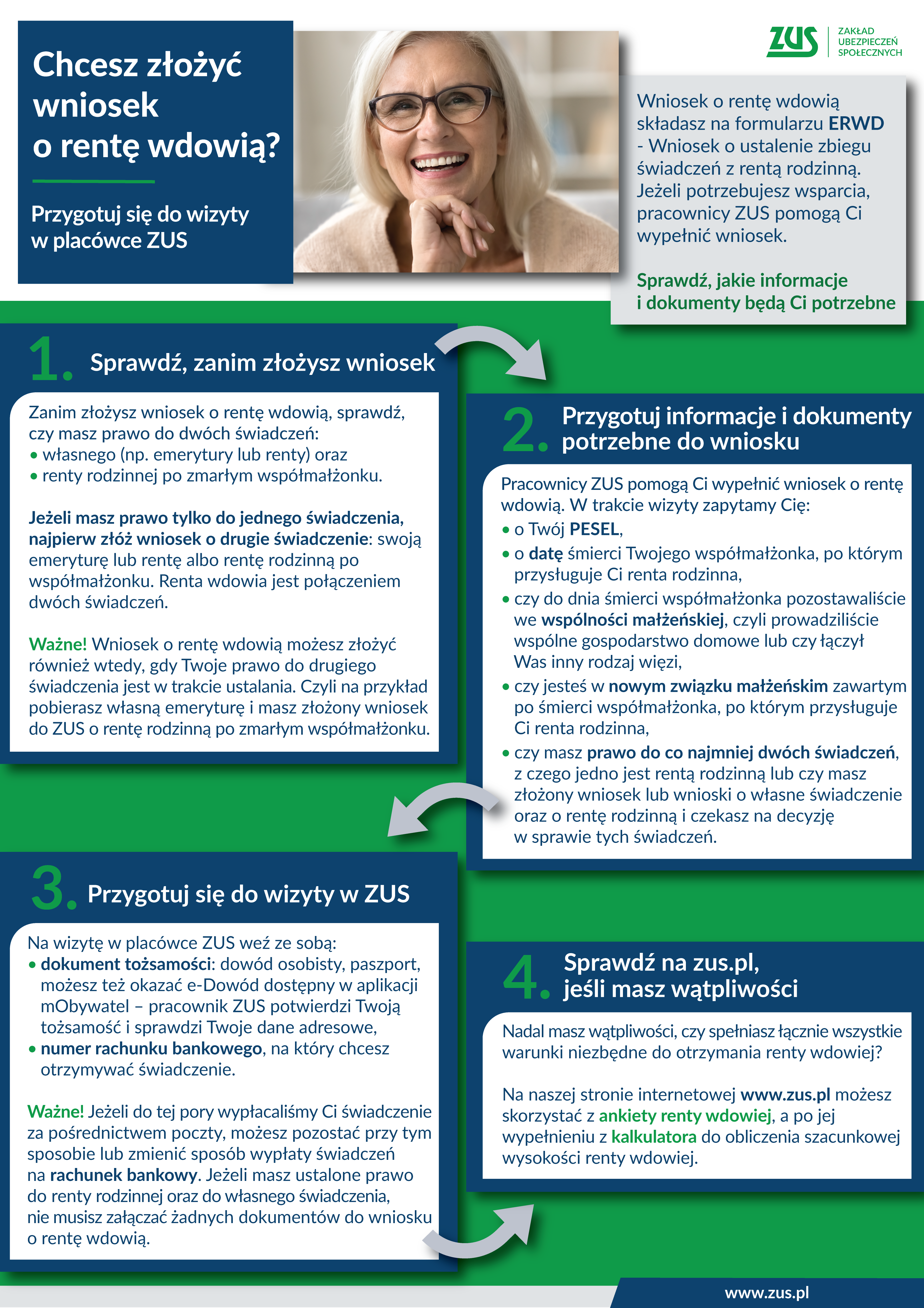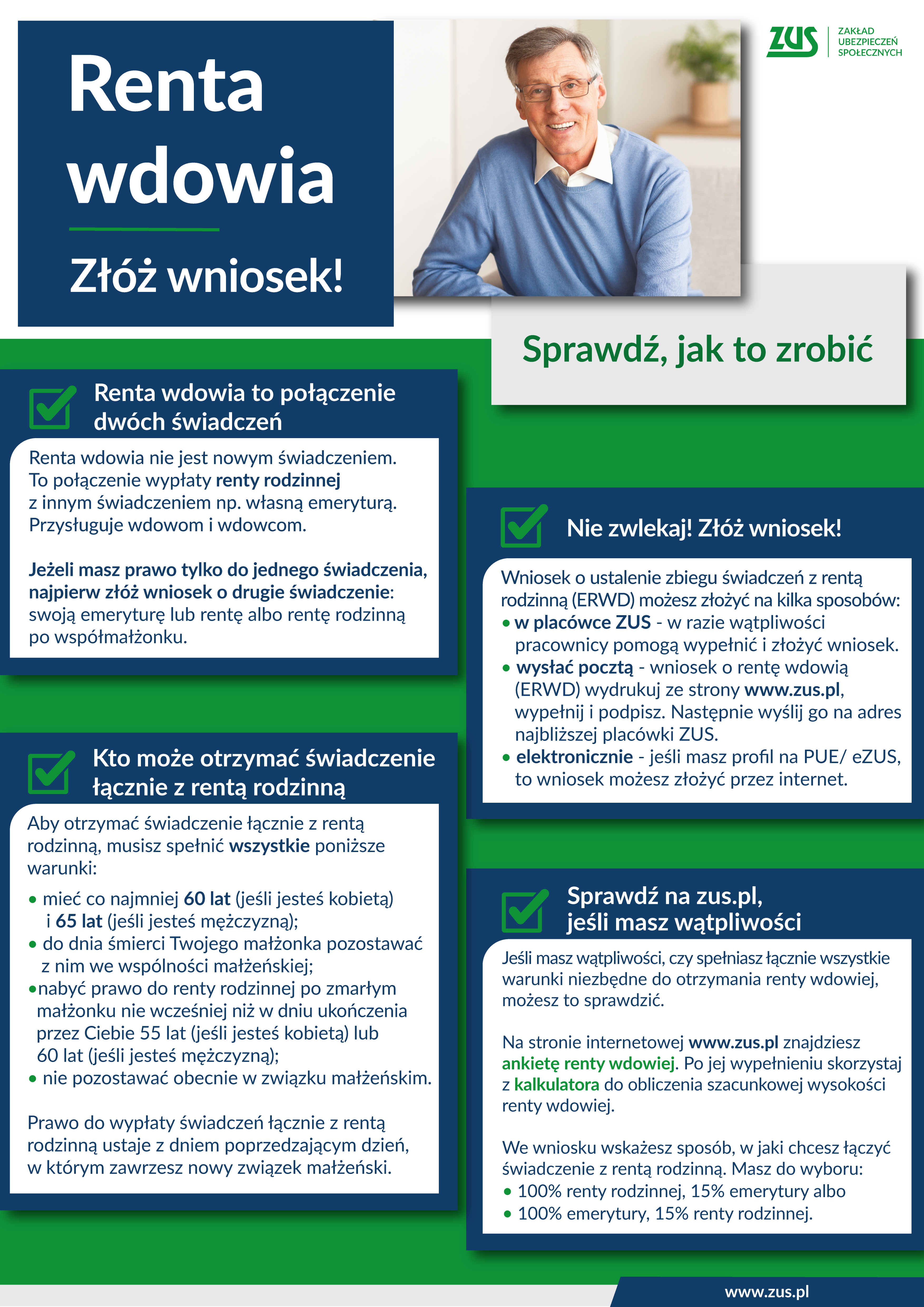 Na stronie internetowej ZUS dostępna jest specjalna ankieta – test uprawnień dotyczący łączenia świadczeń z rentą rodzinną. Dzięki niej, krok po kroku, można sprawdzić czy spełnia się warunki, aby skorzystać z renty wdowiej. Ankieta ta jest połączona z kalkulatorem do wyliczenia szacunkowej kwoty połączonych świadczeń.
