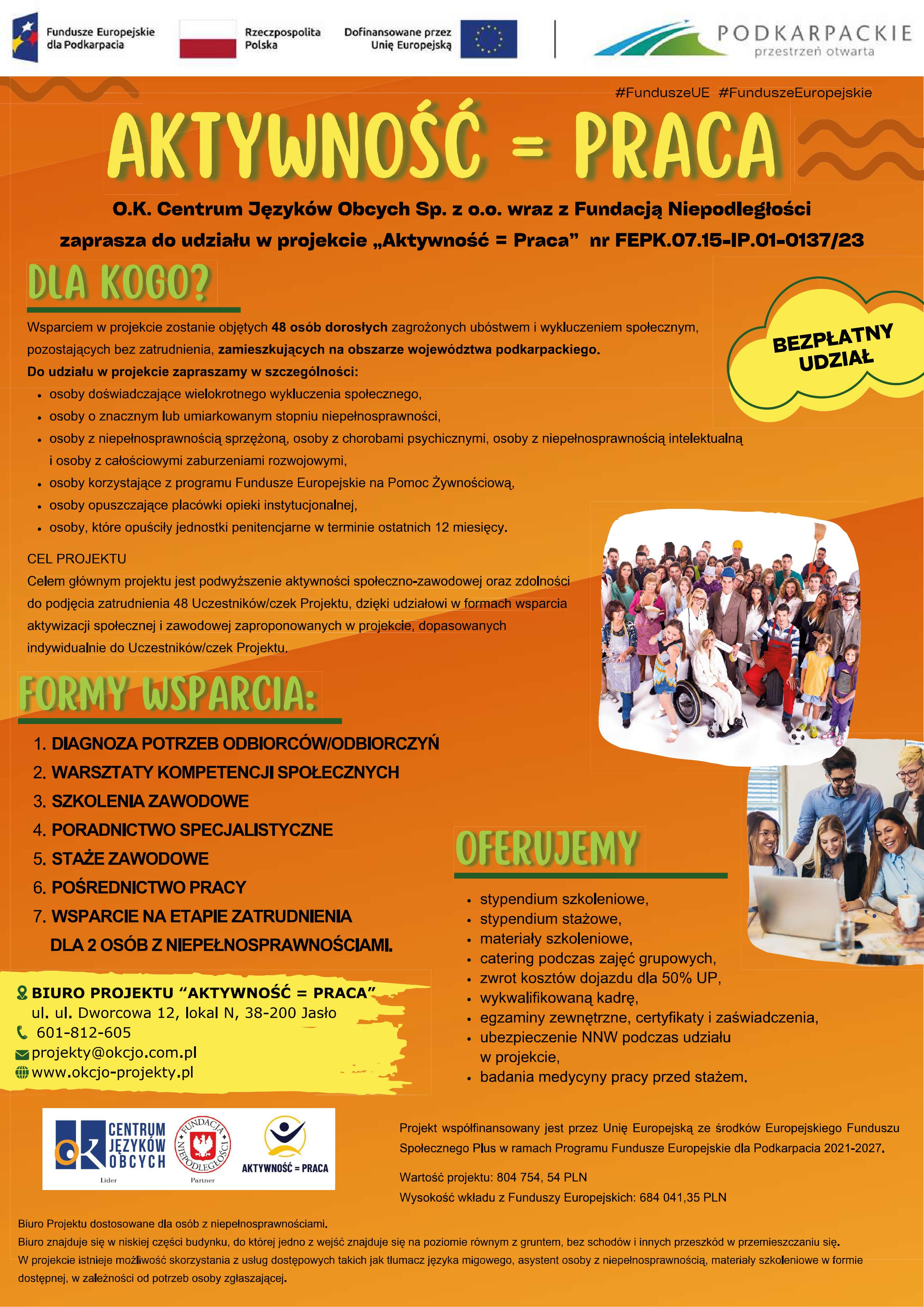 Wsparciem w projekcie zostanie objętych 48 osób dorosłych zagrożonych ubóstwem i wykluczeniem społecznym, pozostających bez zatrudnienia, zamieszkujących na obszarze województwa podkarpackiego.