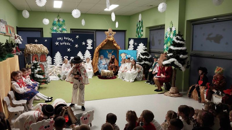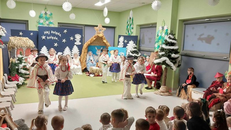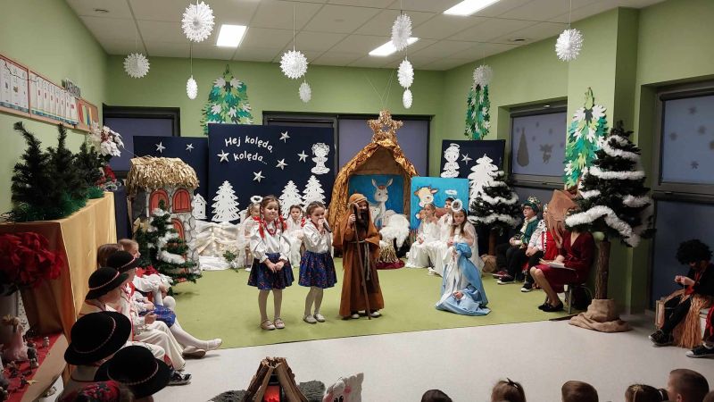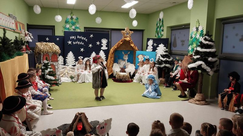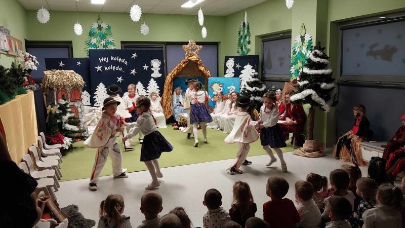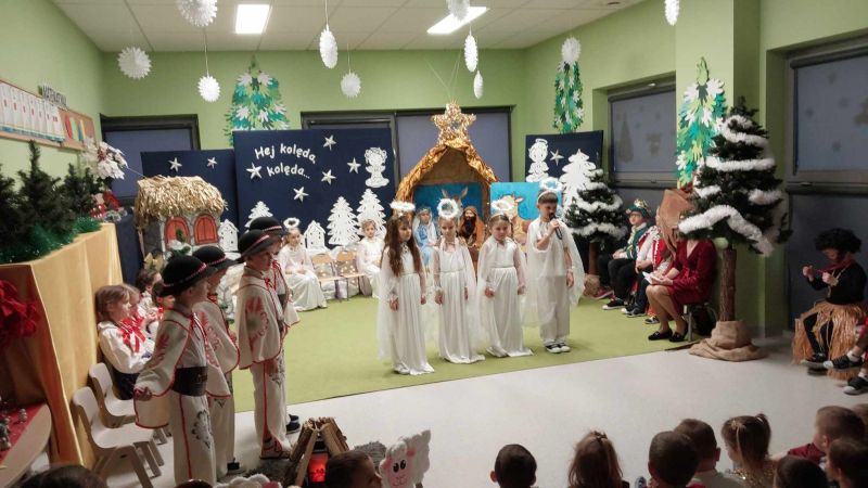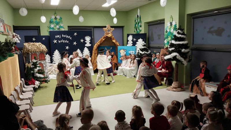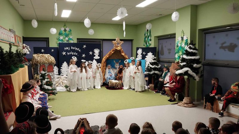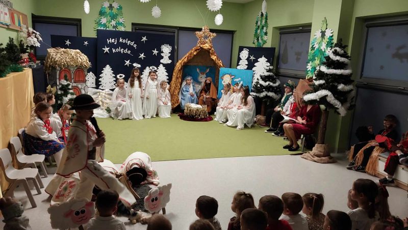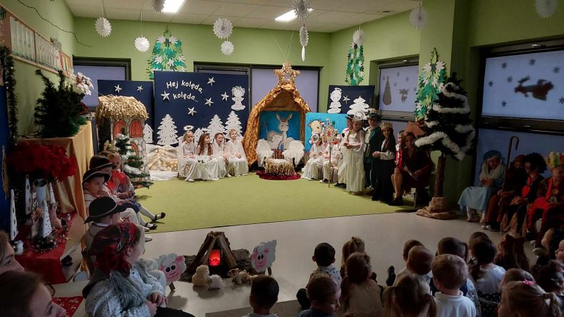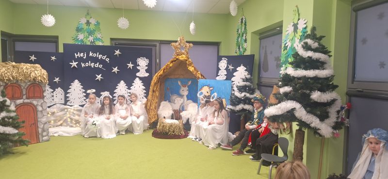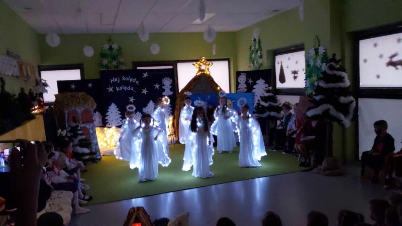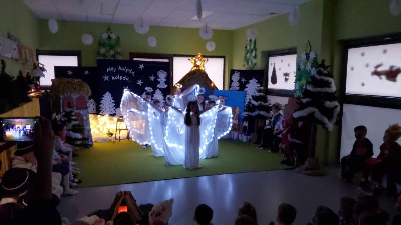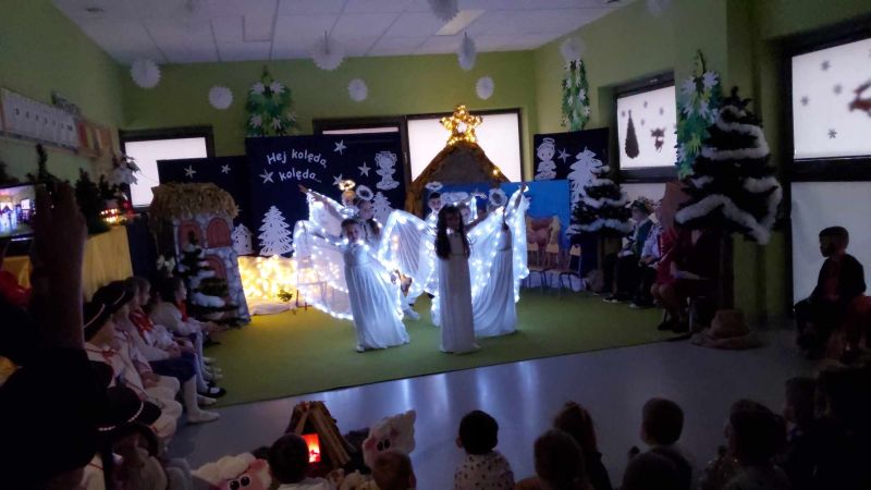 Dzieci zaprezentowały całej przedszkolnej społeczności, przygotowywaną od kilku tygodni opowieść o narodzinach Dzieciątka Jezus, oprawioną wieloma kolędami i pastorałkami. Piękna scenografia nawiązująca do Betlejem oraz stroje przedszkolaków były idealnym dopełnieniem całego przedstawienia.