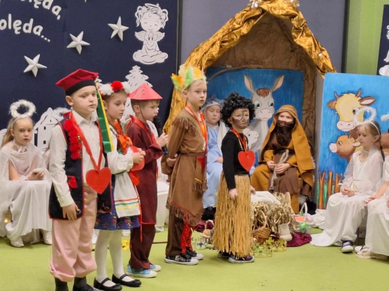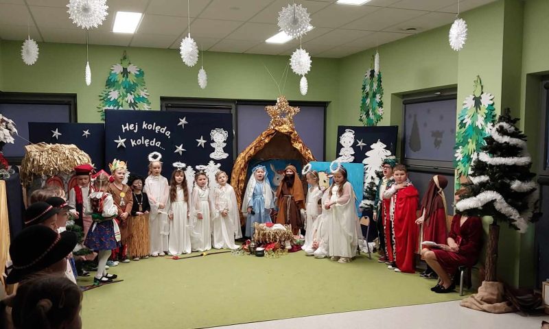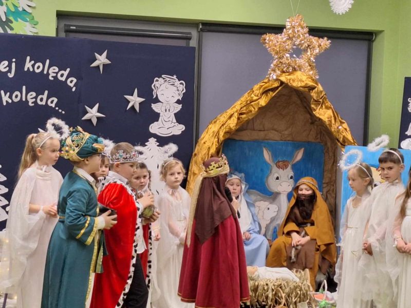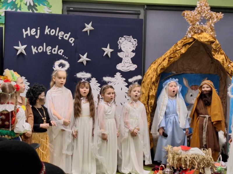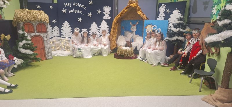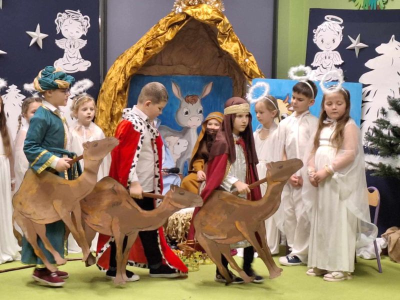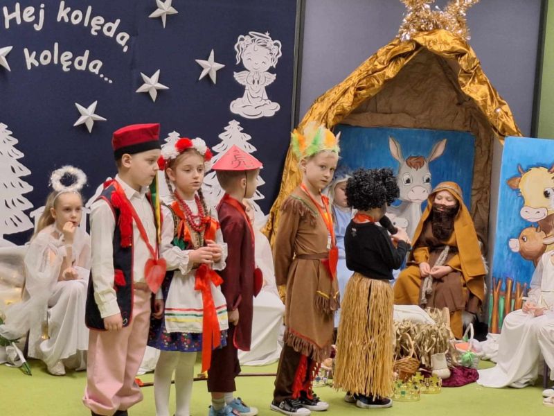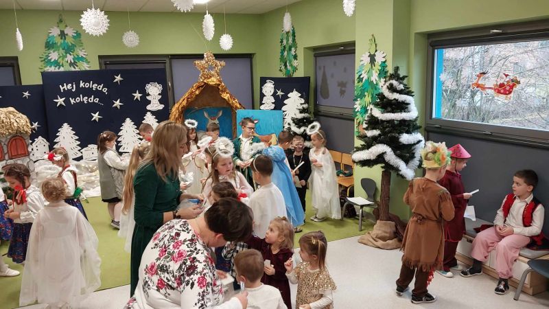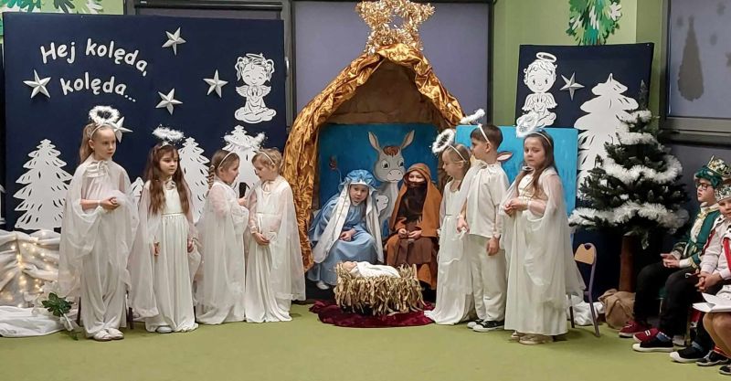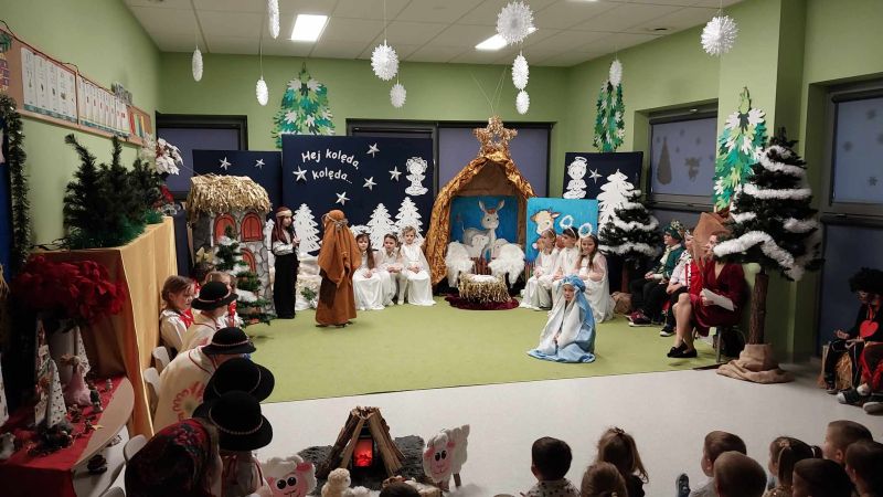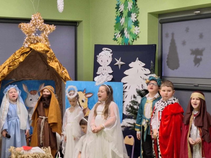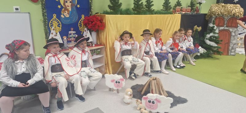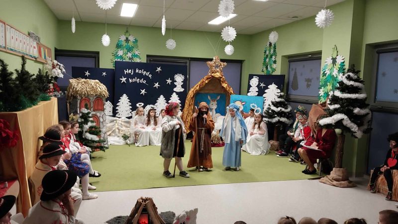 Dzieci zaprezentowały całej przedszkolnej społeczności, przygotowywaną od kilku tygodni opowieść o narodzinach Dzieciątka Jezus, oprawioną wieloma kolędami i pastorałkami. Piękna scenografia nawiązująca do Betlejem oraz stroje przedszkolaków były idealnym dopełnieniem całego przedstawienia.