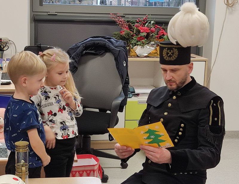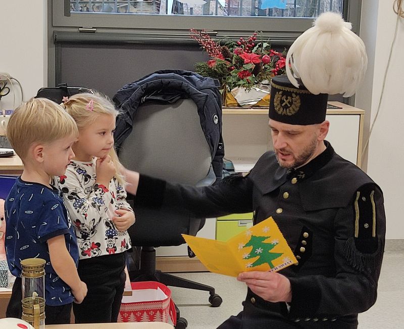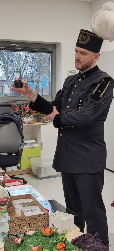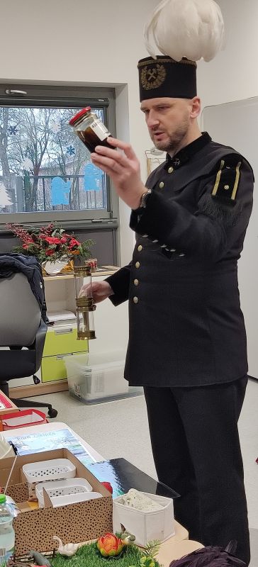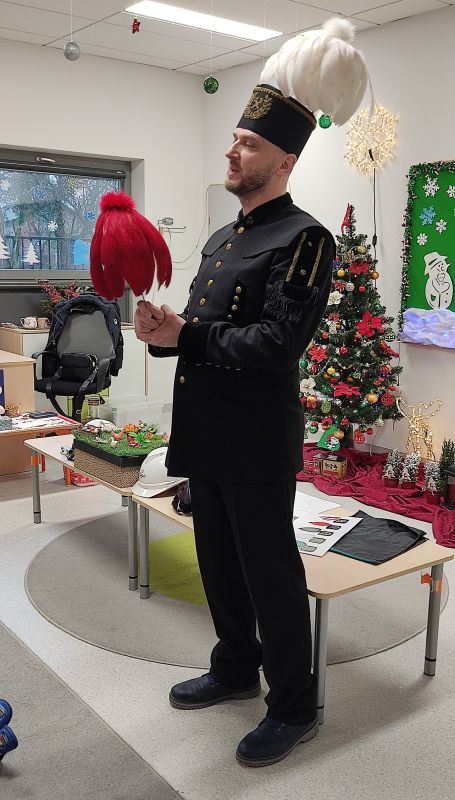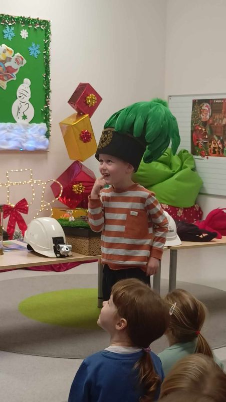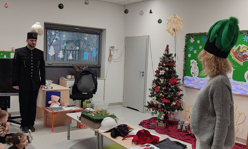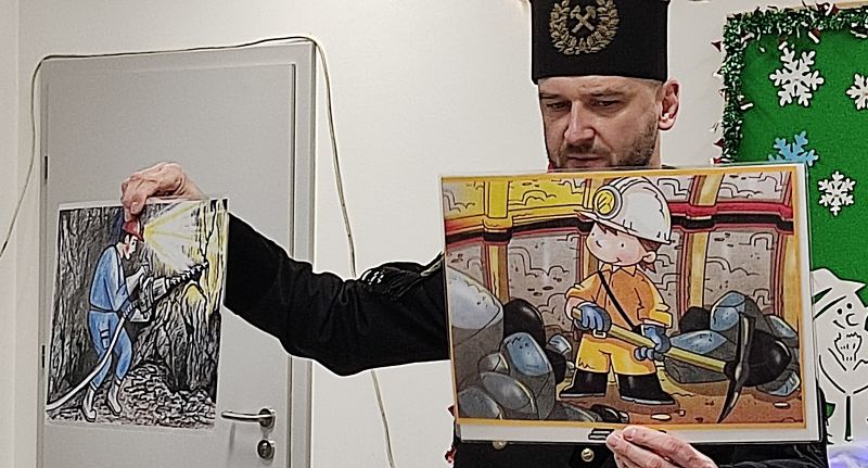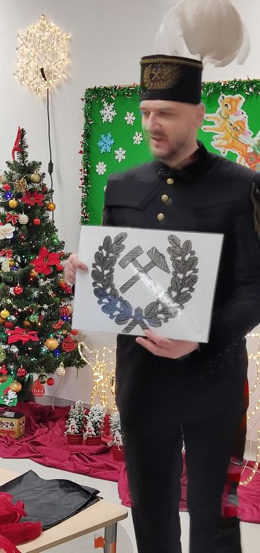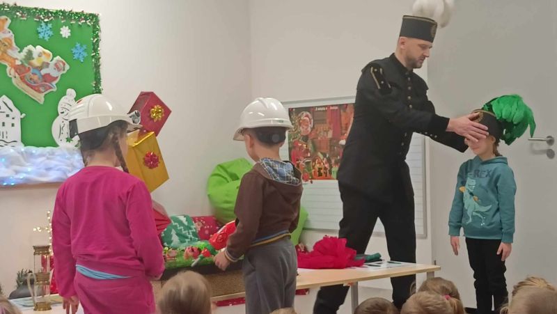 12 grudnia w naszym przedszkolu gościliśmy górnika. Nasz gość przybyły ubrany w odświętny strój, zapoznał dzieci z symbolami górniczymi, opowiadał o pracy górników, o tym co otrzymaliśmy dzięki wydobyciu węgla oraz o patronce wszystkich górników - Świętej Barbarze. Dzieci korzystają z możliwości przymierzenia czapki górniczej - czako.