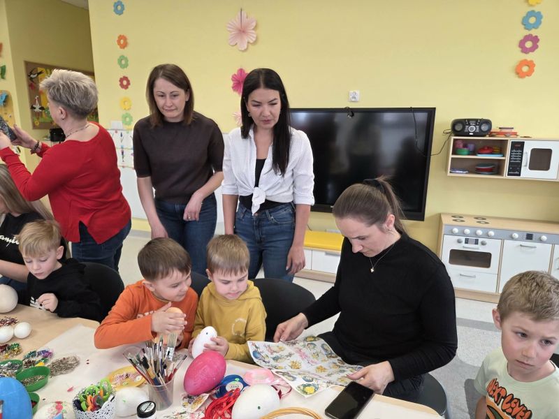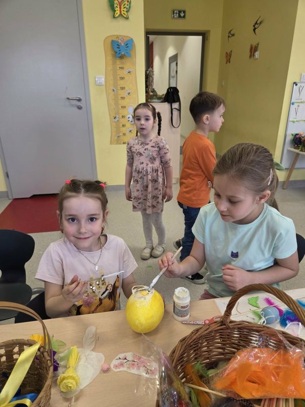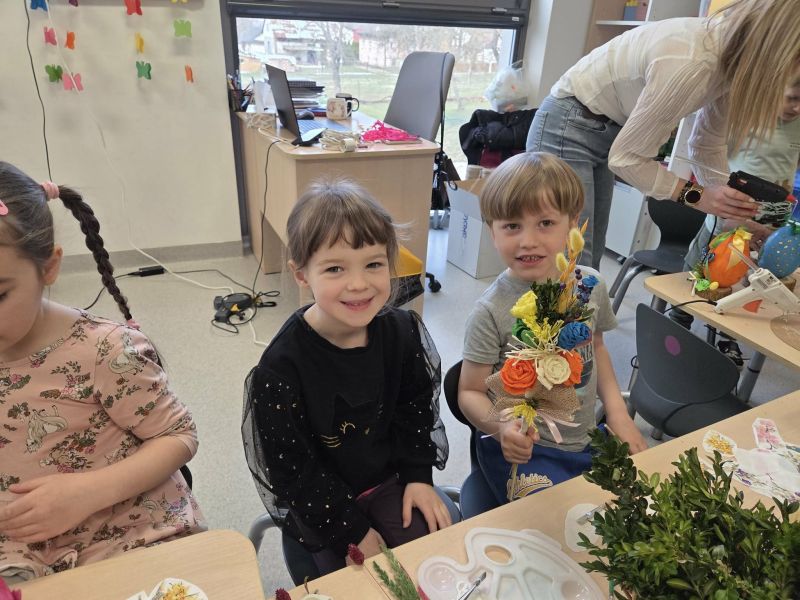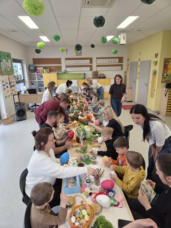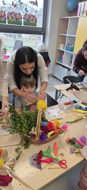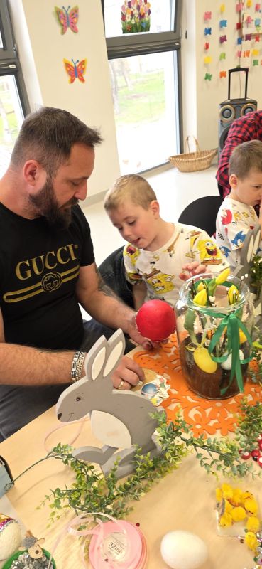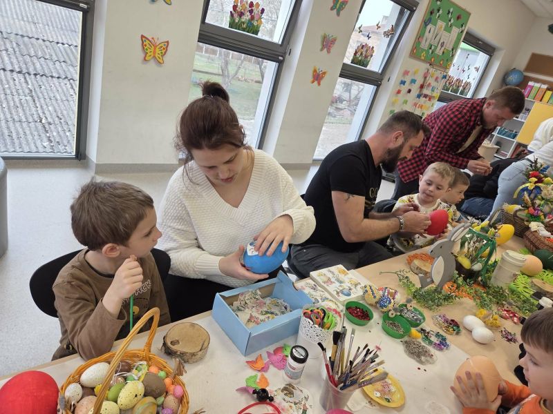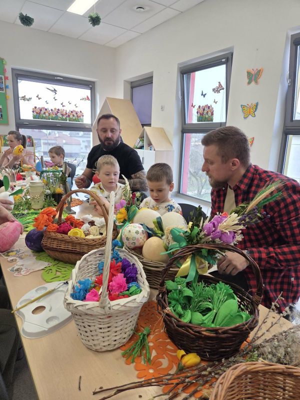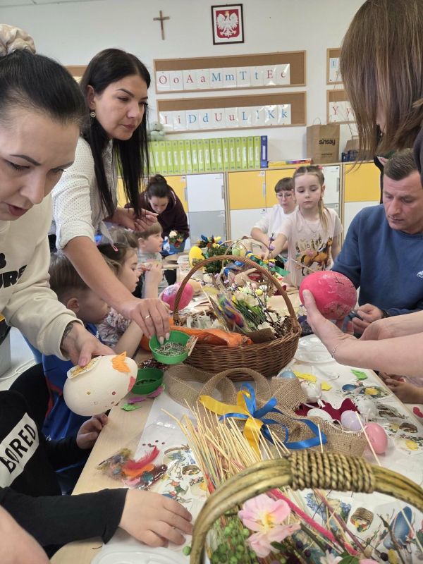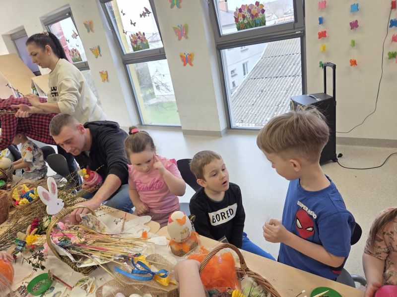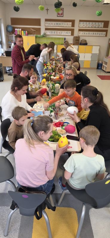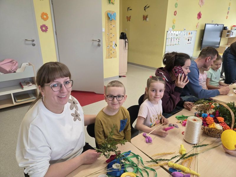 Podczas spotkania dzieci wraz z rodzicami tworzyli wielkanocne dekoracje - barwne pisanki, wesołe zajączki i kolorowe palmy.